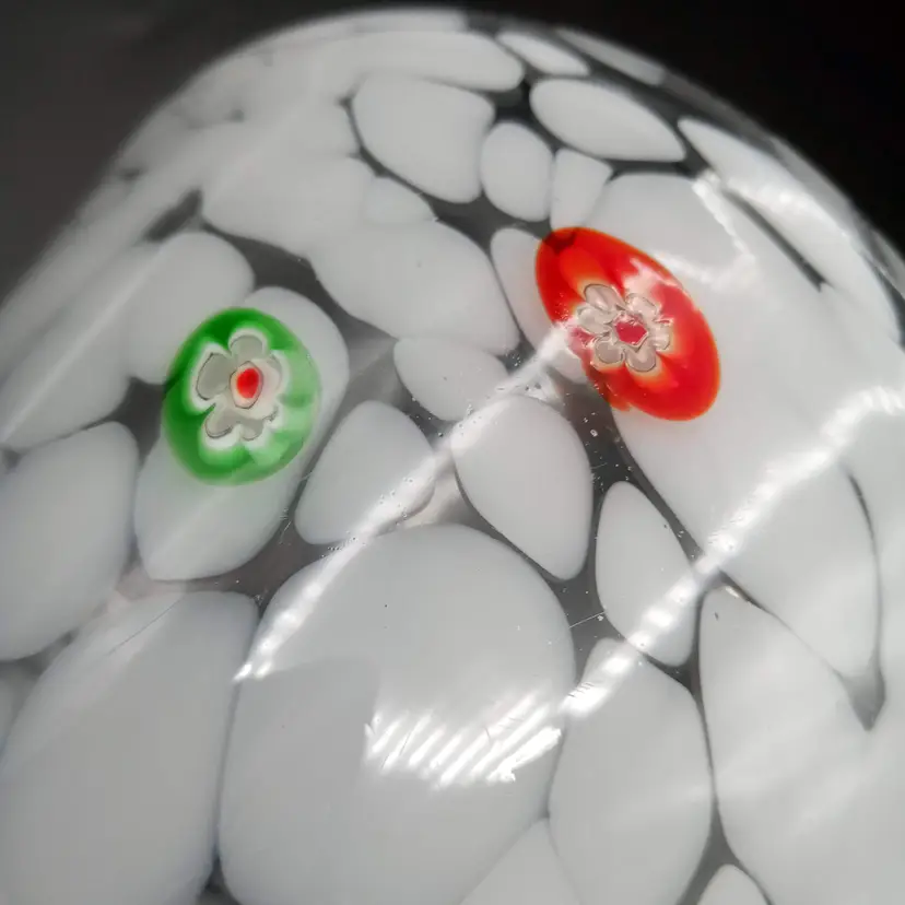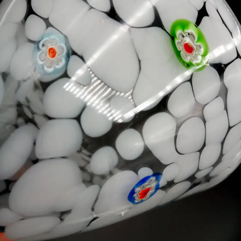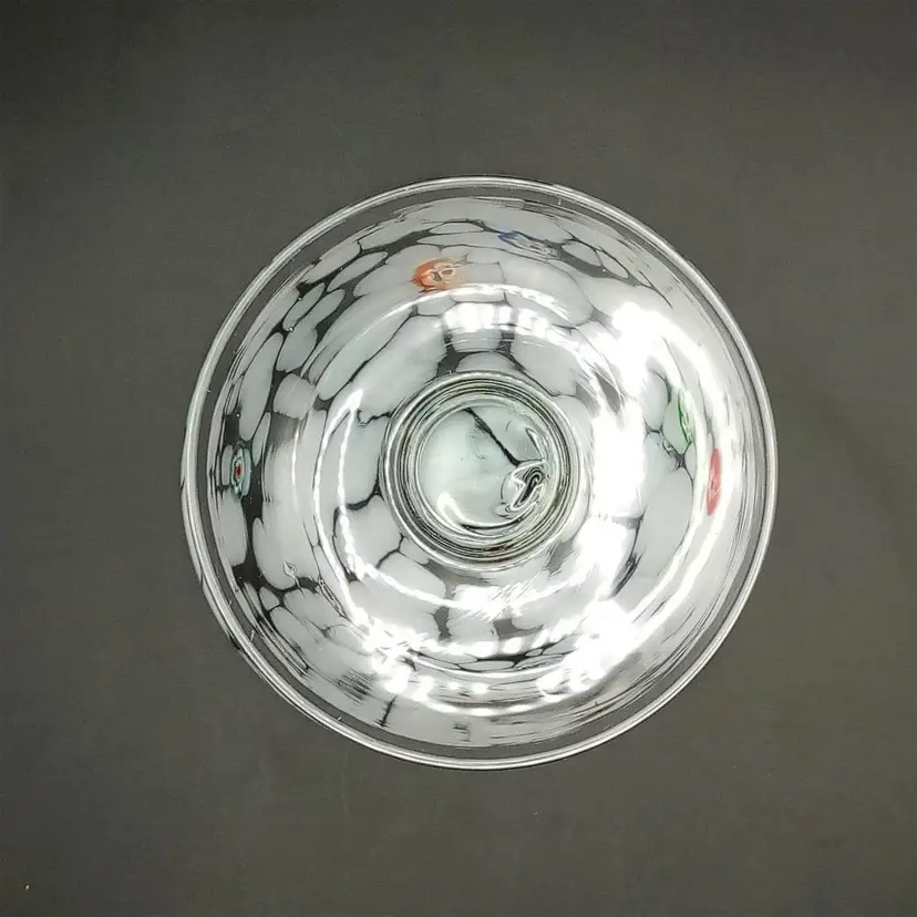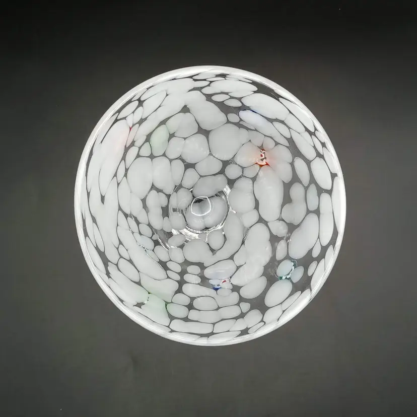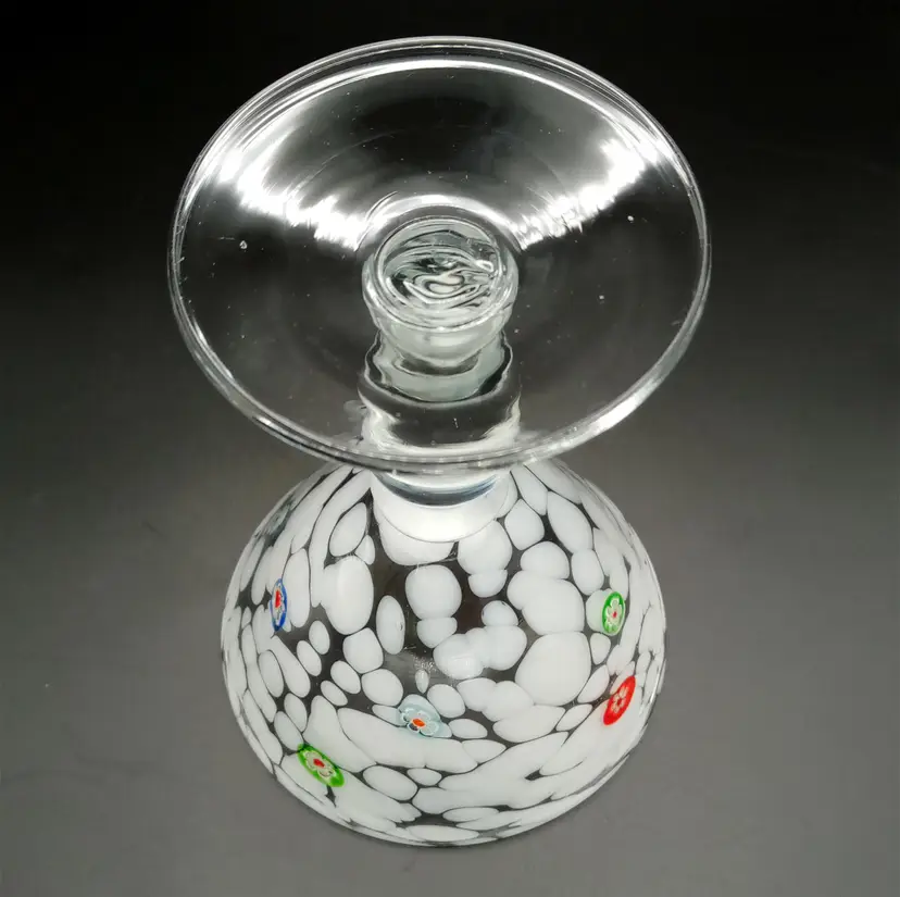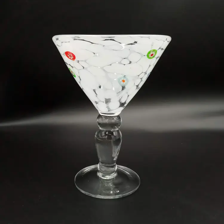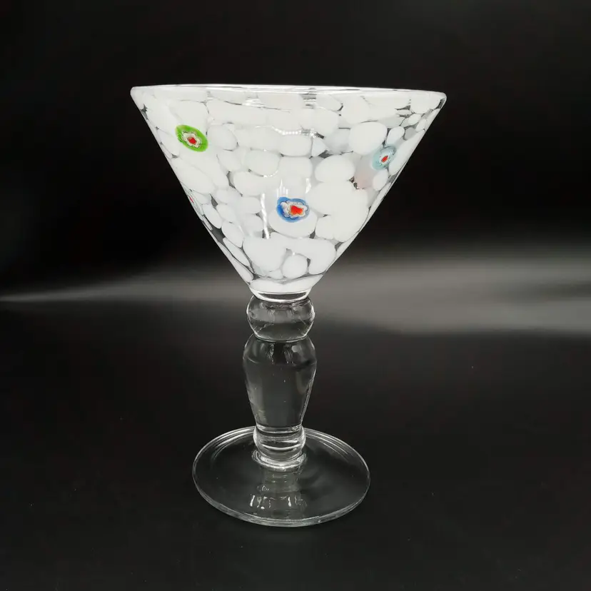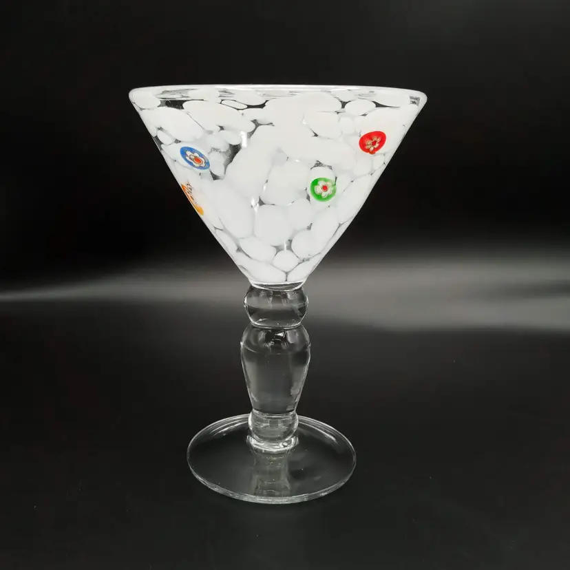 This handblown martini glass is 6.5" in height and almost 5" across at the mouth. It's made of white and clear glass with applied millefiori. It is unmarked but I did find one just like it online with an Amici sticker. Thanks for looking!