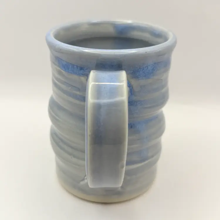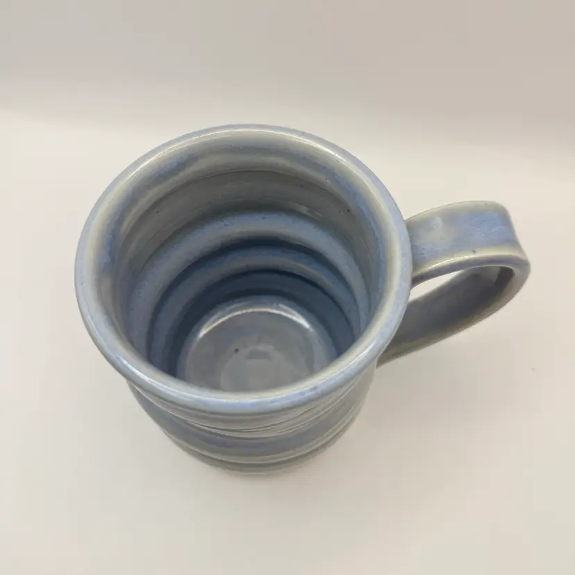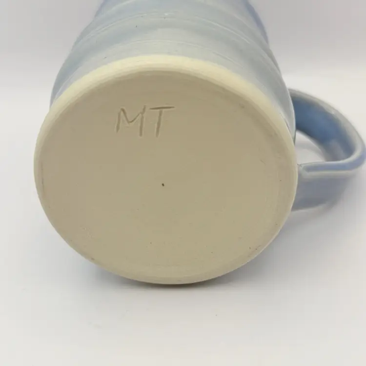 Light Blue glazed pottery coffee mug with potters initials No chips or cracks 13 oz.