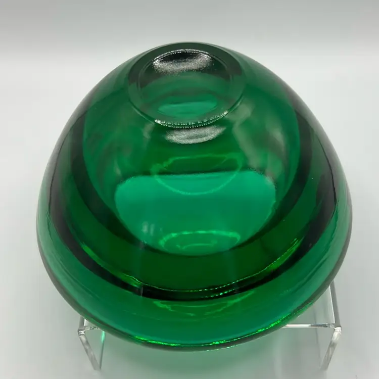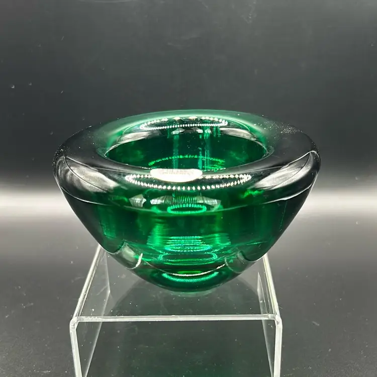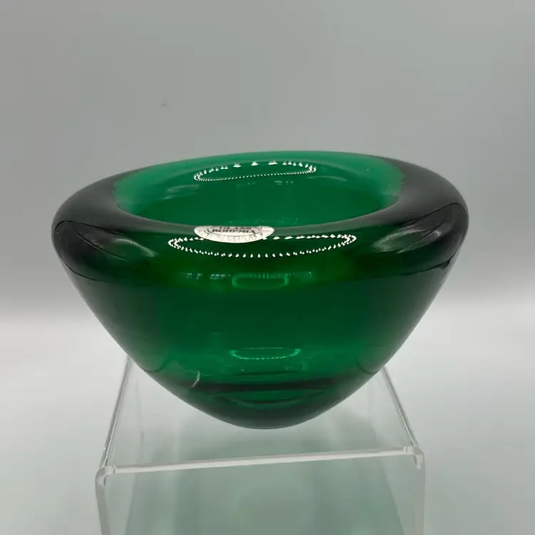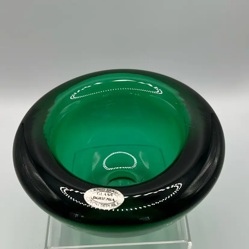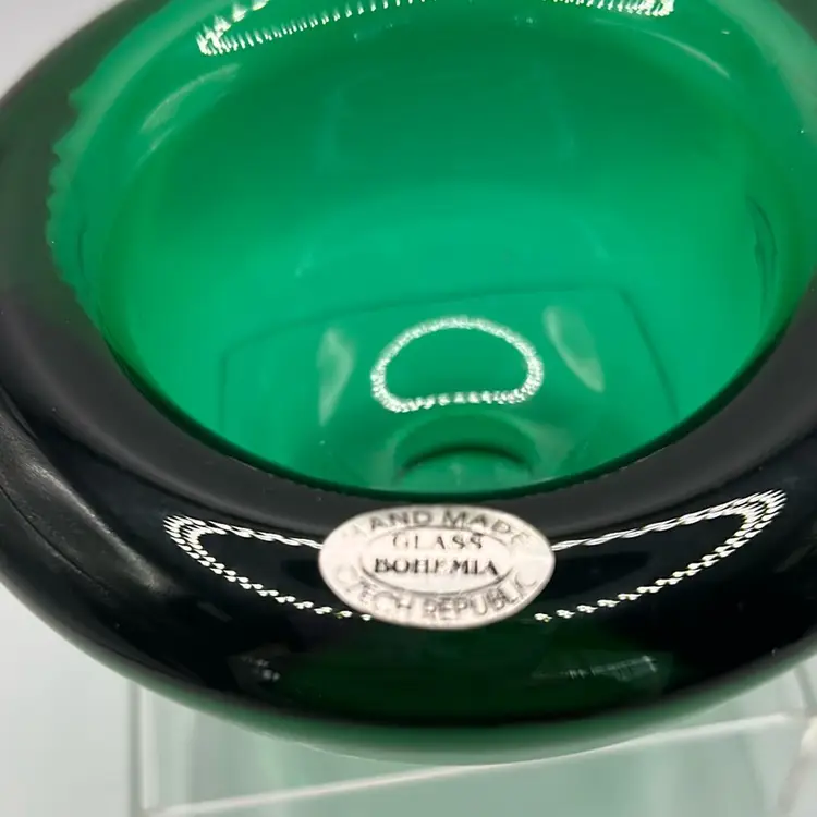 This piece is handmade glass in the Czech Republic in the Bohemian style. It stands just over 2 inches tall and is 4 inches across the top in excellent condition no chips or cracks original sticker.