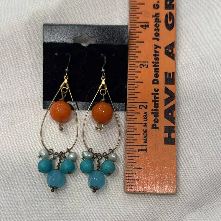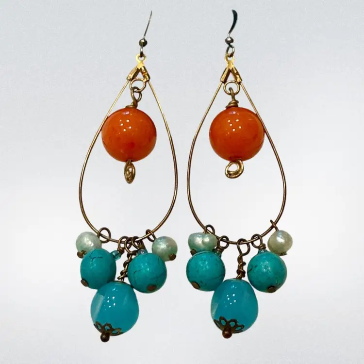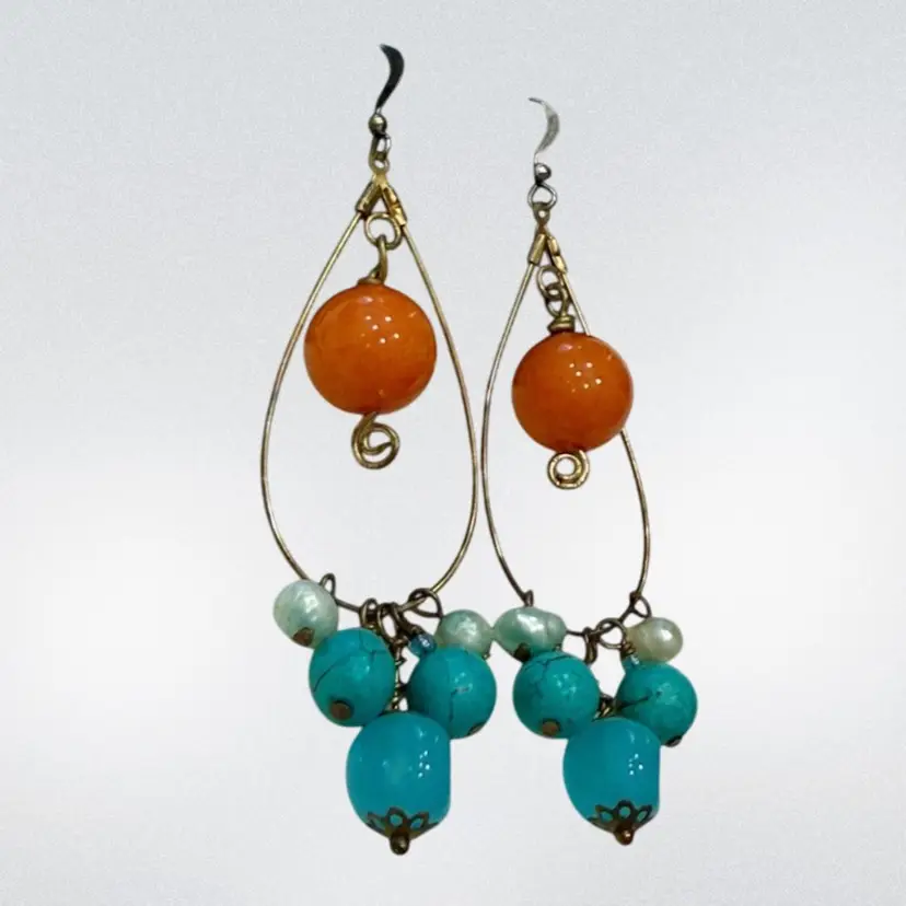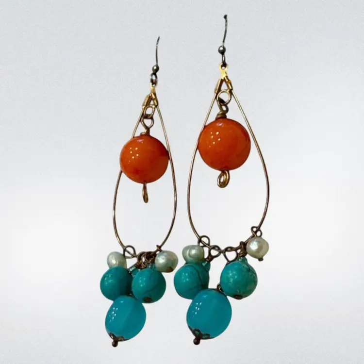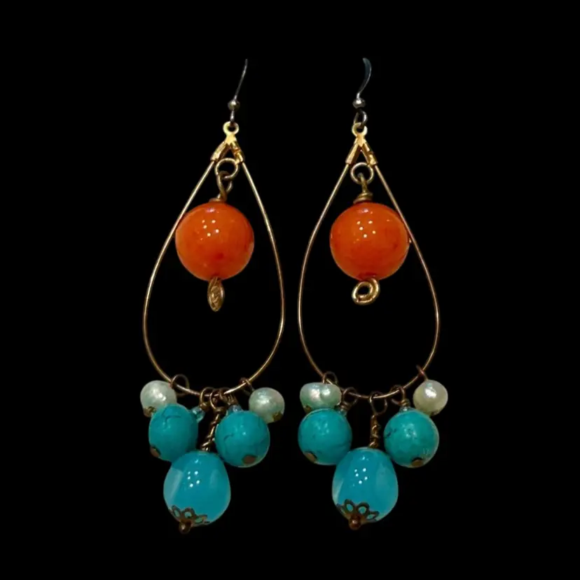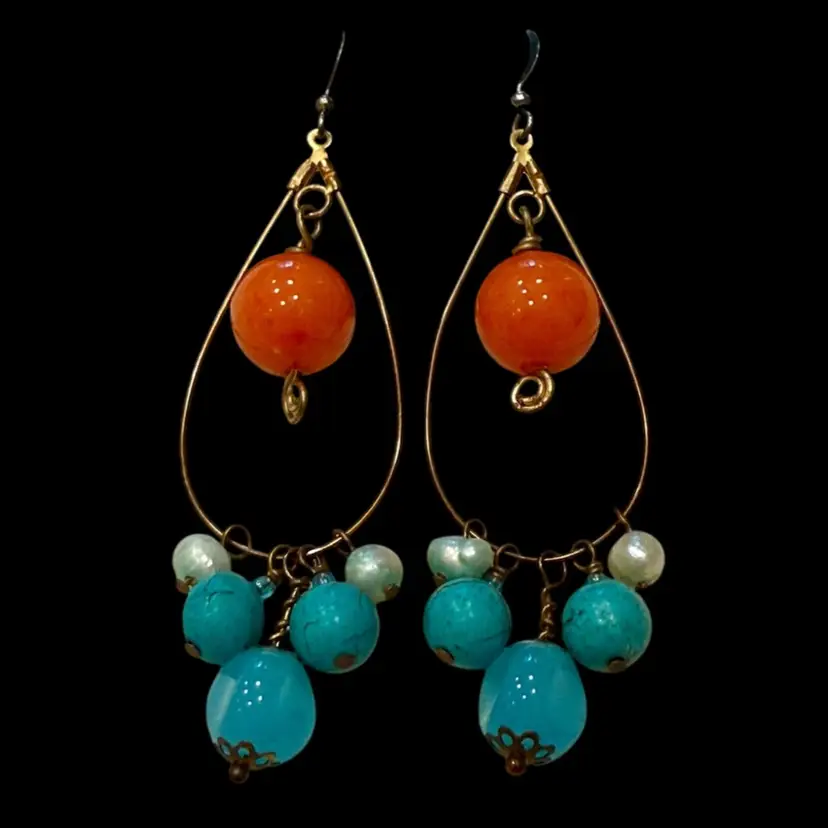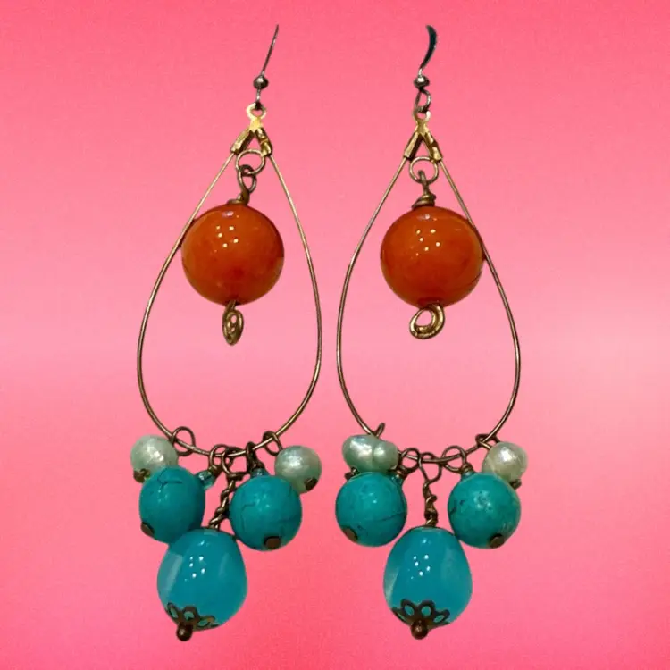 Handmade Brass Wire Freshwater Pearl, Carnelian, Turquiose & Glass Dangle Earrings 3”
