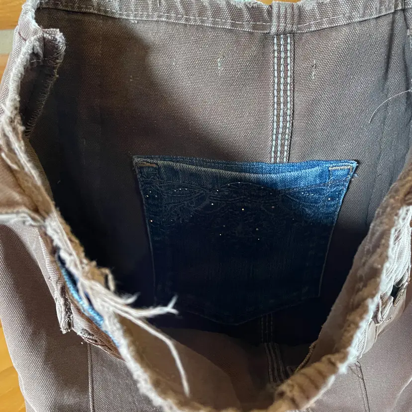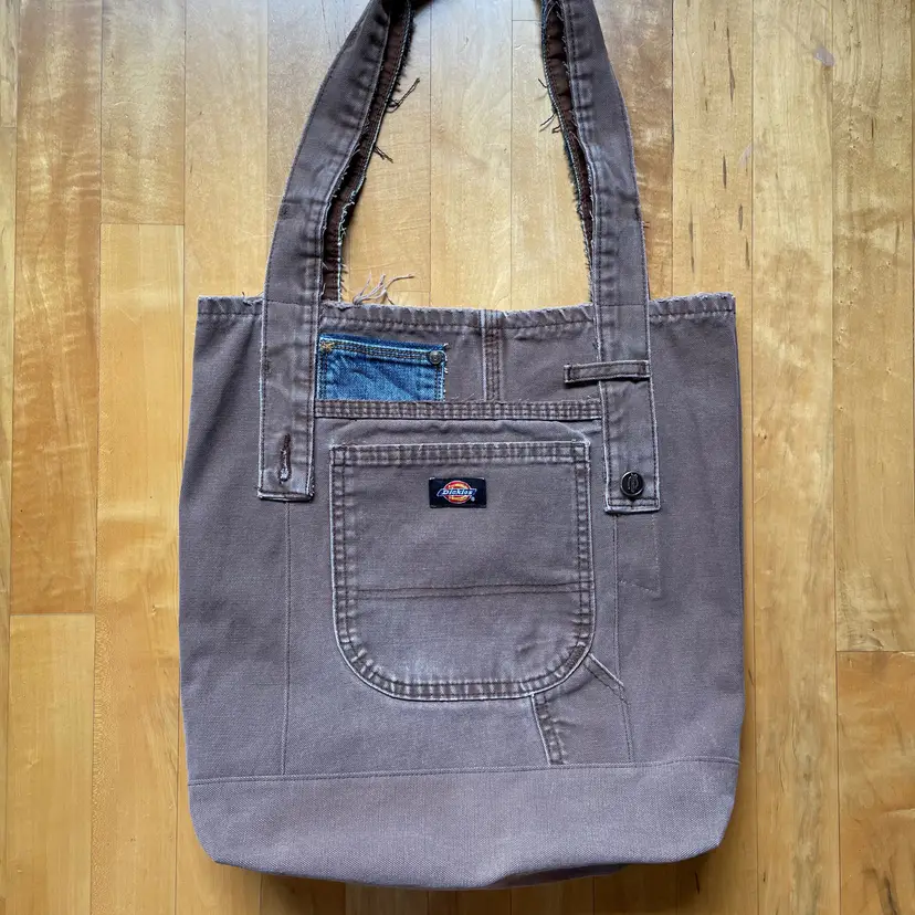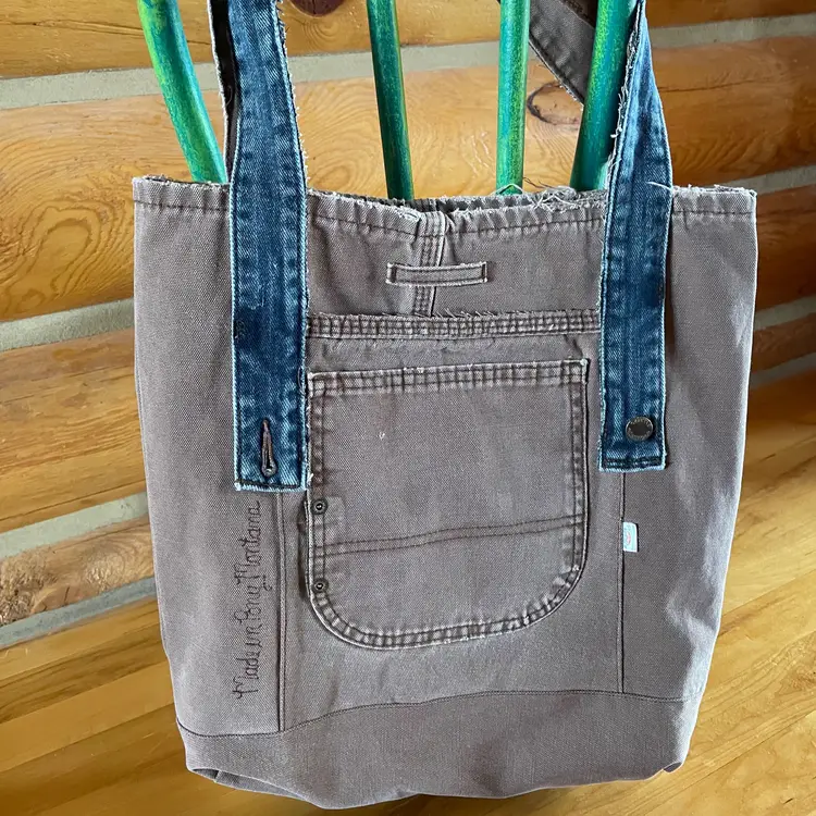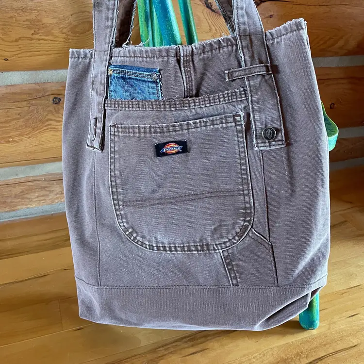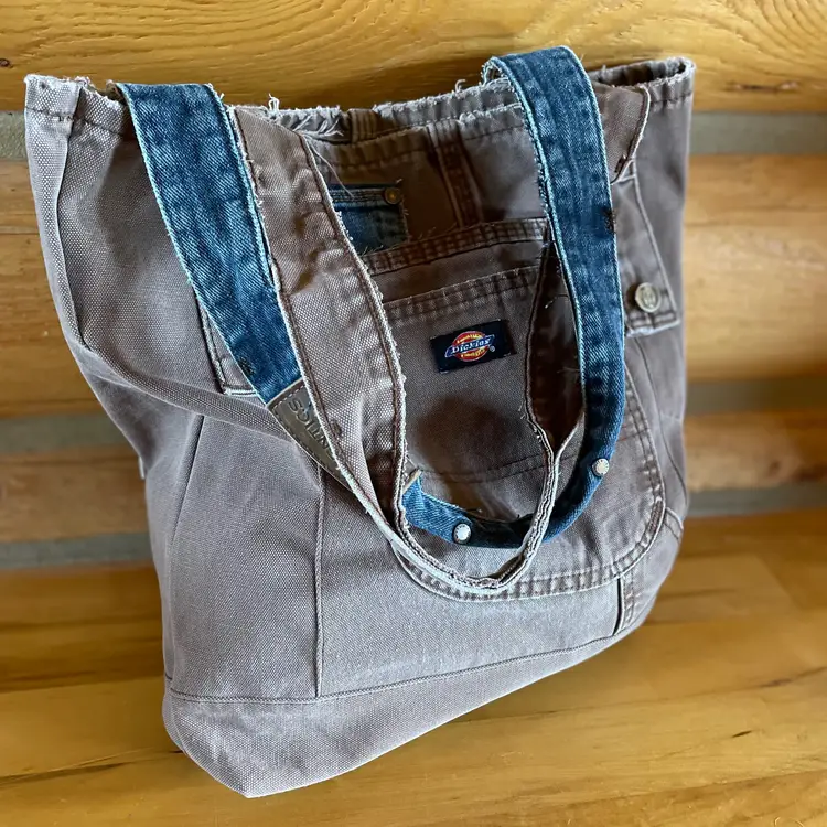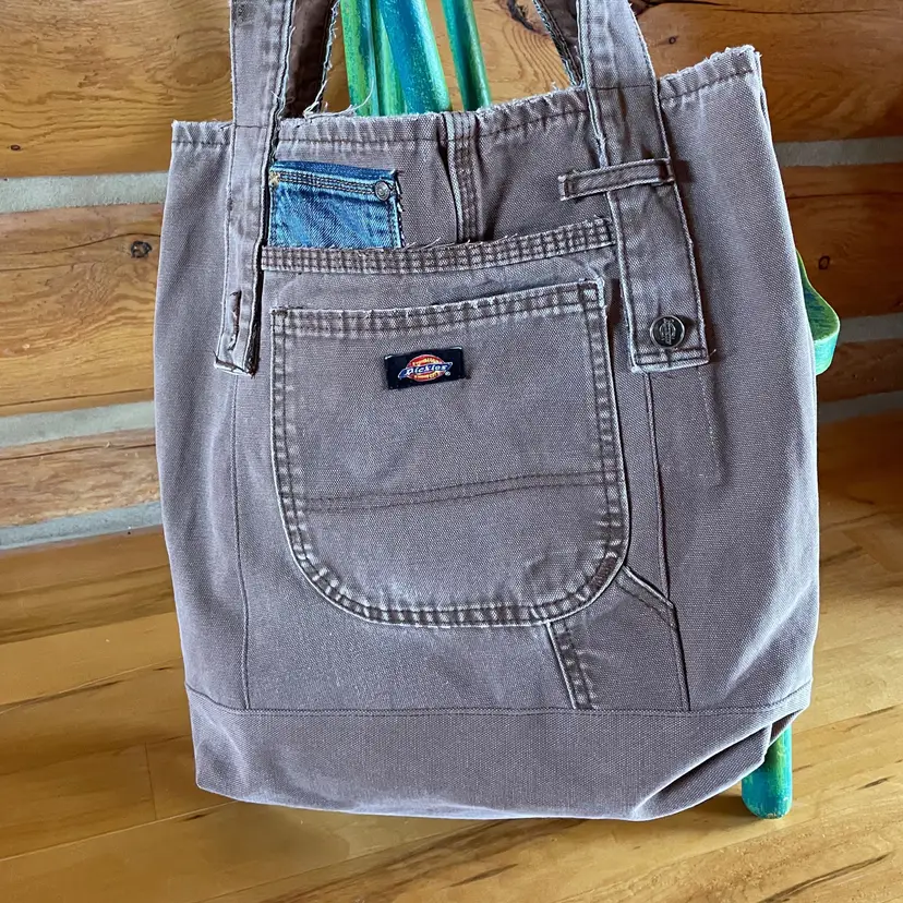Tote re-invented from durable Dickies (brand like Carhartt) workwear with personality. Mostly brown tote is designed from leg bottom edge becoming the top edge. Two deep durable pockets grace each side of bag decorated with "butt" pockets and a very small denim pocket on one side to coordinate with the repurposed waistband shoulder straps. There is also a denim pocket on inside of tote and a pen pocket as well.