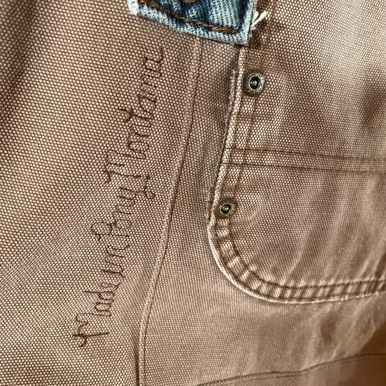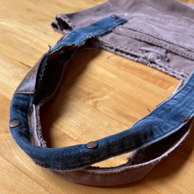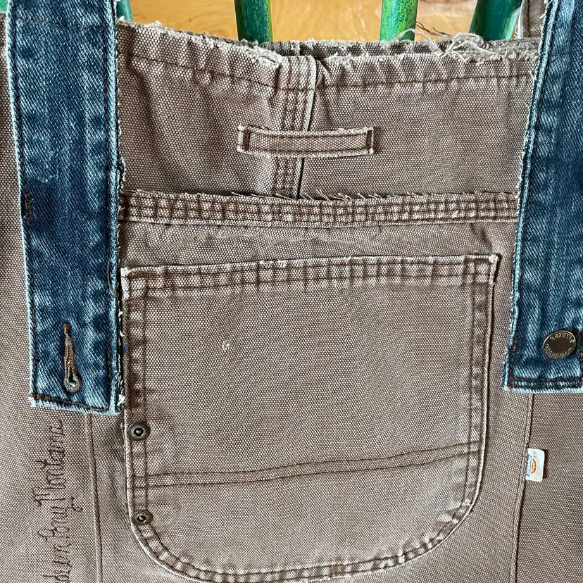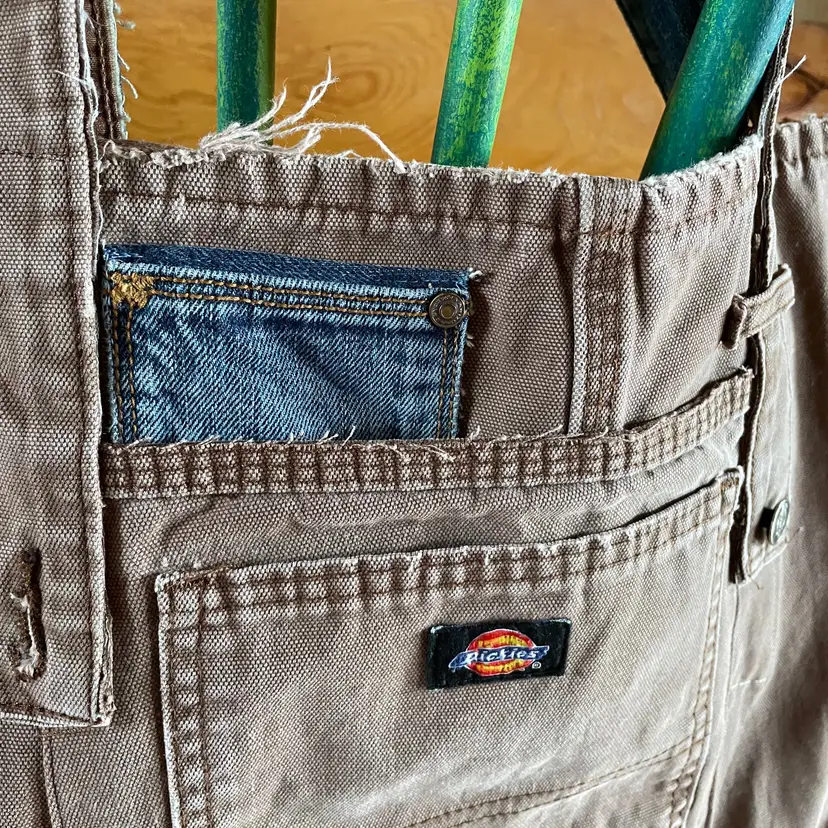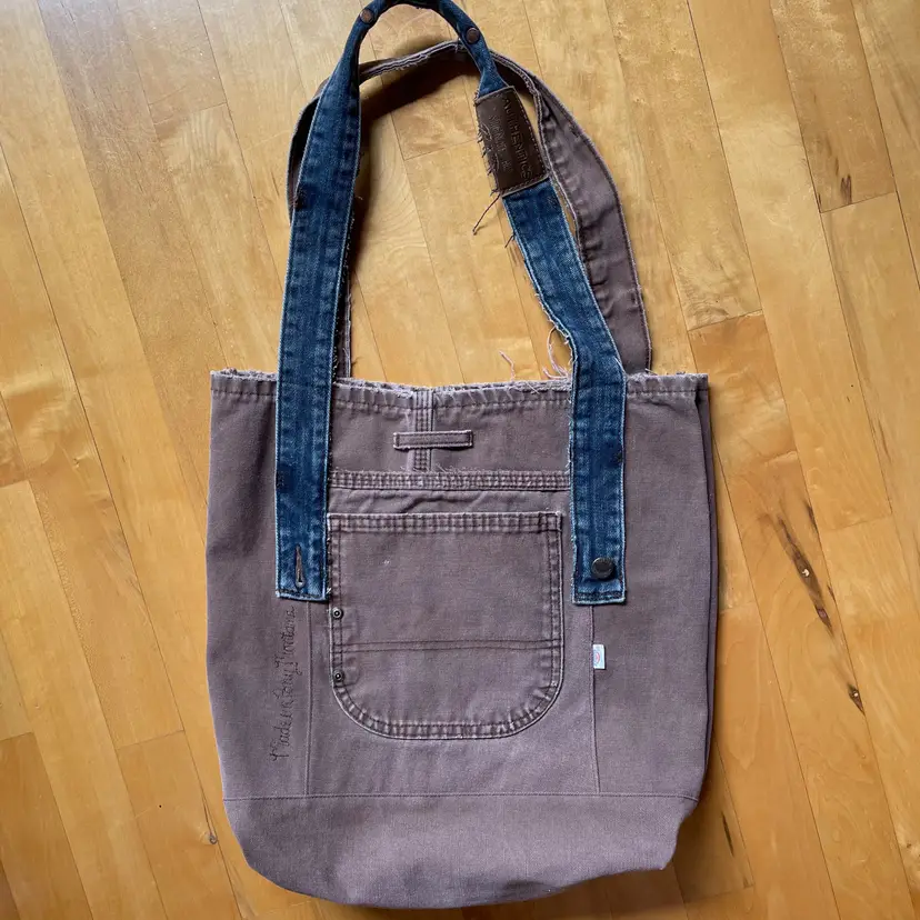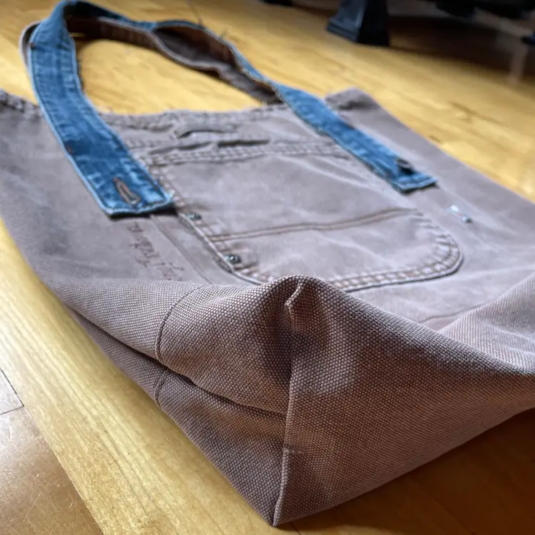 Tote re-invented from durable Dickies (brand like Carhartt) workwear with personality. Mostly brown tote is designed from leg bottom edge becoming the top edge. Two deep durable pockets grace each side of bag decorated with "butt" pockets and a very small denim pocket on one side to coordinate with the repurposed waistband shoulder straps. There is also a denim pocket on inside of tote and a pen pocket as well.