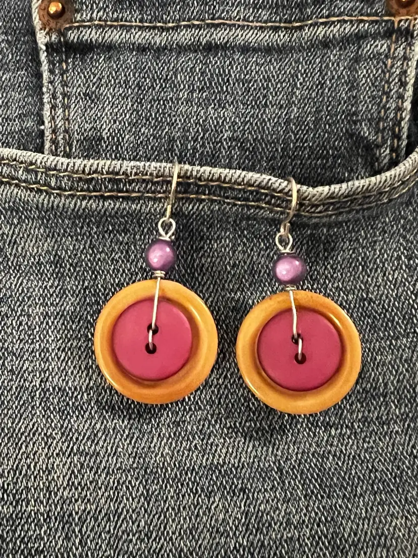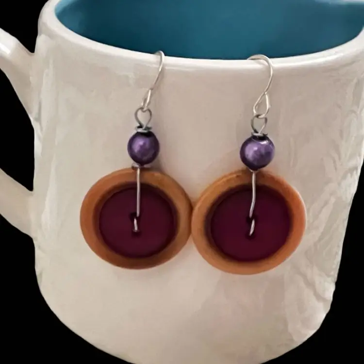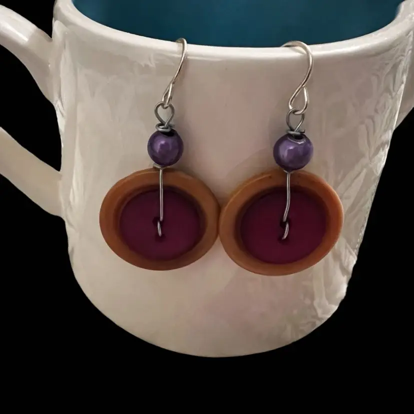 One pair These earrings are a combination of new and vintage buttons and beads. The Silvertone findings are nickel. Purple and tan buttons with purple foil beads.