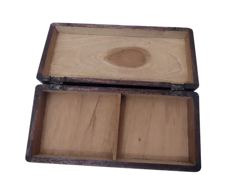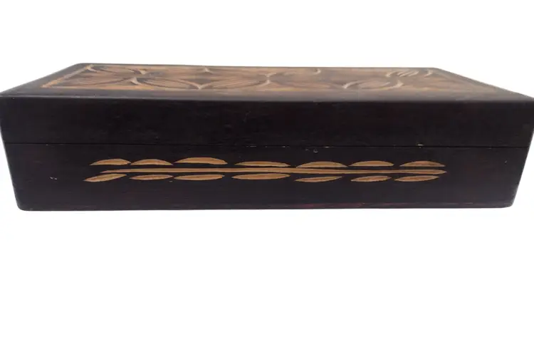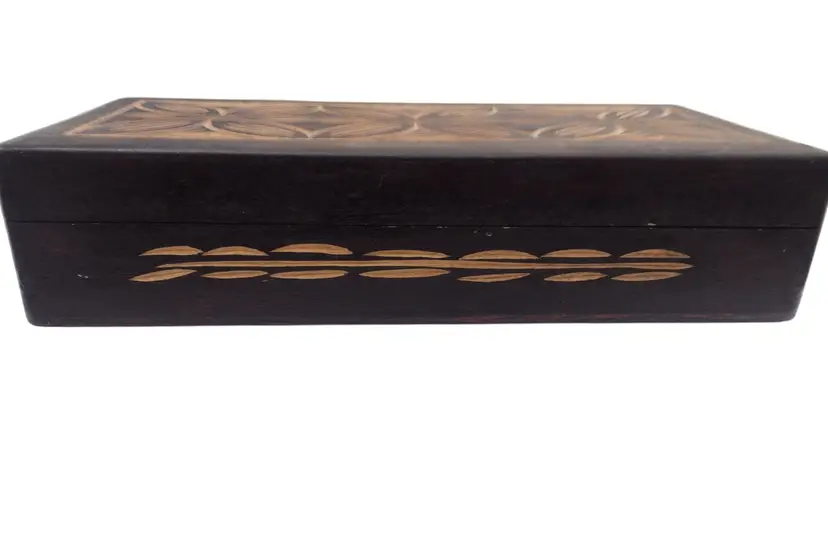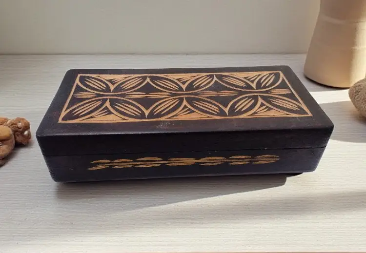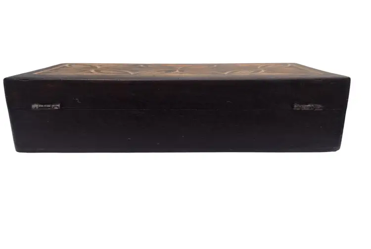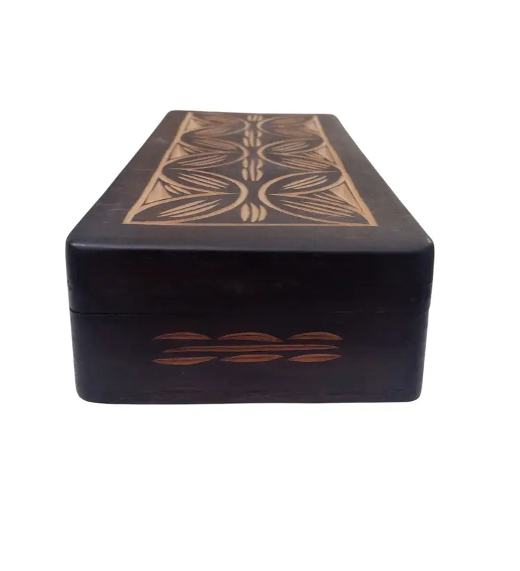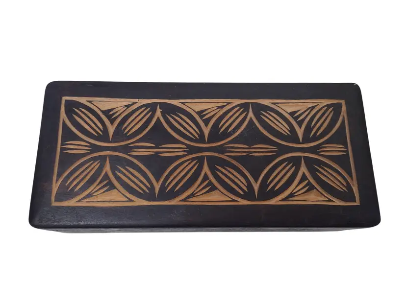 This is a very nice hand carved wood box with tribal/ethnic style designs. Box measures 10" long x 2.25" tall x 4.5" wide.