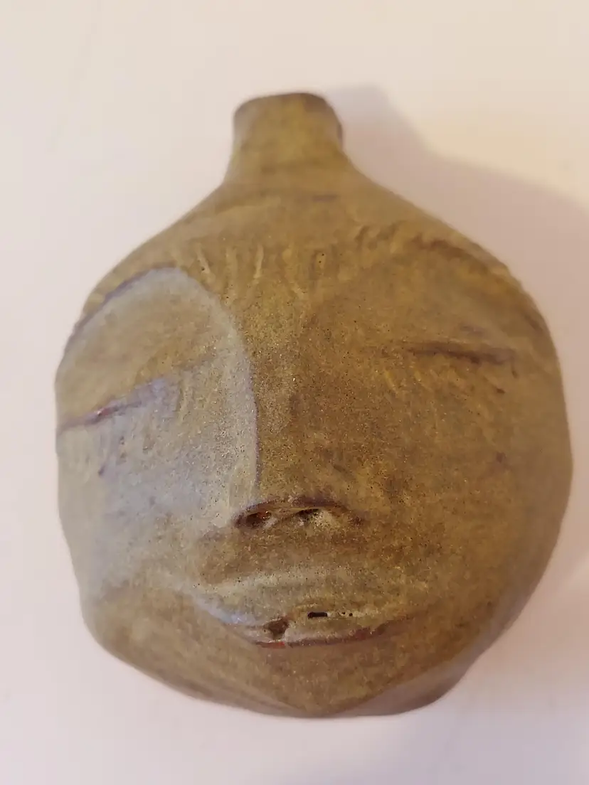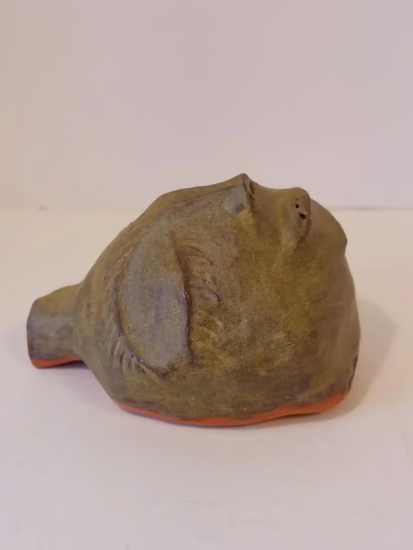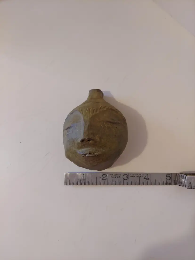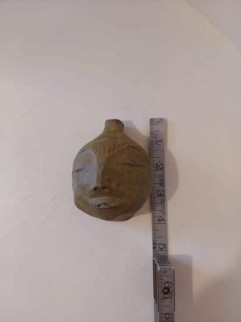 This handmade ceramic face whistle measures approximately 3×4×2.75 inches and has no markings.