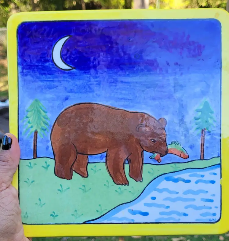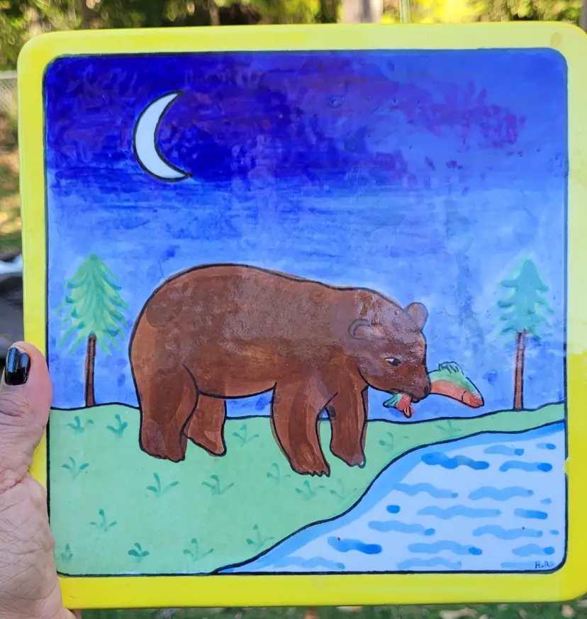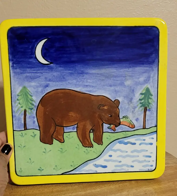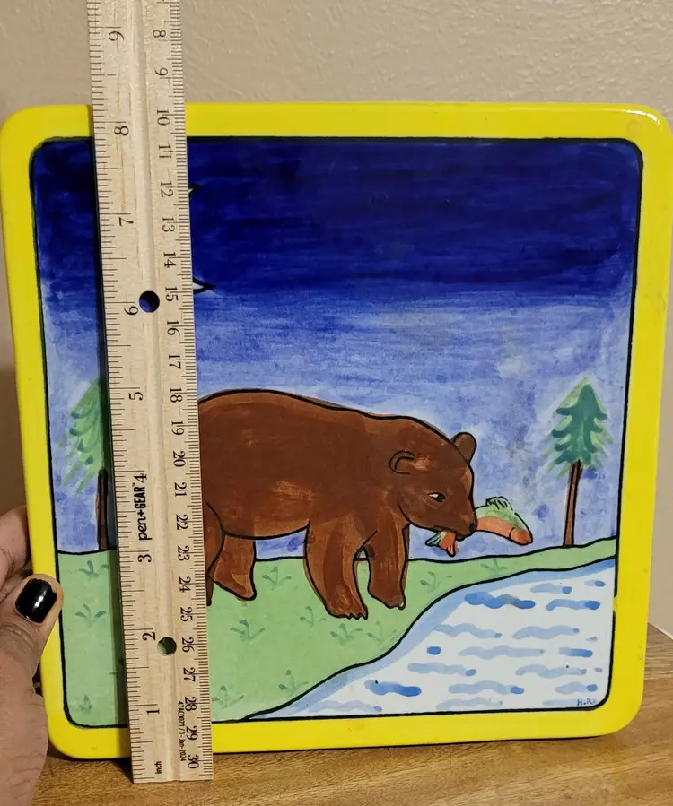 Handmade Ceramic Tile Bear Eating Fish. Heavy tile made in Mexico.