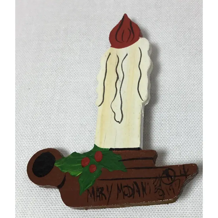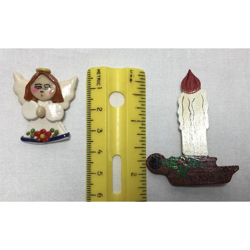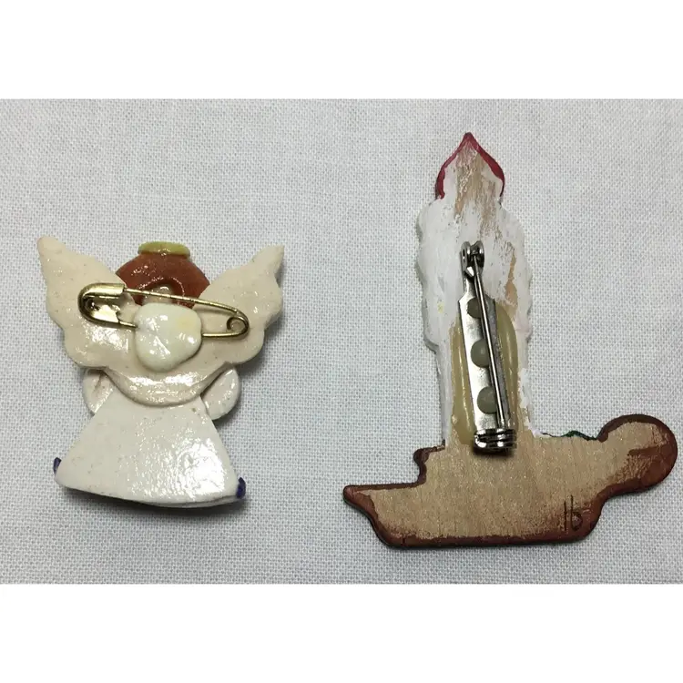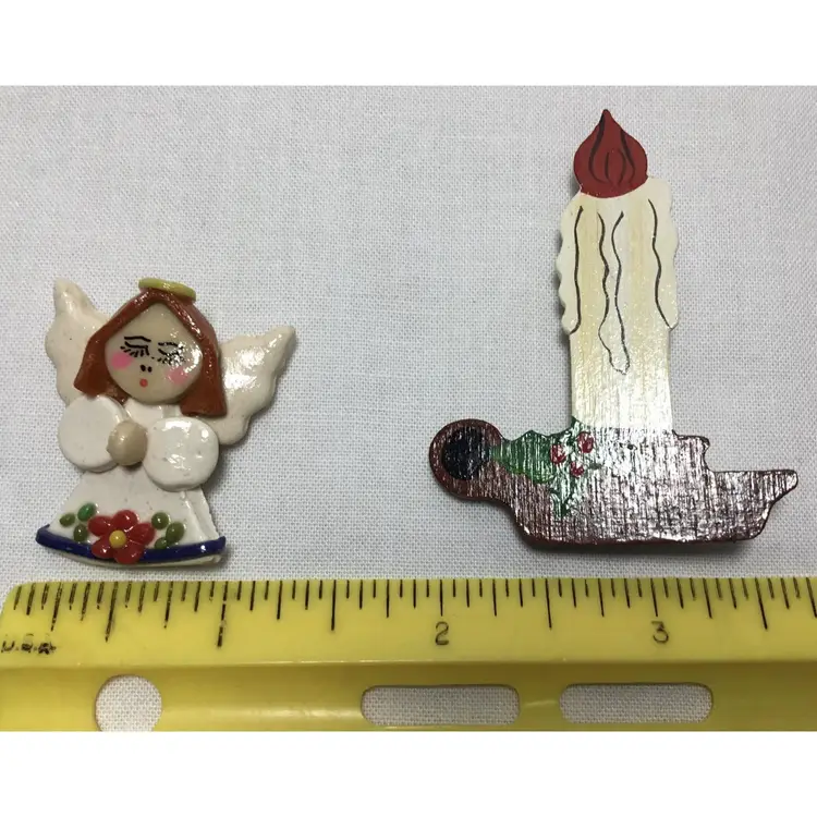 Lot of two Christmas brooches, both handmade, One is ceramic angel 1.5 inches tall by 1 inch wide. White dress with red flower on front. Gold halo, brown hair. Safety pin clasp. Other is wooden candle, 2.25 inches tall by 2.25 inches wide. Sprig of holly on candle holder. Locking safety clasp. Hand painted, artist signed. Mary Modani, 1974.