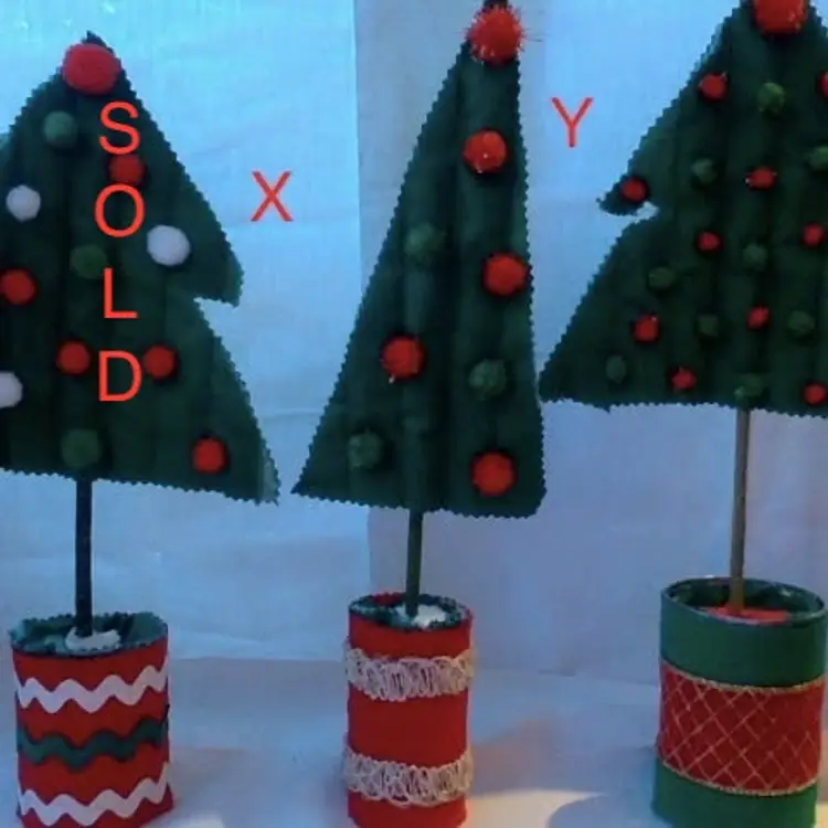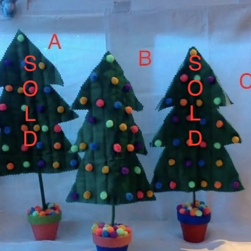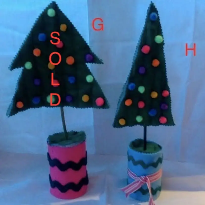 Handmade Christmas Decorations: Pom Pom Trees. Made with vintage rickrack and ribbon. Pom poms are new. Only fronts have pom poms. Range from 11in. to 15in. tall. Have a few left from large craft sale. Merry Christmas! B $8 each. Made with terracotta pot bases. H $7 each. Made with neon pom poms and vintage ribbon/rickrack. {I have glued missing pom pom back onto H} YZ $7 each. Made with red&green pom poms and vintage ribbon/rickrack. {Y & Z have glitter pom poms.} Please see my other listings. Multiple purchase discounts. Monitor 8PM nightly. (not 24/7)