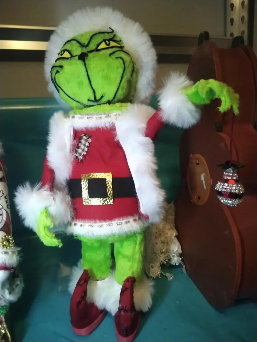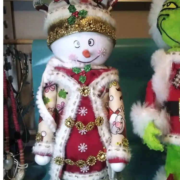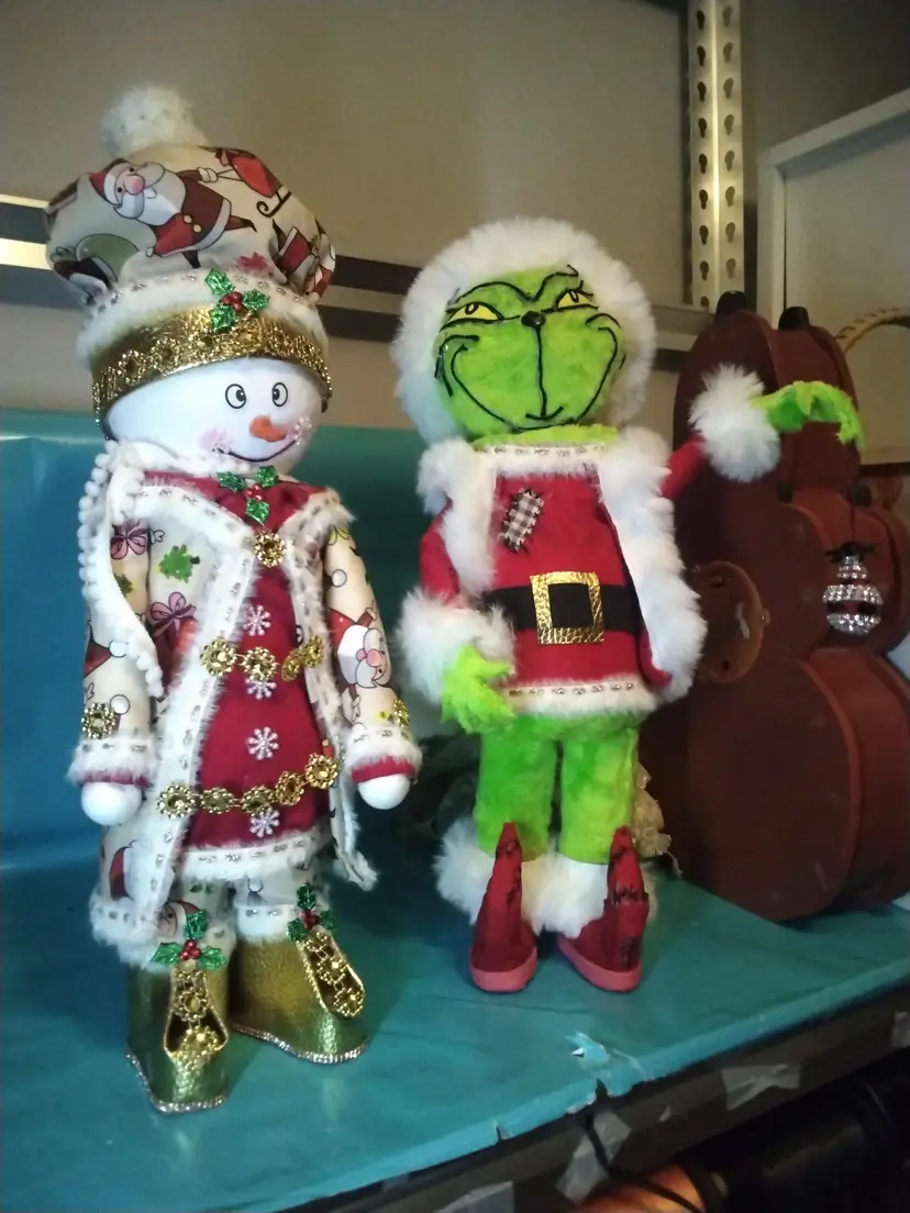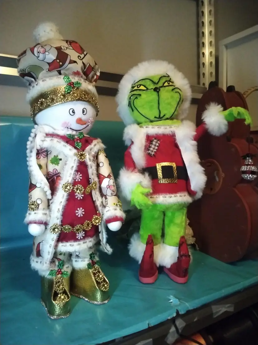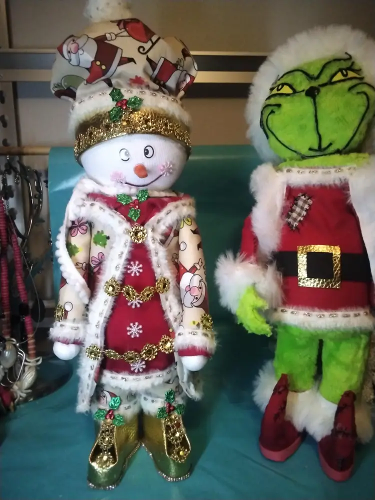 Add some festive cheer to your home with these handmade Grinch and Snowman dolls. Dressed in holiday attire, they're perfect for bringing a whimsical touch to your Christmas decor. Each doll is crafted with attention to detail, making them a unique addition to your collection.