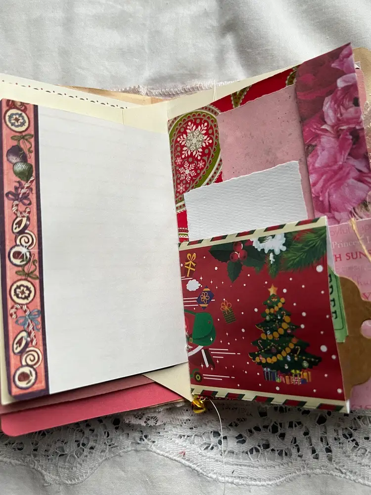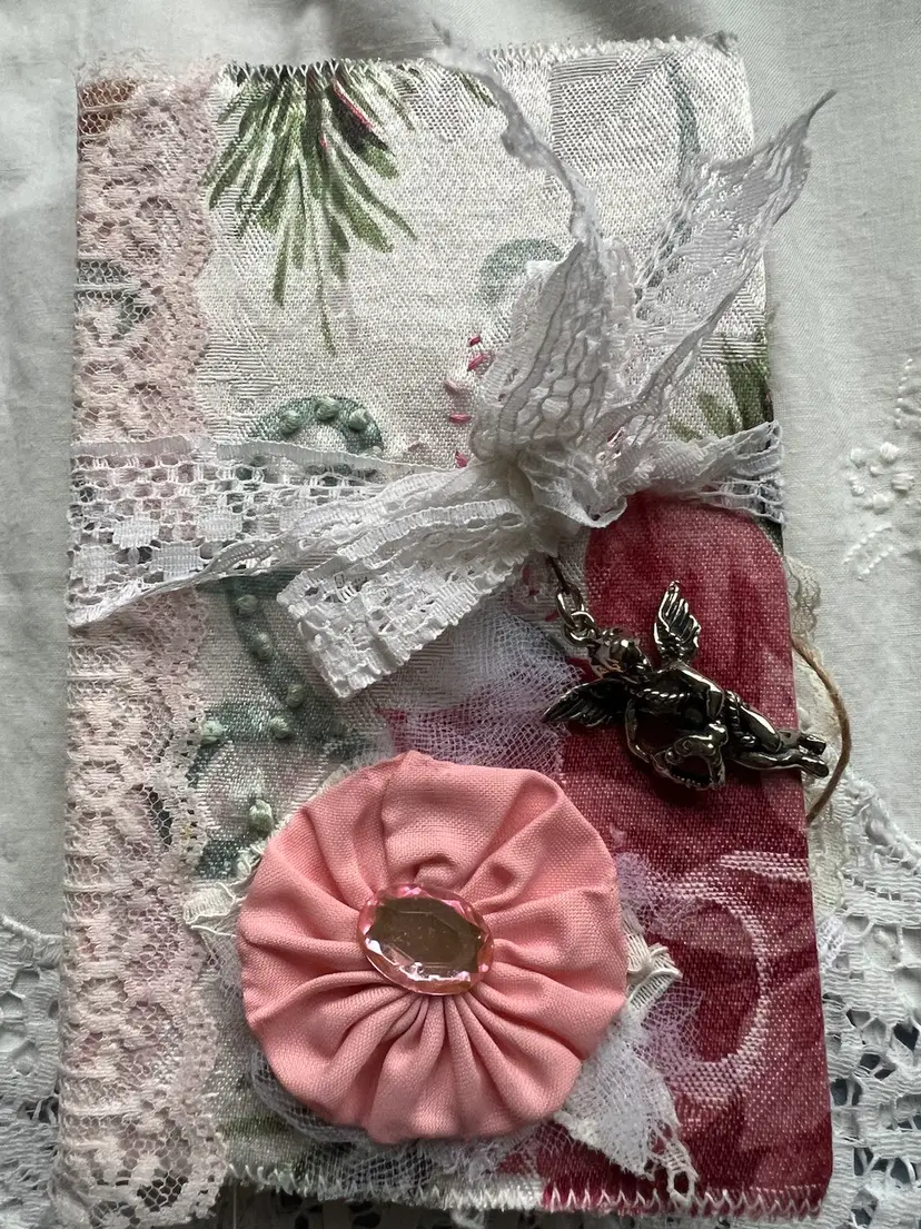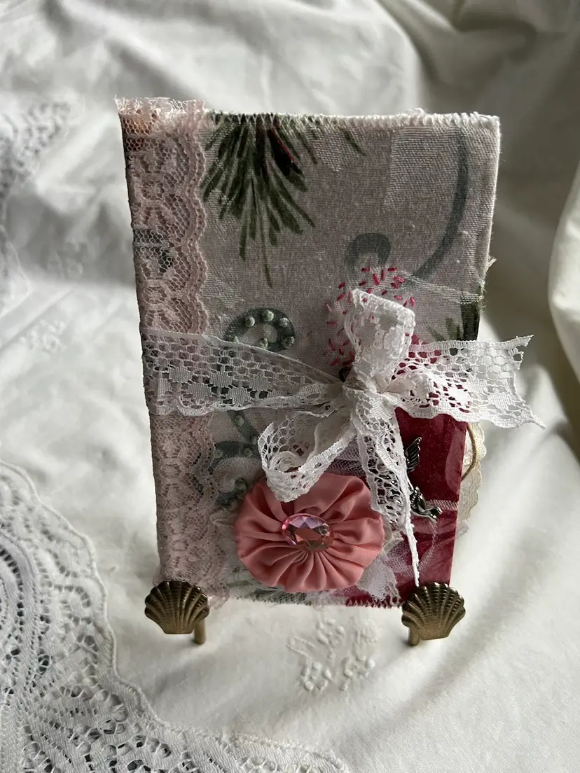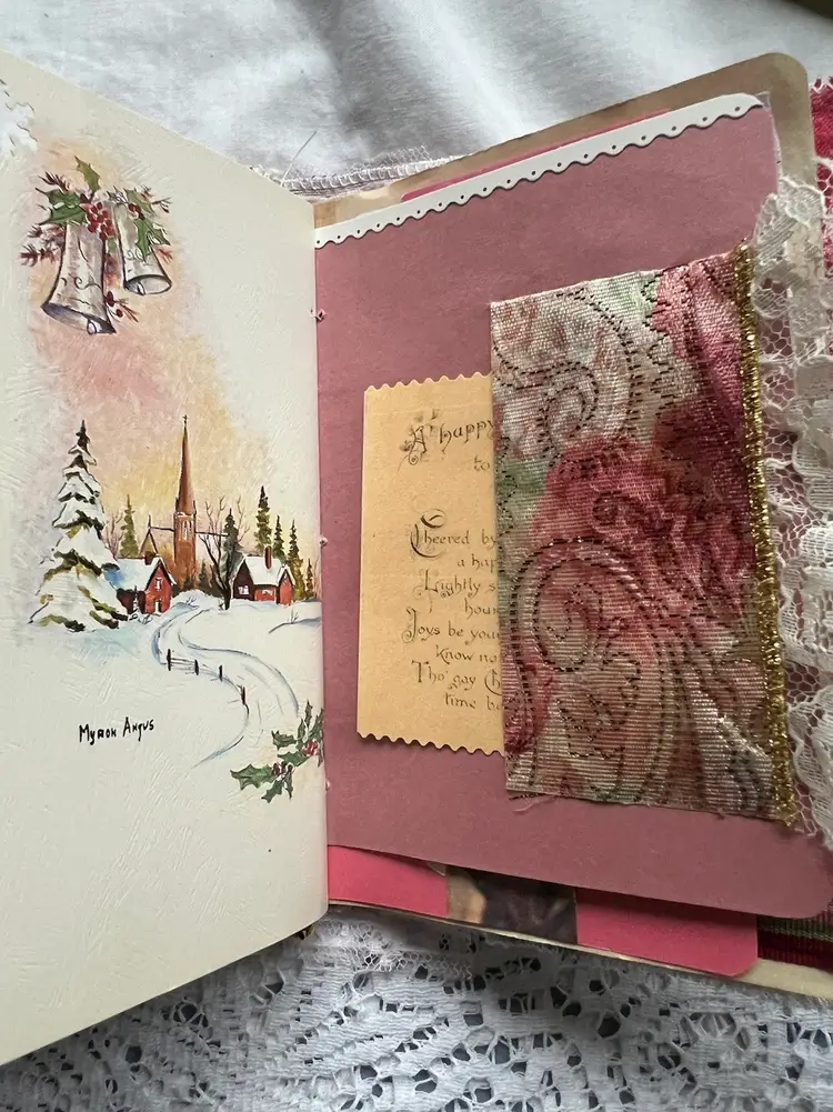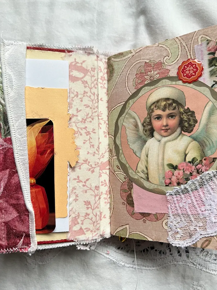 This little journal has been a labour of love & is a great gift or to cherish yourself. An antique book has been covered by a repurposed Christmas table runner with slow stitched accents, vintage yo-yo, lace tie, and an angel charm. It has 36 page sides and measures 6 x 4 x 1” in size. There is the perfect balance between decorated pages and journaling space. Inside you can expect to find a variety of papers, interactive elements, lace, fabric, ribbon and other embellishments. Extra goodies will be included for the new owner to use to personalize the journal.