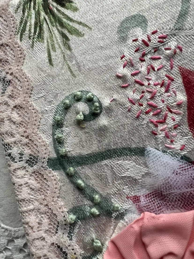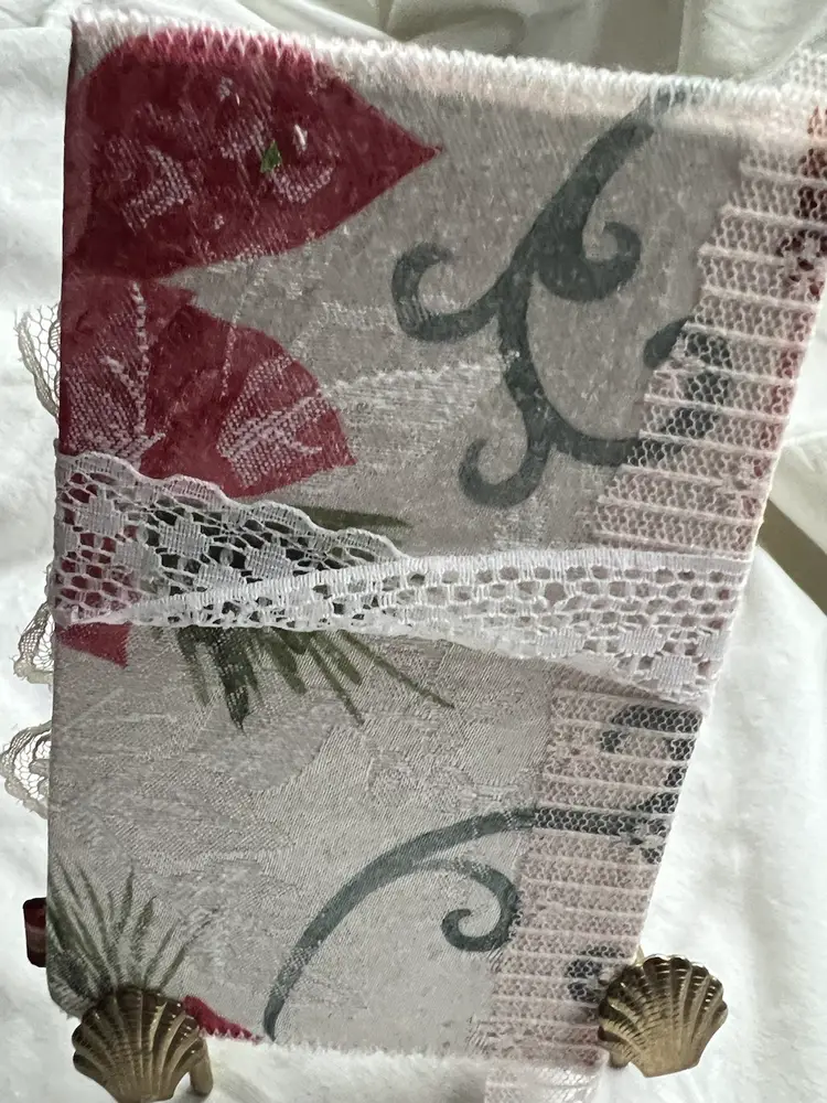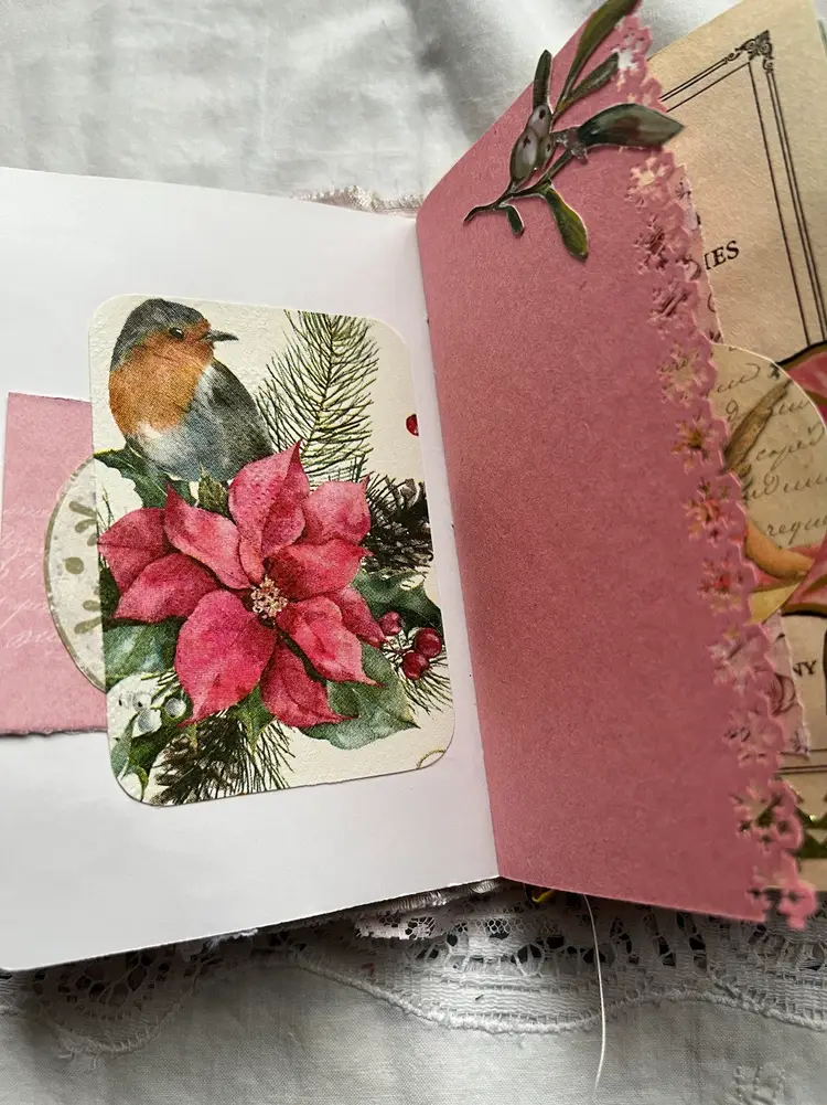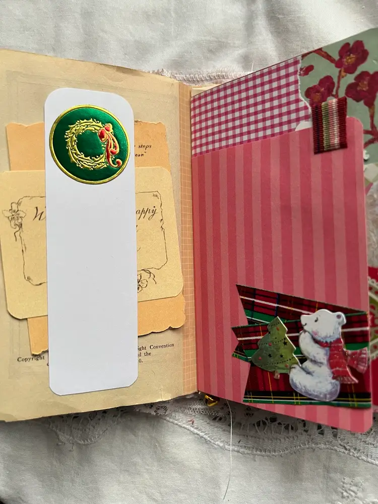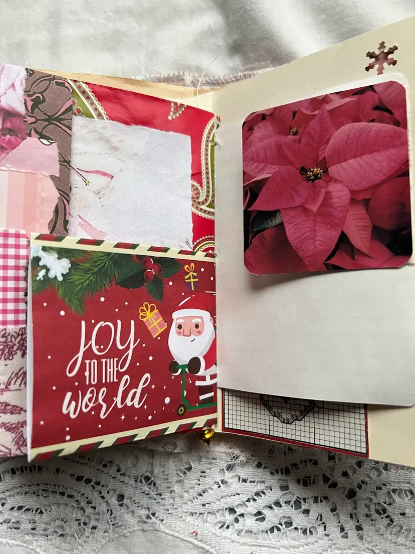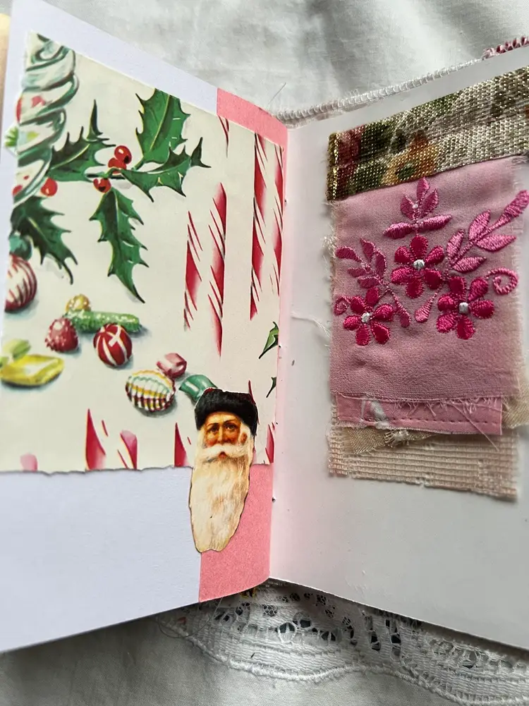 This little journal has been a labour of love & is a great gift or to cherish yourself. An antique book has been covered by a repurposed Christmas table runner with slow stitched accents, vintage yo-yo, lace tie, and an angel charm. It has 36 page sides and measures 6 x 4 x 1” in size. There is the perfect balance between decorated pages and journaling space. Inside you can expect to find a variety of papers, interactive elements, lace, fabric, ribbon and other embellishments. Extra goodies will be included for the new owner to use to personalize the journal.