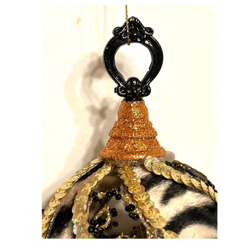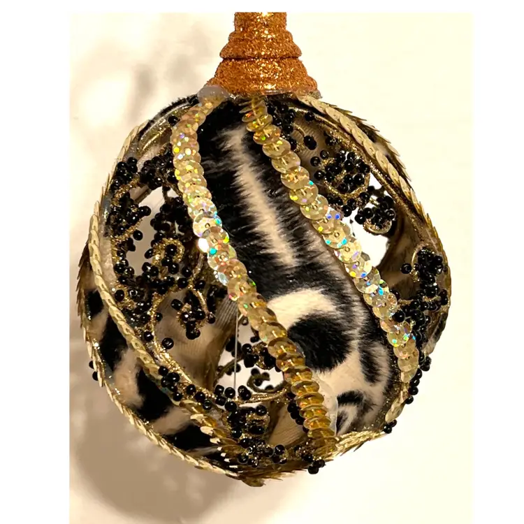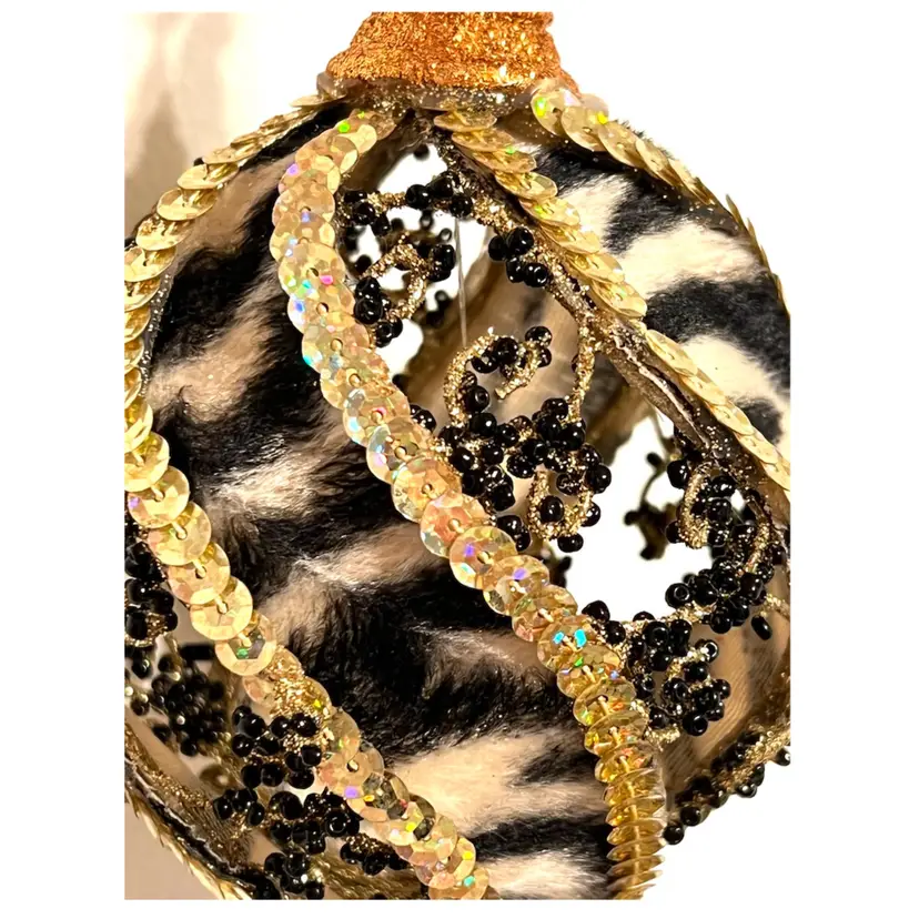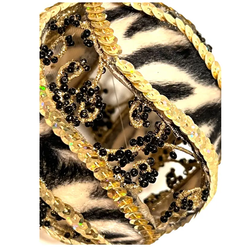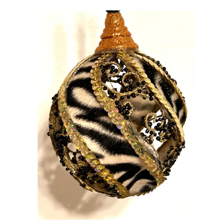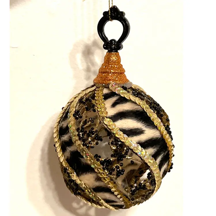 Handmade Christmas Ornament Safari Zebra Print Gold Sequins Black Beads 6 in Height, 3.5 in Length.