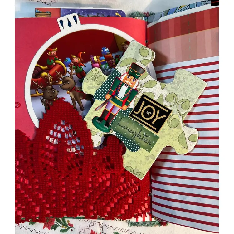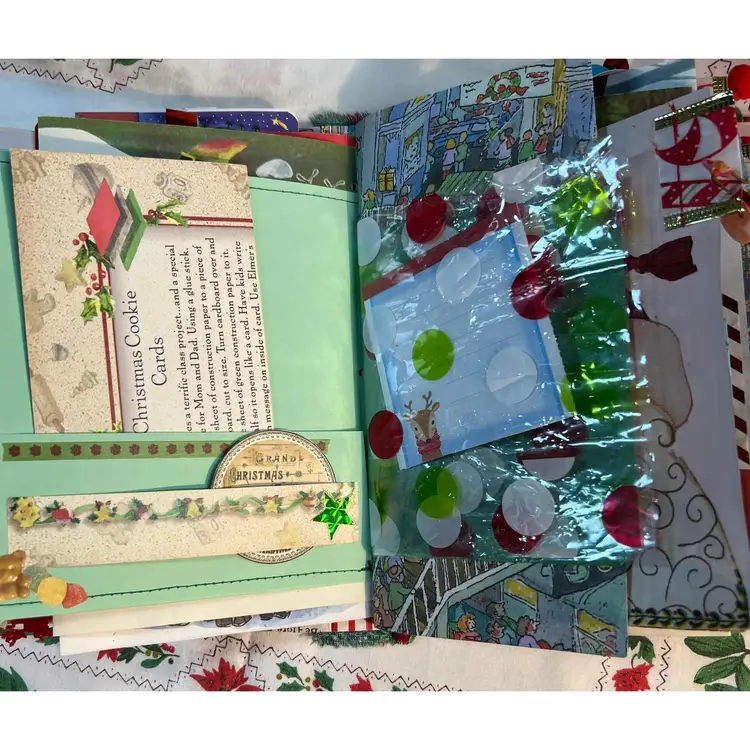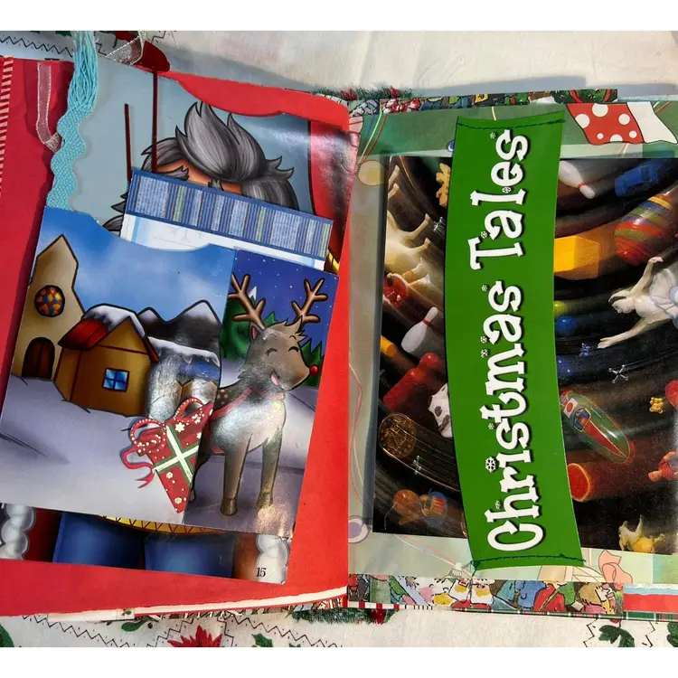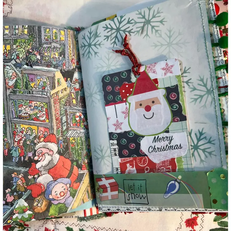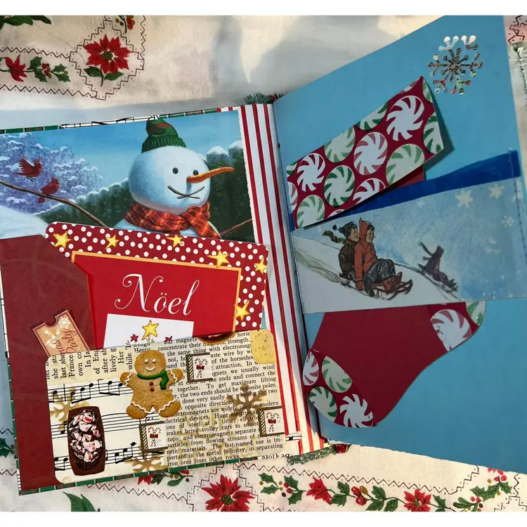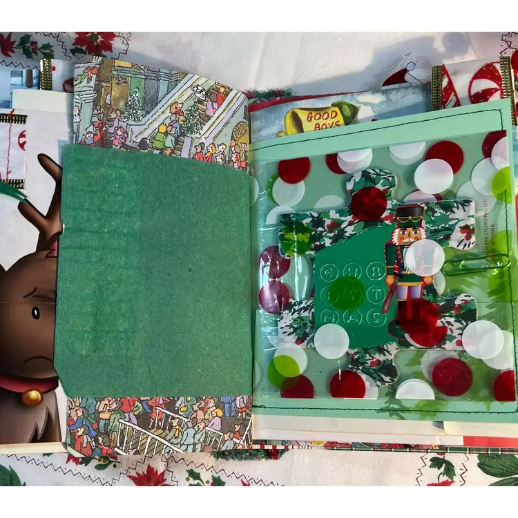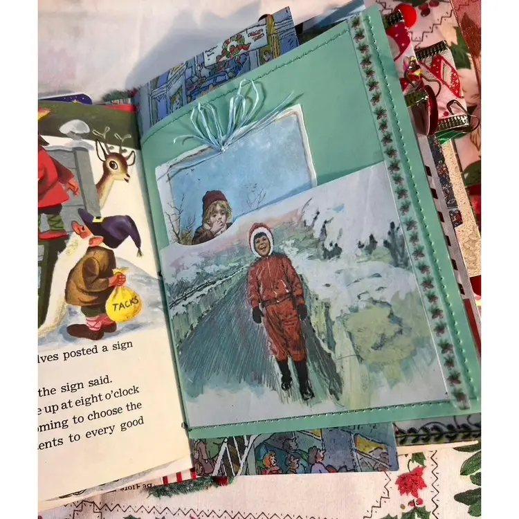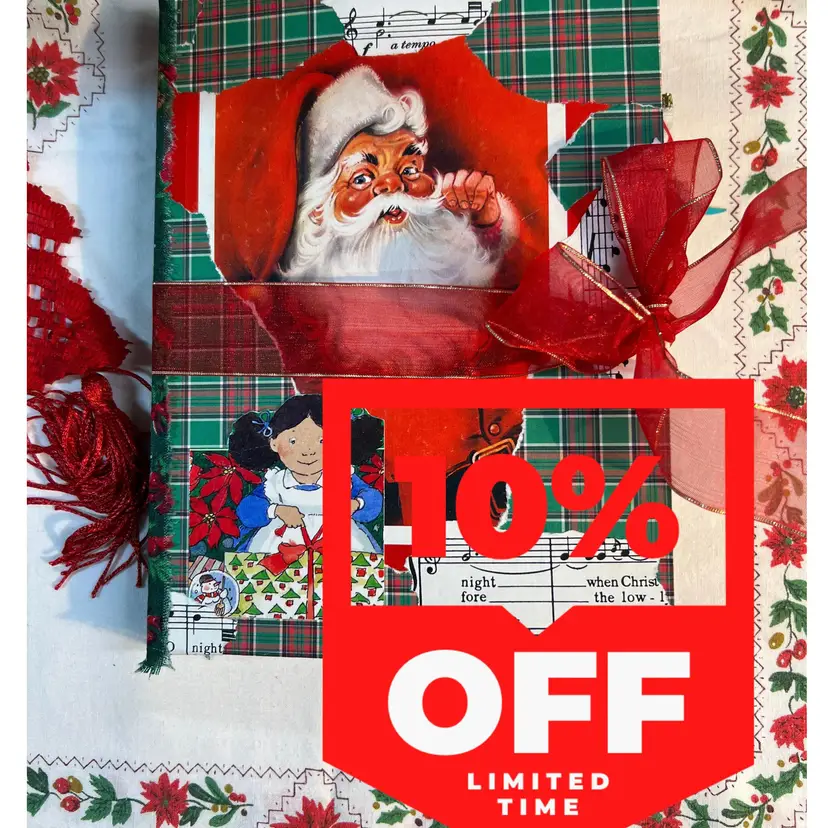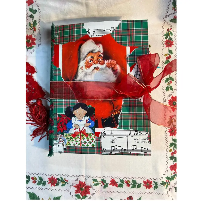 This handmade 60 page Christmas Whimsy Journal will appeal to kids & young-at-heart adults with its bright colours, interactive elements, and embellished pages. The cover was made from a vintage Christmas card box and features a collaged cover, fabric spine, organza ribbon closure, and an envelope with extra goodies. It has 1 signature and measures 8 x 6 ". A complete flip through video is available on my YouTube channel HazelAnakaDesign