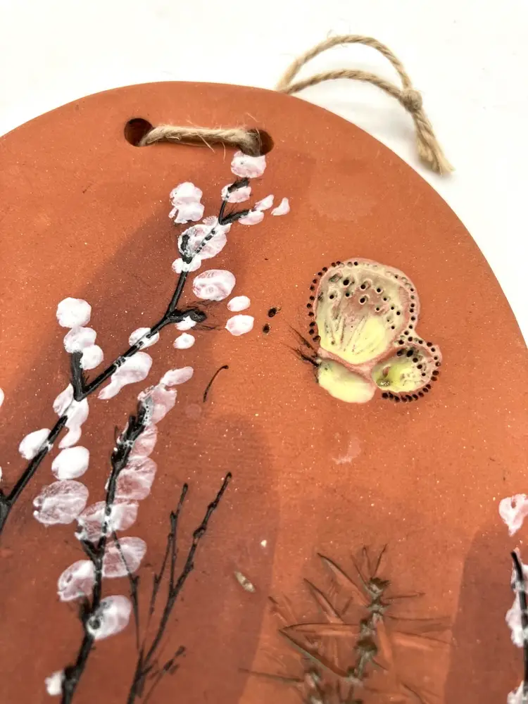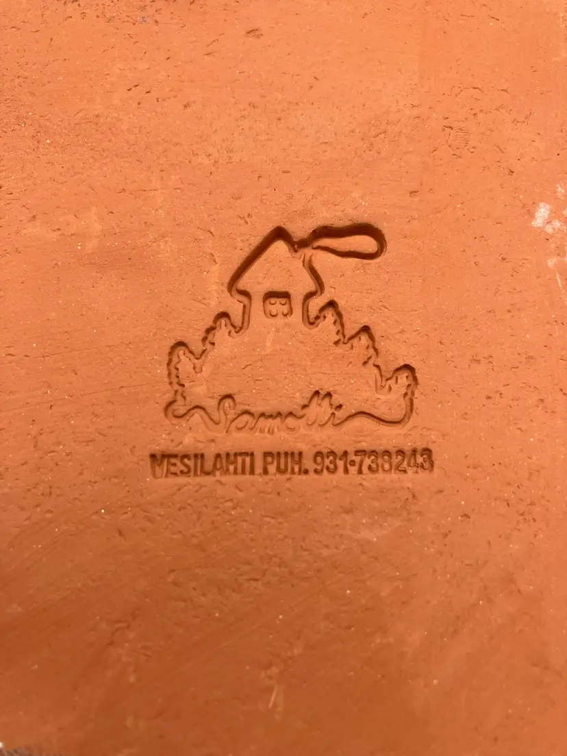 Great condition, measures 5.25” x 4.35” x 3/8”. Note the darker coloration behind the white flowers appears intentional by the artist. Also, Samotti appears to be a gift shop in Finland that sells pottery and other things.