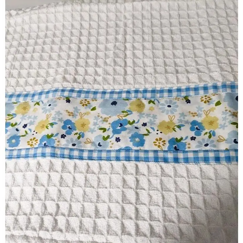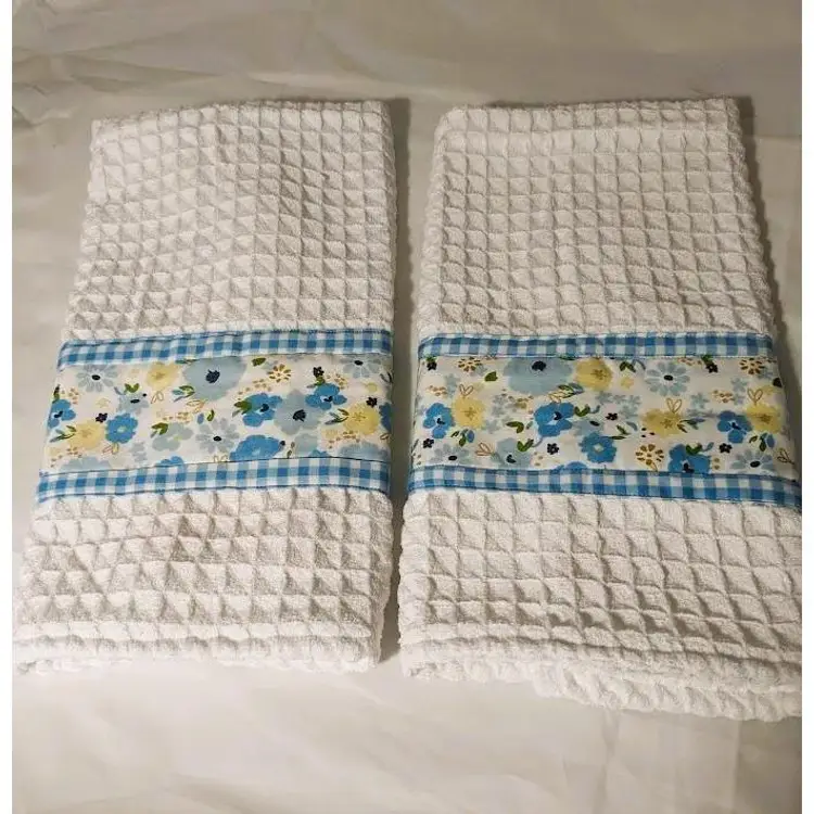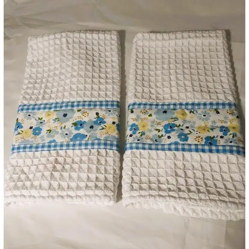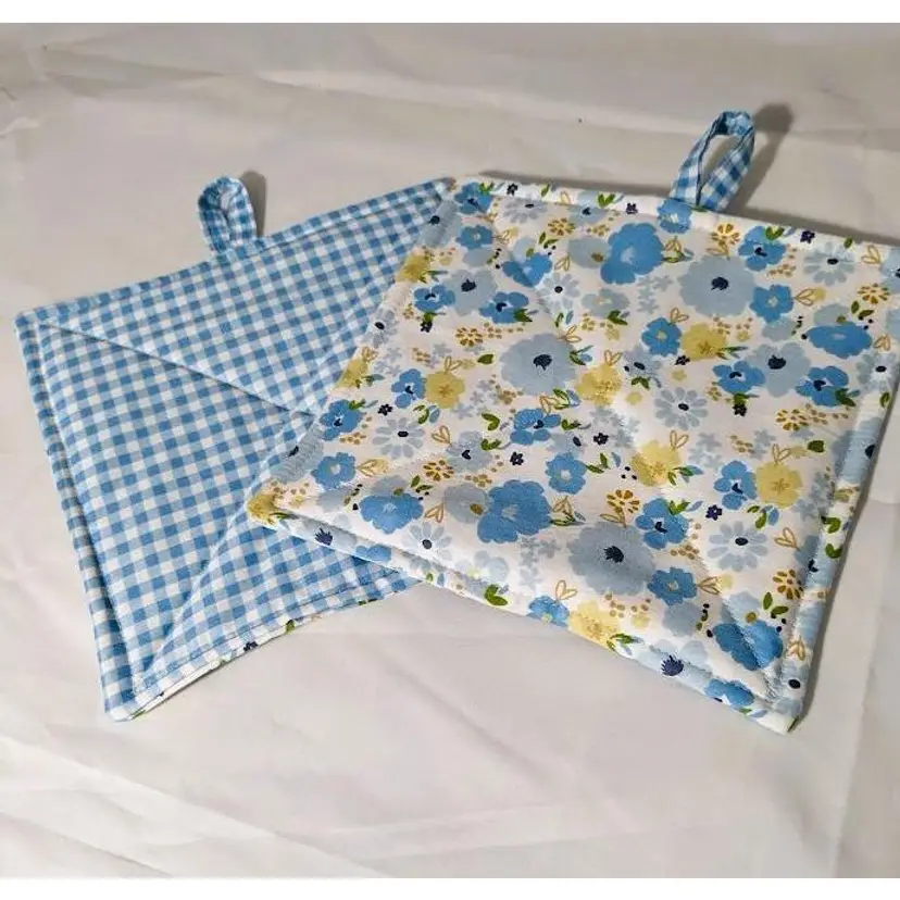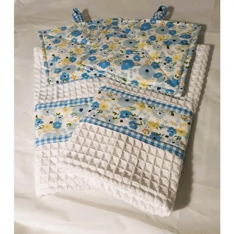 This 4 piece set, 2 kitchen towels and 2 pot holders, are Handmade (by me). White kitchen / tea towels are embellished with with blue and white florals and blue gingham trim. The potholders are made out of the same coordinating fabric and are padded with Insulbrite heat deterrent batting and can be used to protect your hands from hot pans or as a hot pad to protect your table. They have the coordinating blue floral on one side and blue gingham on the other.