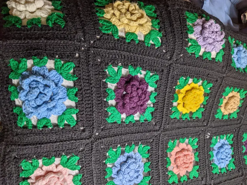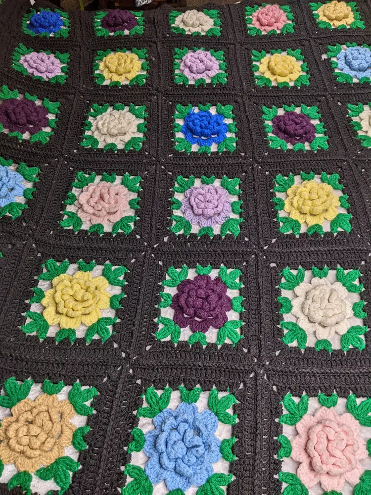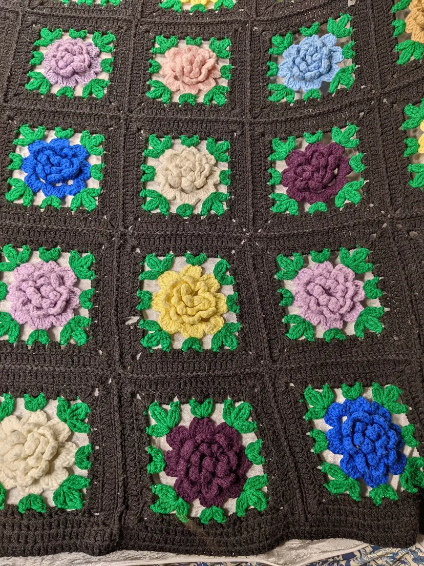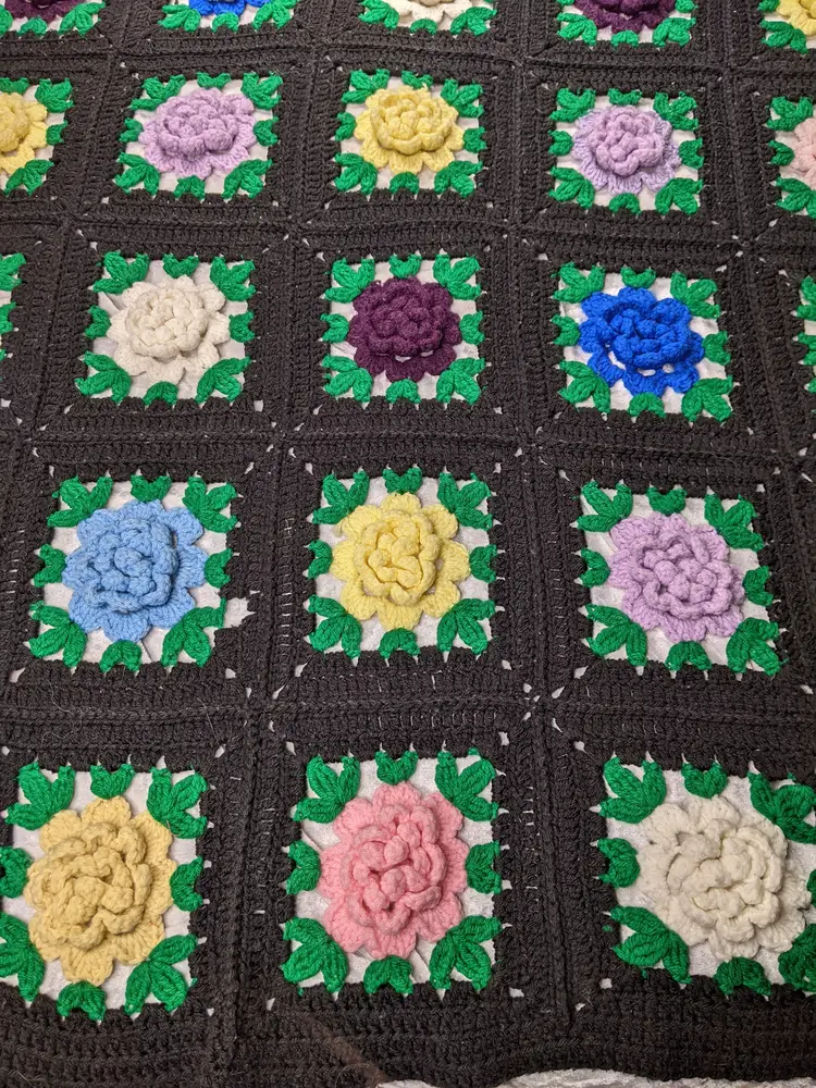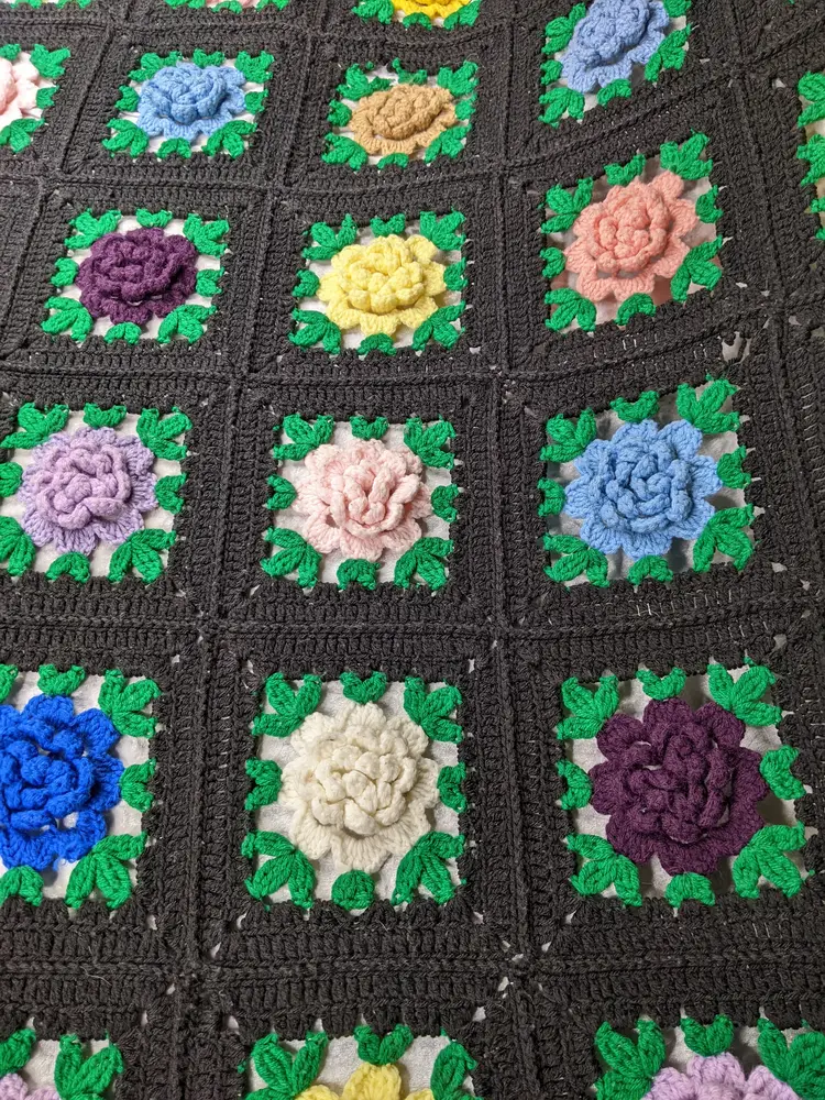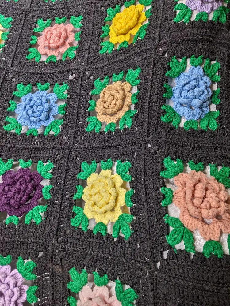 Handmade Crochet Afghan Granny Squares 3 D Roses Black background with Multi Color Blanket Throw 62"x84"Gothic Witchy Decor Castlecore, Bohemian English cottage, Cottagecore will fit into many decors. Very good condition . There are small lengths from there tying off that were not clipped on the back only a few . Clean with no damage. no weird smells. Please check the photos for details. Comes from a smoke free home. We do have pets.