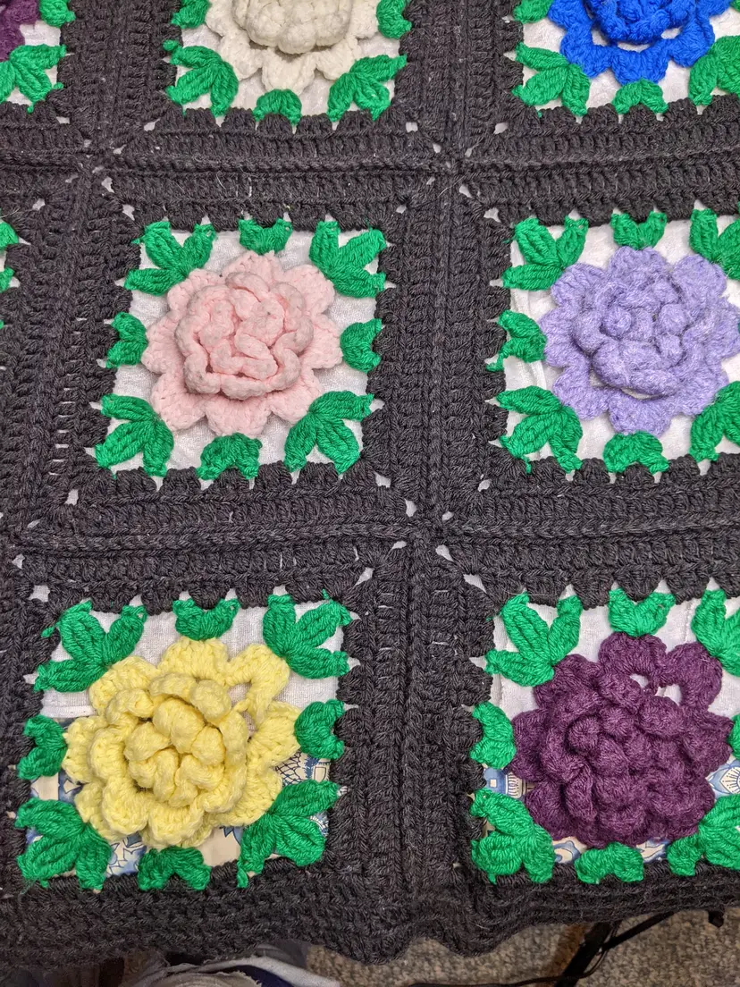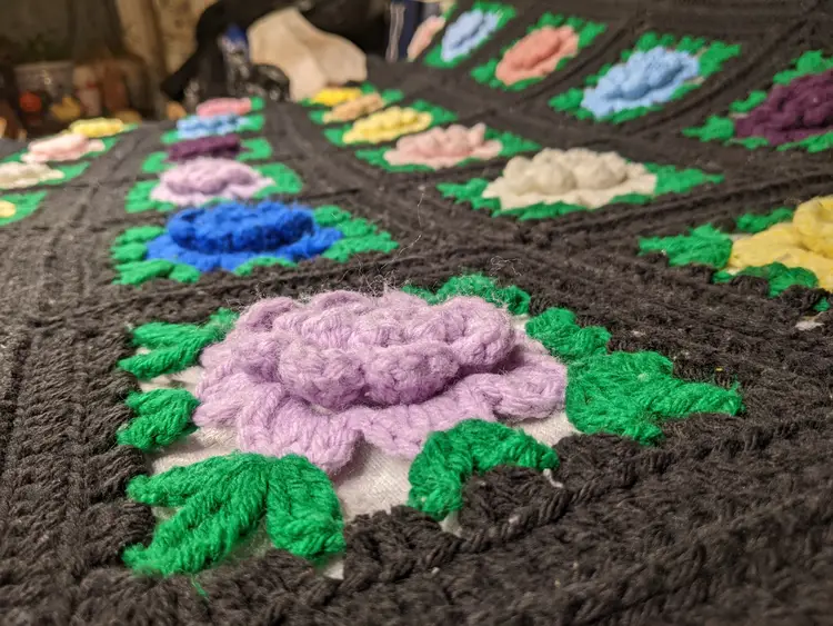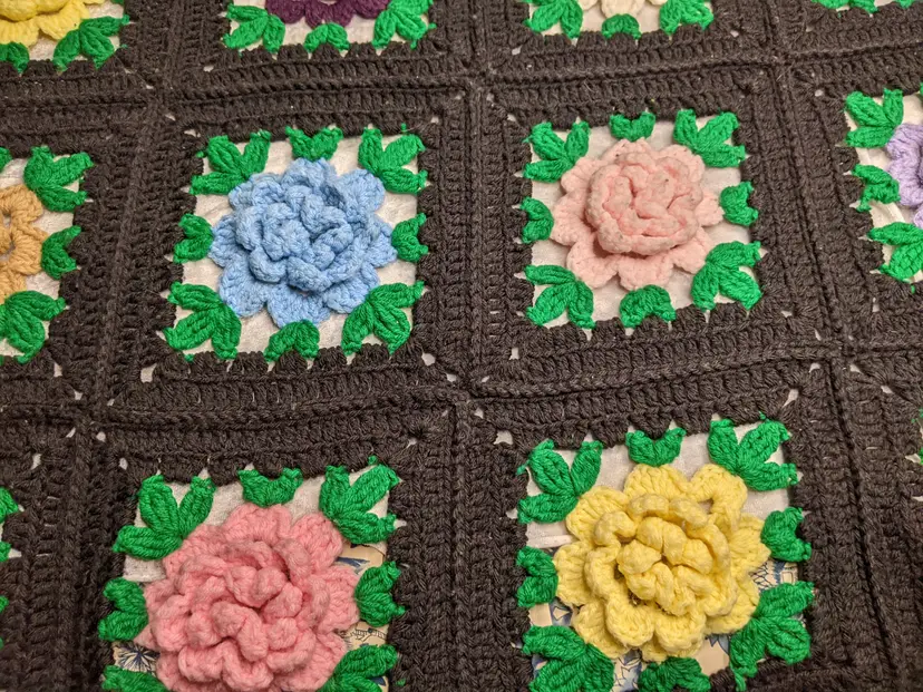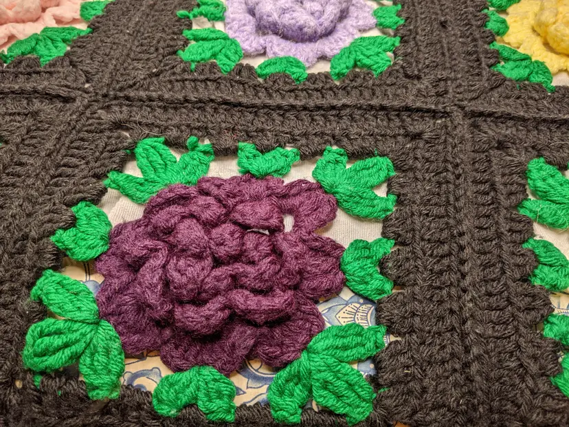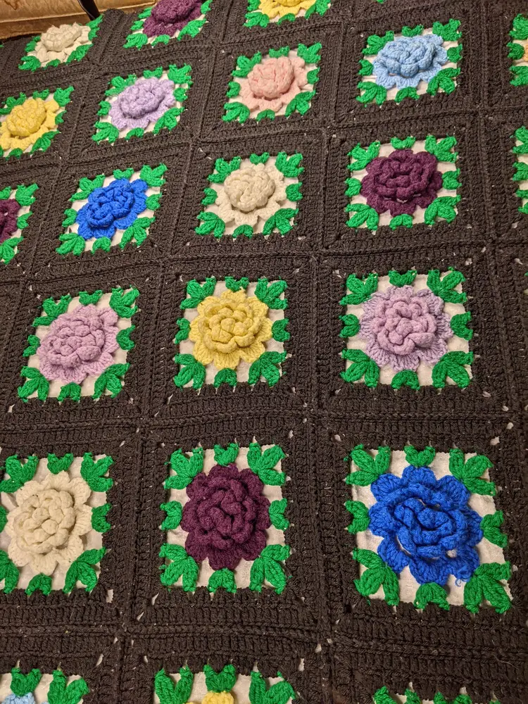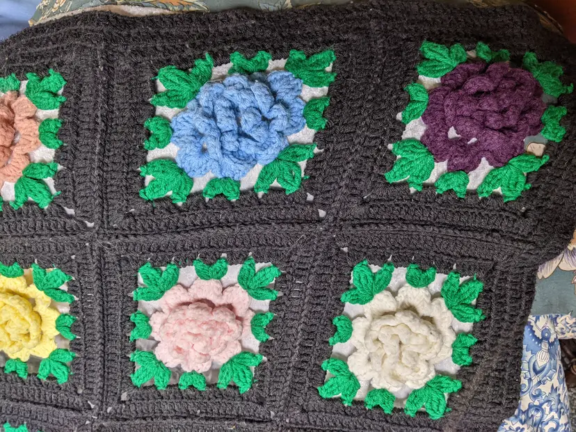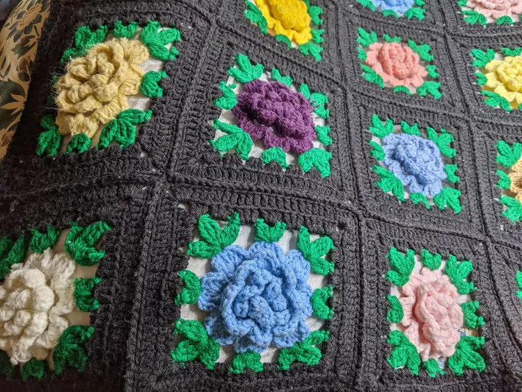 Handmade Crochet Afghan Granny Squares 3 D Roses Black background with Multi Color Blanket Throw 62"x84"Gothic Witchy Decor Castlecore, Bohemian English cottage, Cottagecore will fit into many decors. Very good condition . There are small lengths from there tying off that were not clipped on the back only a few . Clean with no damage. no weird smells. Please check the photos for details. Comes from a smoke free home. We do have pets.
