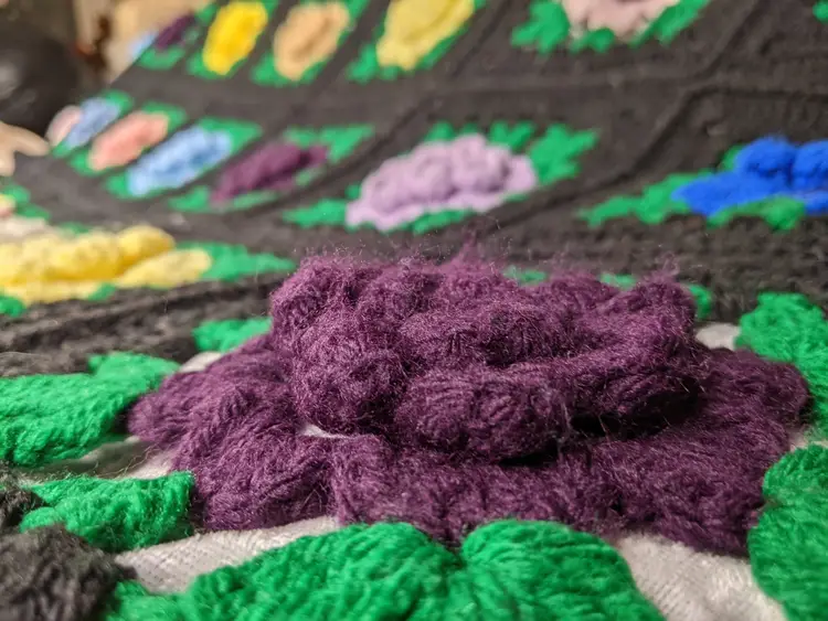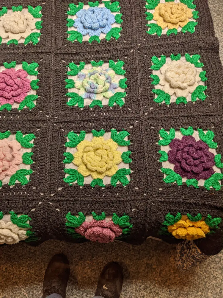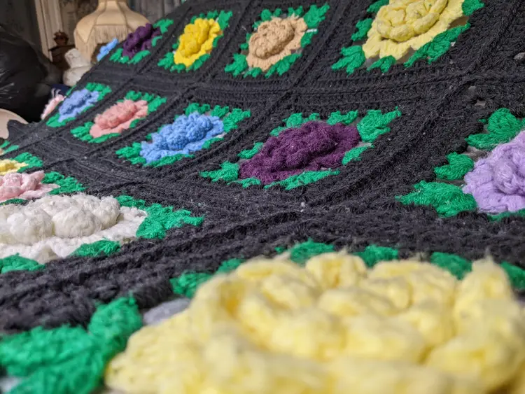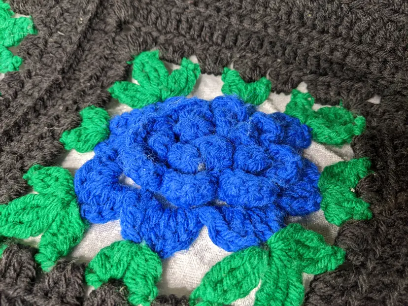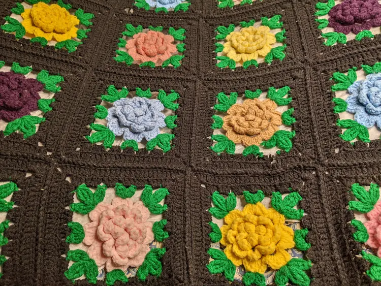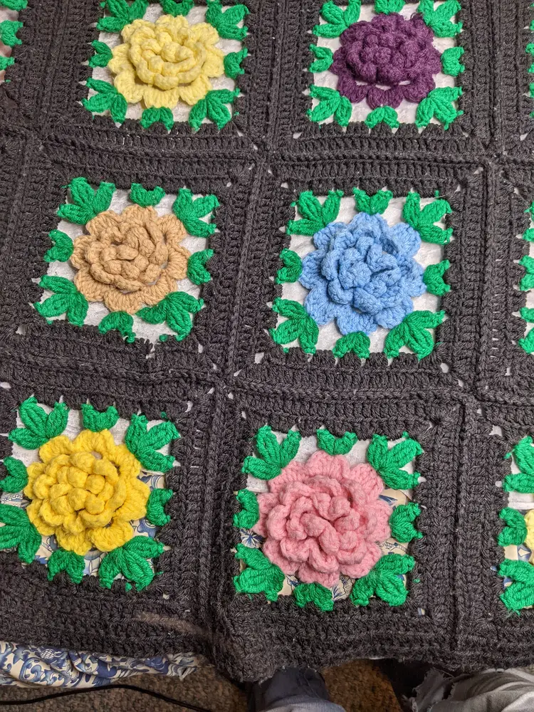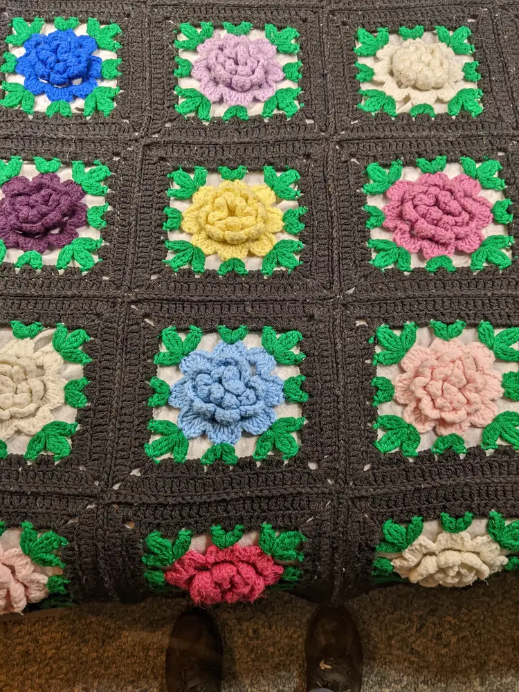 Handmade Crochet Afghan Granny Squares 3 D Roses Black background with Multi Color Blanket Throw 62"x84"Gothic Witchy Decor Castlecore, Bohemian English cottage, Cottagecore will fit into many decors. Very good condition . There are small lengths from there tying off that were not clipped on the back only a few . Clean with no damage. no weird smells. Please check the photos for details. Comes from a smoke free home. We do have pets.