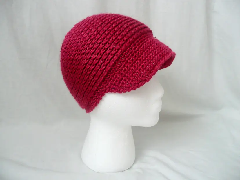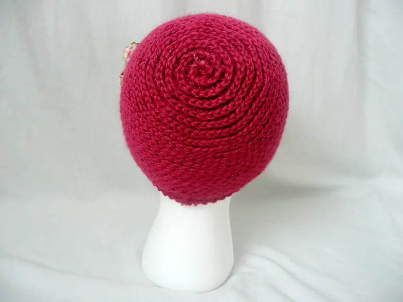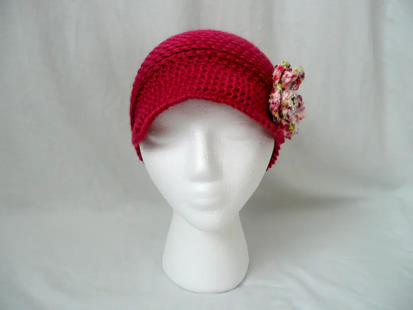 Hand Crocheted in soft acrylic yarn newsboy style hat Beautiful dark berry pink color Crochet flower with pink faux pearl & rhinestone brooch accent Brooch can be removed for easy cleaning approx 20" around and 5 1/2" tall Can be machine laundered but hand wash and line dry for best results