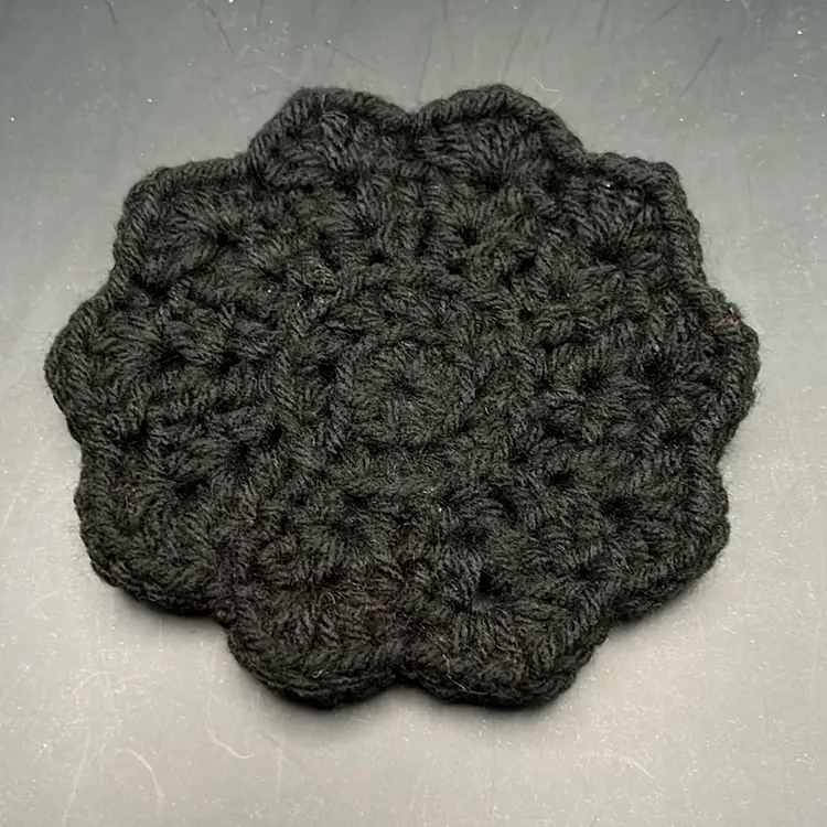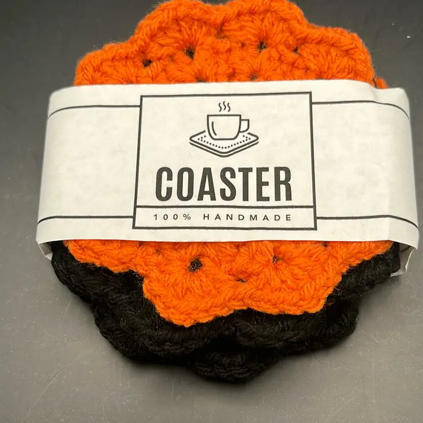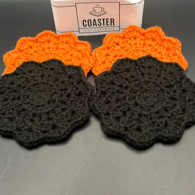 A set of four handmade crochet coasters in orange & black. You will receive two orange and two black coasters.