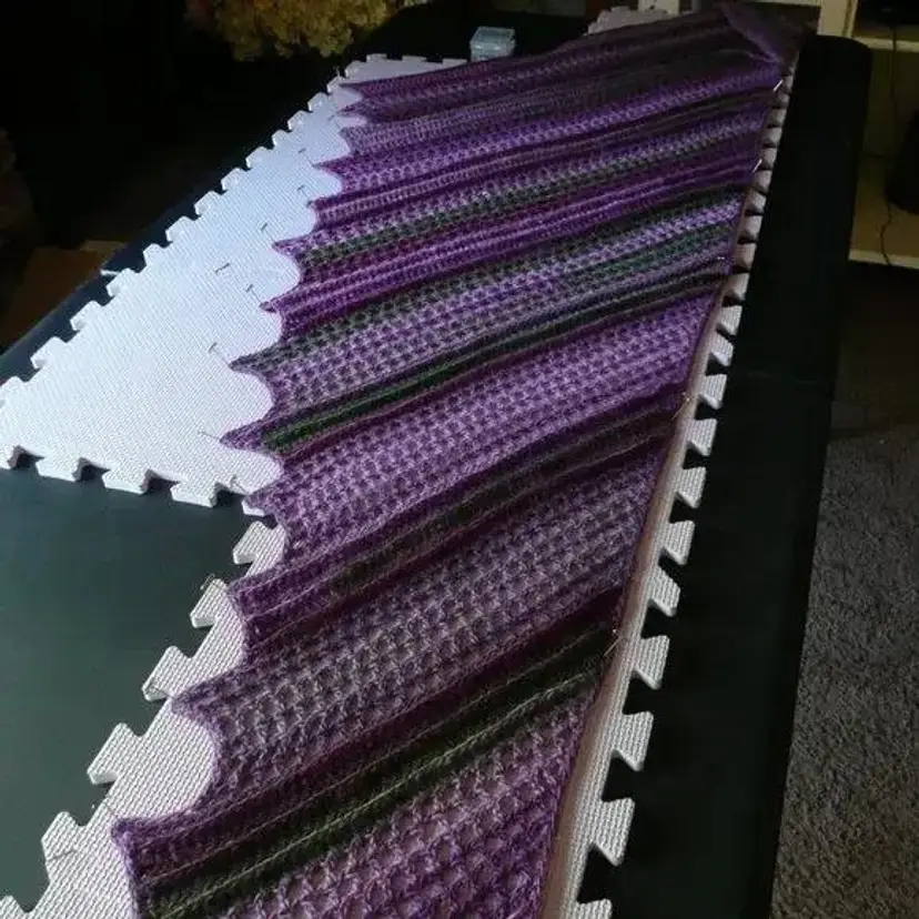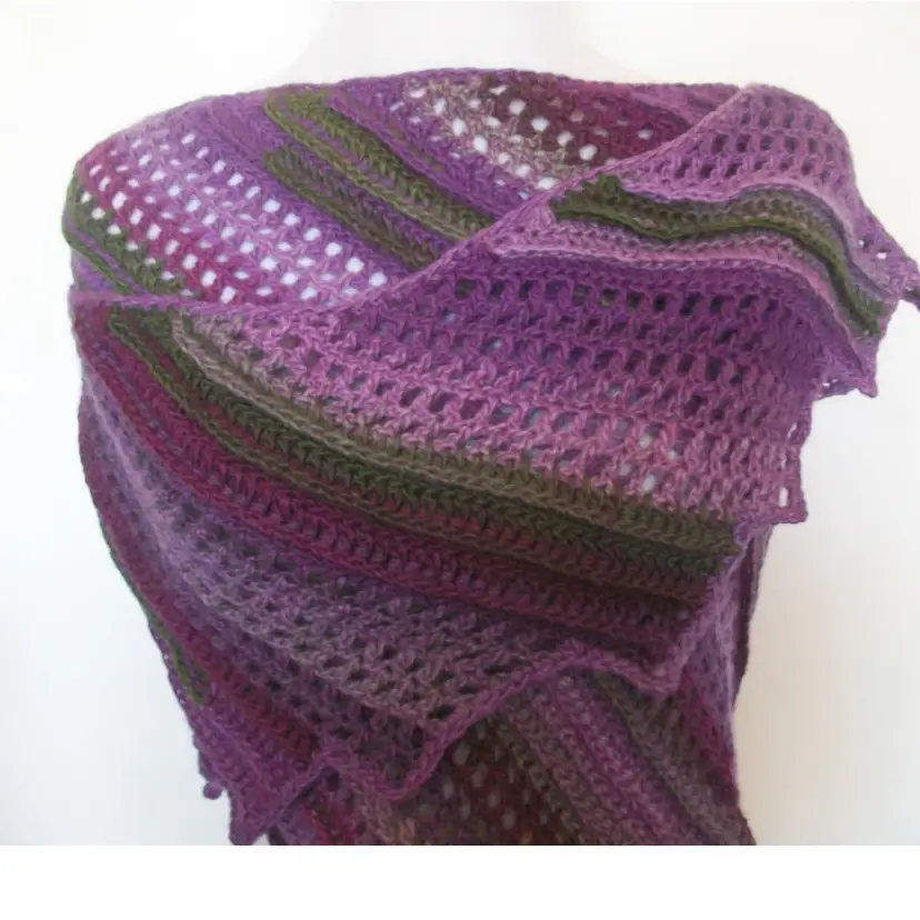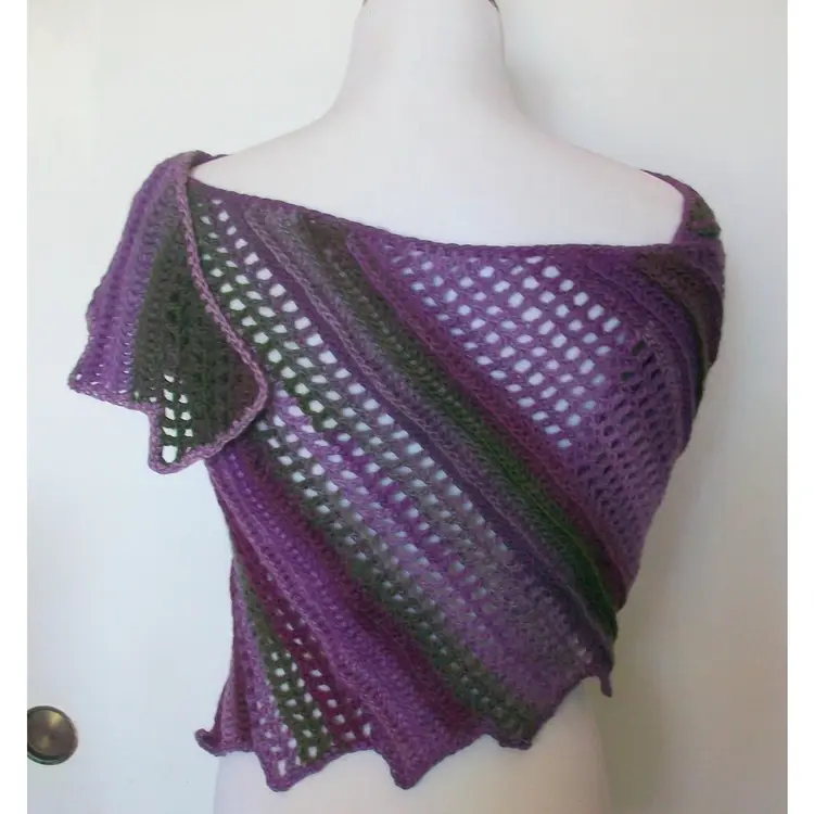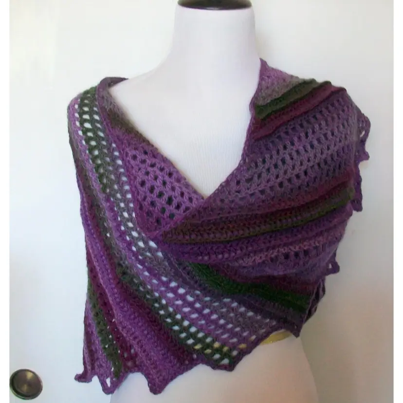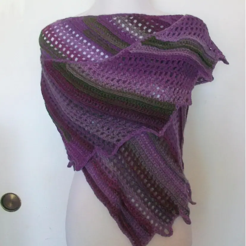 Wrap yourself in this warm and cozy shawl/wrap. Beautiful hand stitched soft wool blend yarn in vibrant shades of purple and green, shaped like a dragon wing. *Hand wash in cold water and line dry for best results Measures Approx 23" x 74"