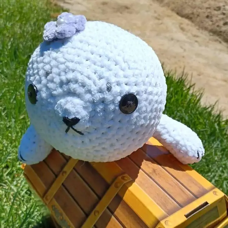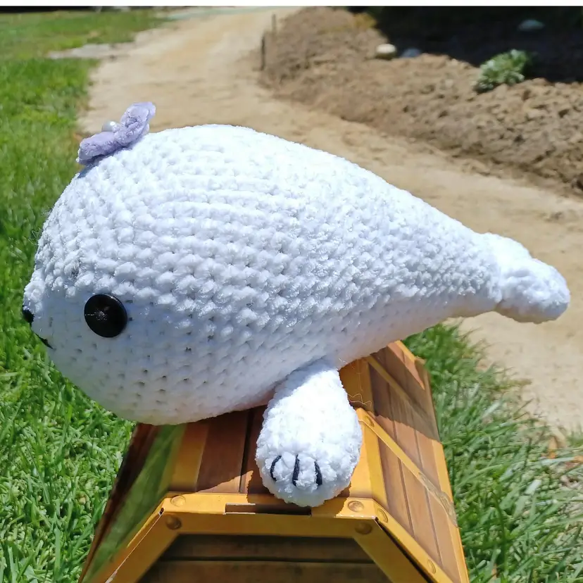 Meet your new cuddly friend! This adorable handmade crochet white seal plushie is perfect for adding a touch of whimsy to your home or gifting to a loved one. Soft, cute, and full of character! Made with plush yarn and accented with a cute little flower. Made with 100% chenille yarn 14 x 6"