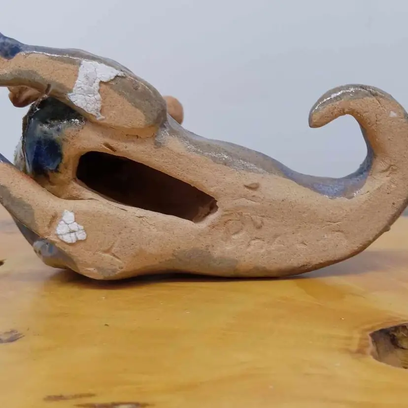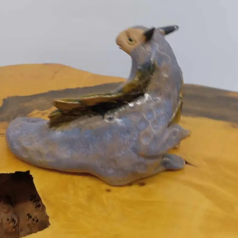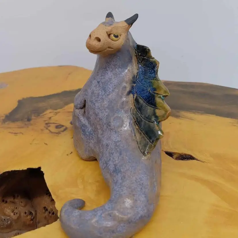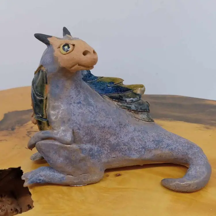 Here's a cute handmade dragon. He's purple with blue spikes and is 3 x 4 inches. No chips or cracks.