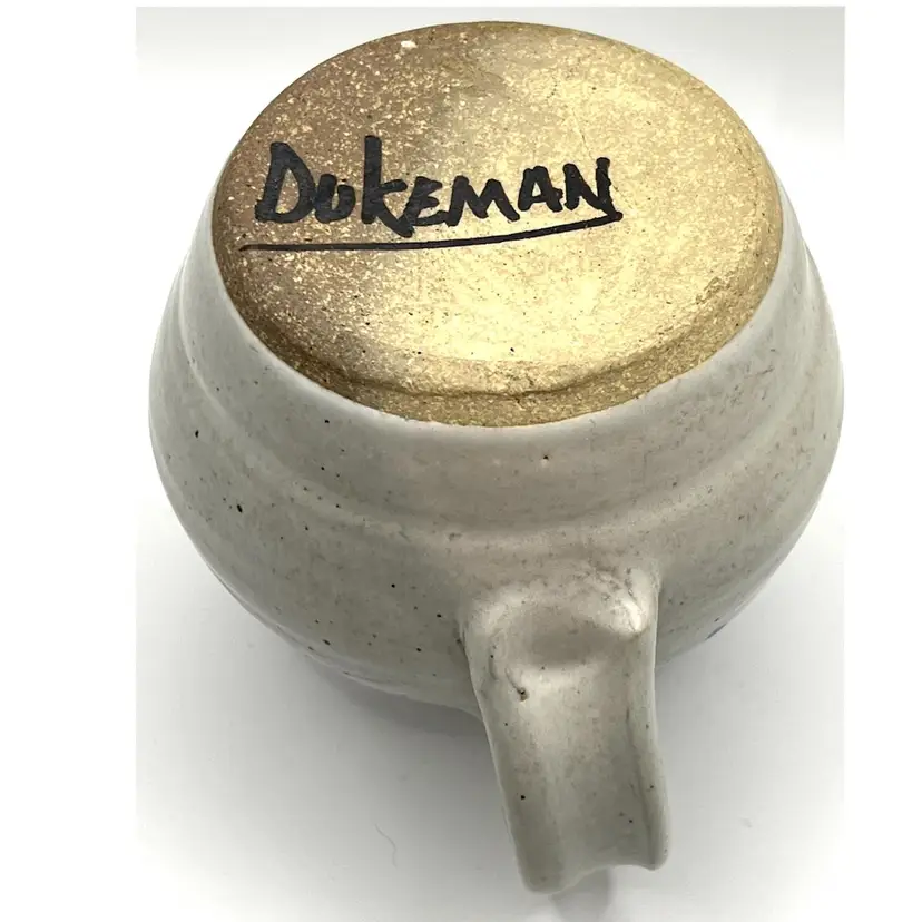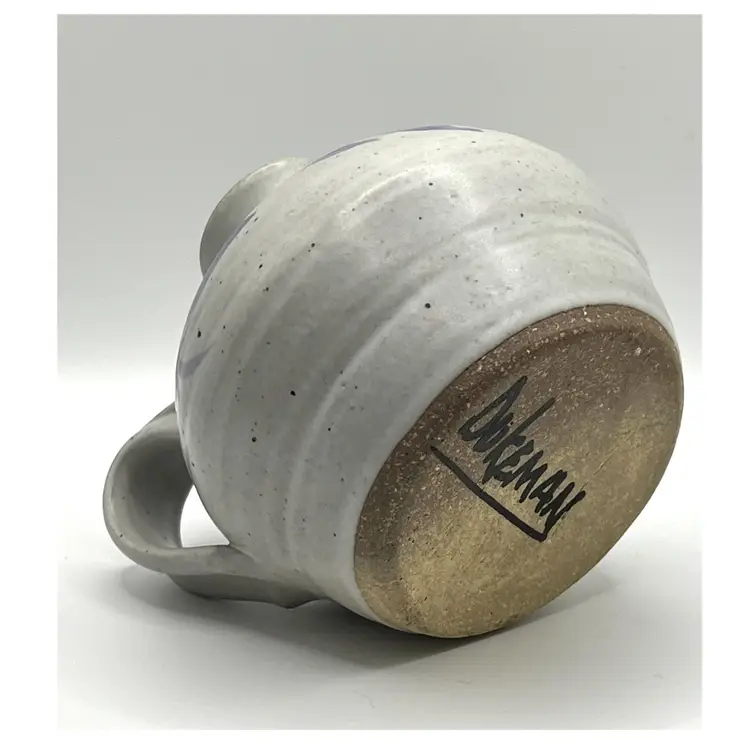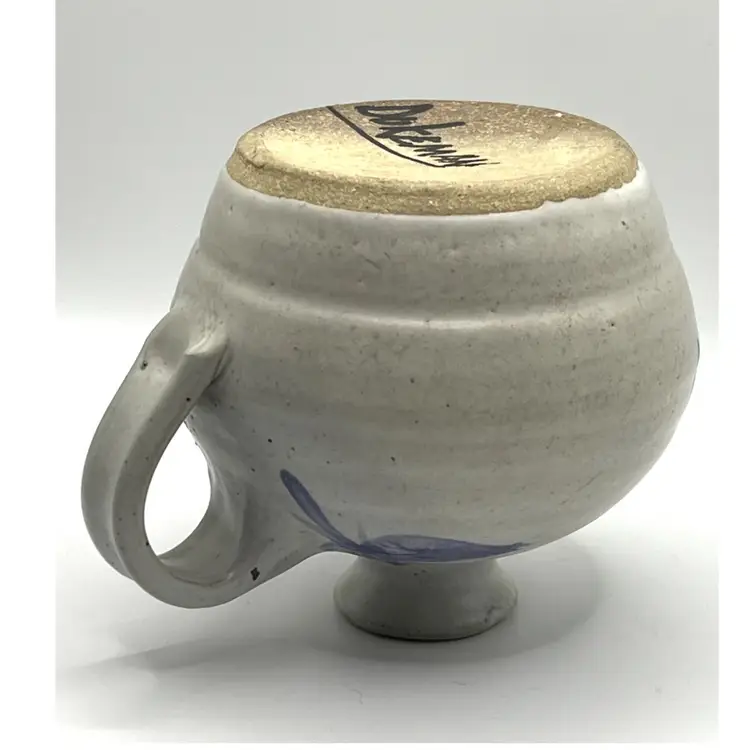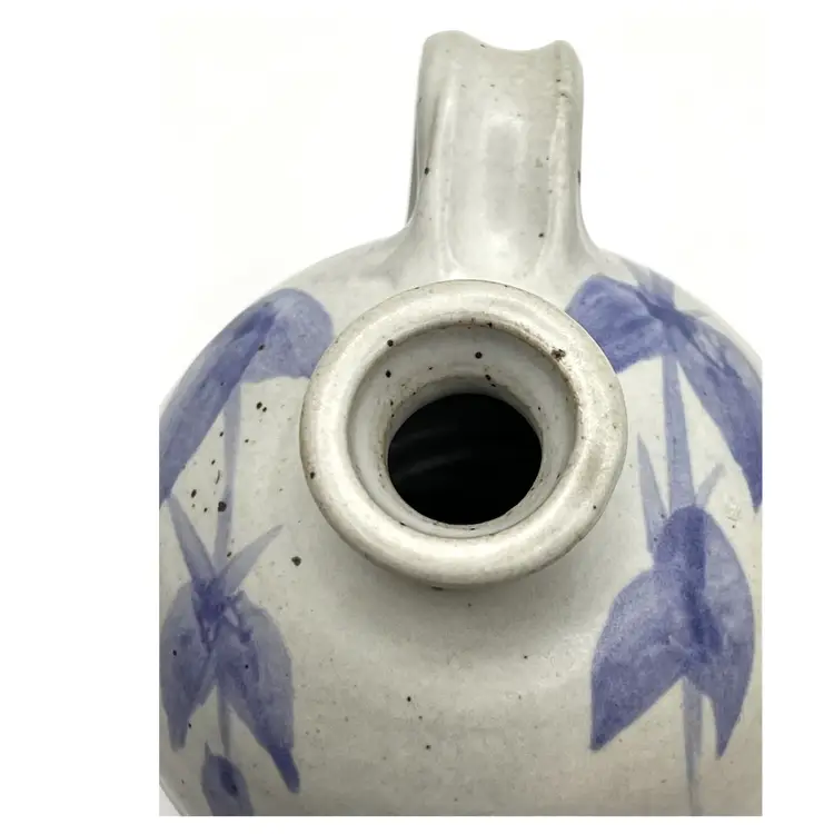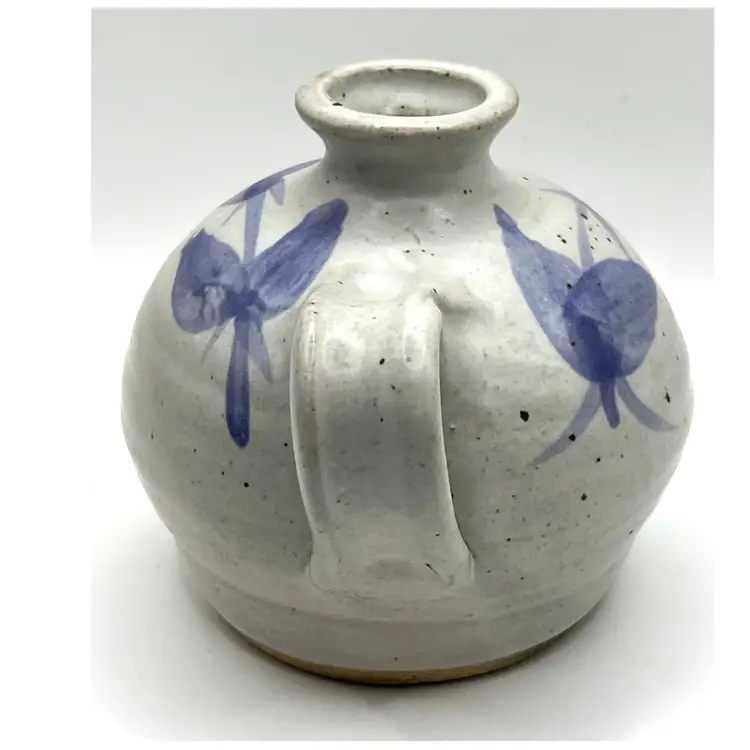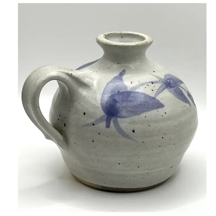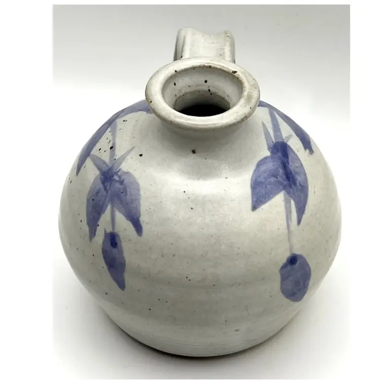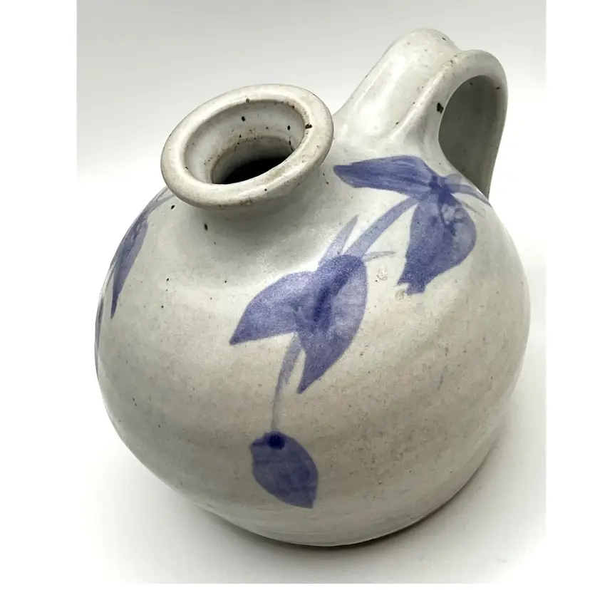 Handmade Dukeman Studio Pottery Ceramic Grey Blue Leaves Bud Vase with Side Handle 4 in Height, 1 in Top Diameter. Small crack line at the bottom (SEE PHOTOS)