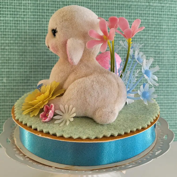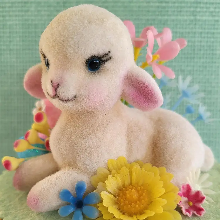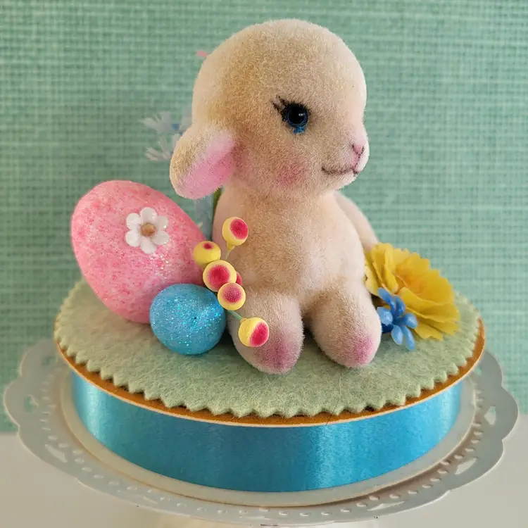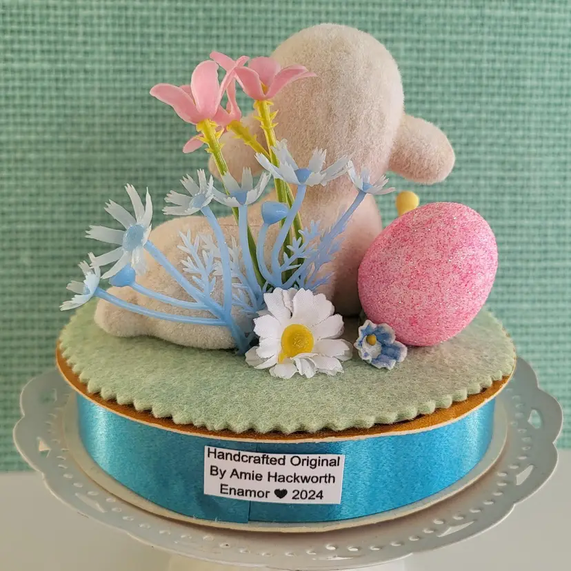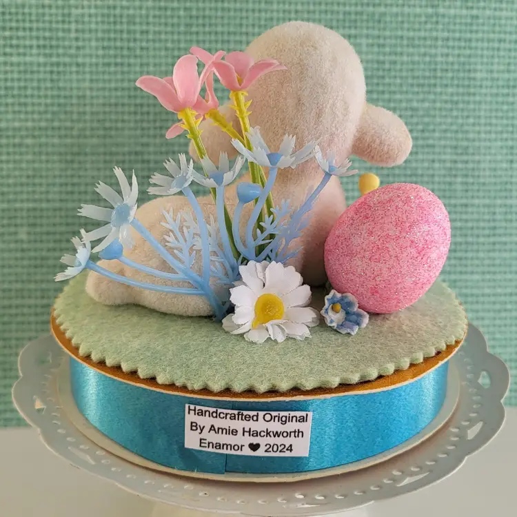 Handmade by me, Amie Hackworth. Base is a vintage spool of ribbon. Features a vintage flocked lamb, vintage plastic flowers/stems, vintage milnery, vintage felt. New glitter eggs. Signed on the back. Measures 4.5 inches x 4 inches. Perfect for a gift or spring display!