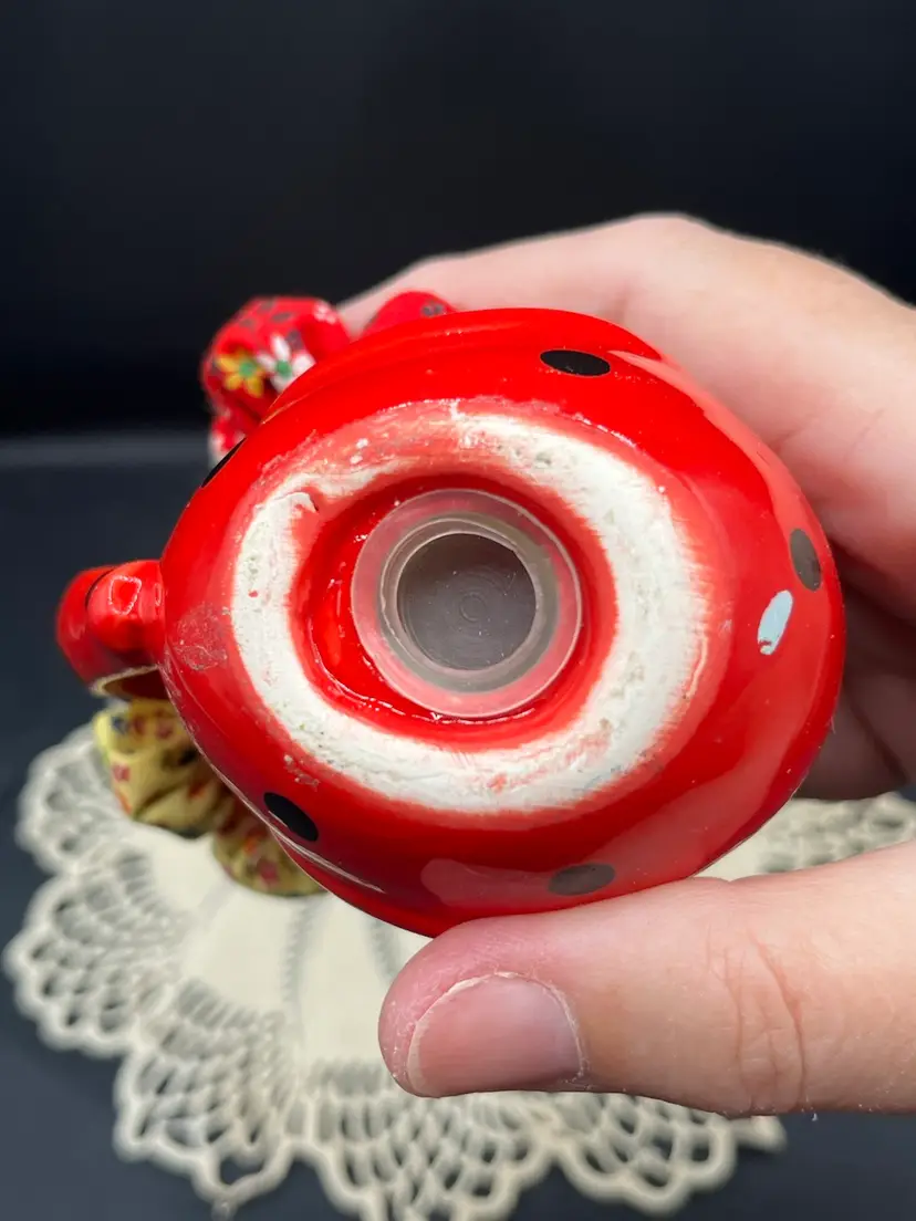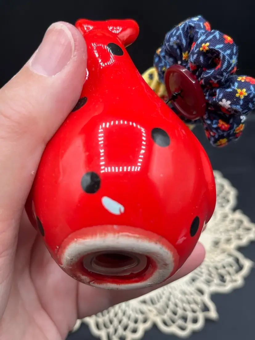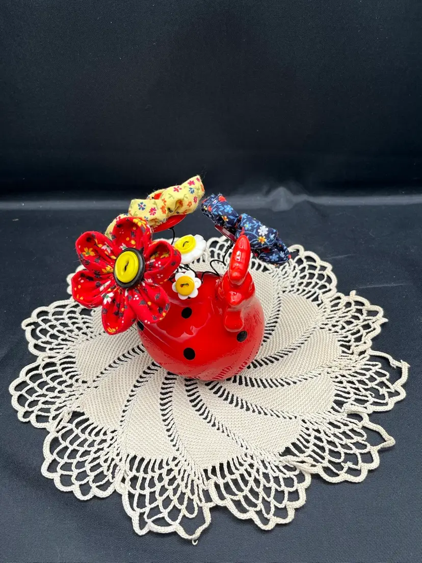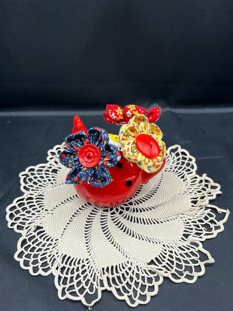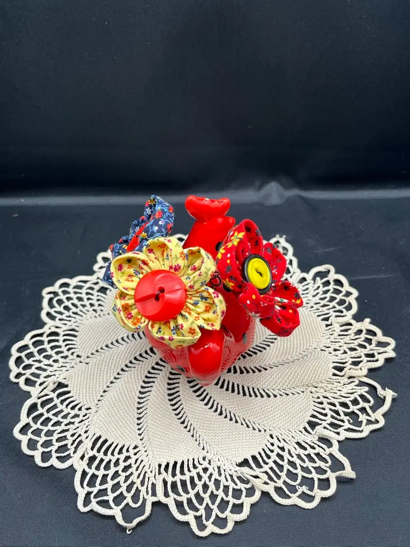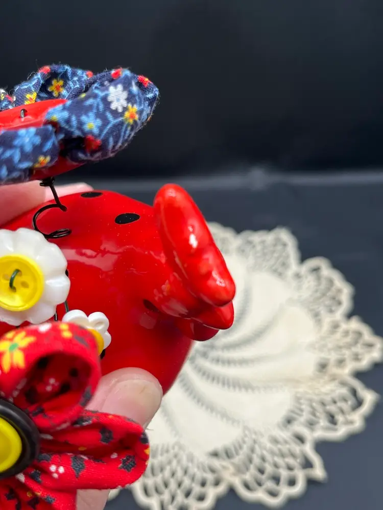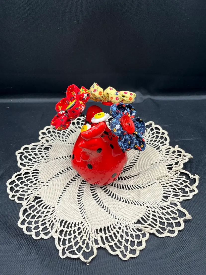 Red chicken salt shaker with black polka dots. Hand sewn fabric and vintage button flowers. 3.5” x 3.5”