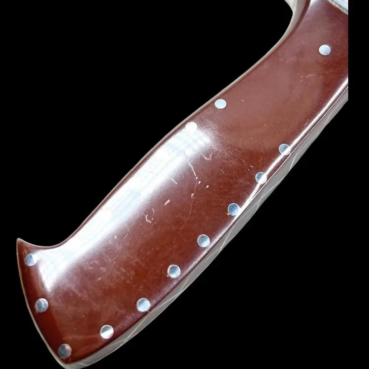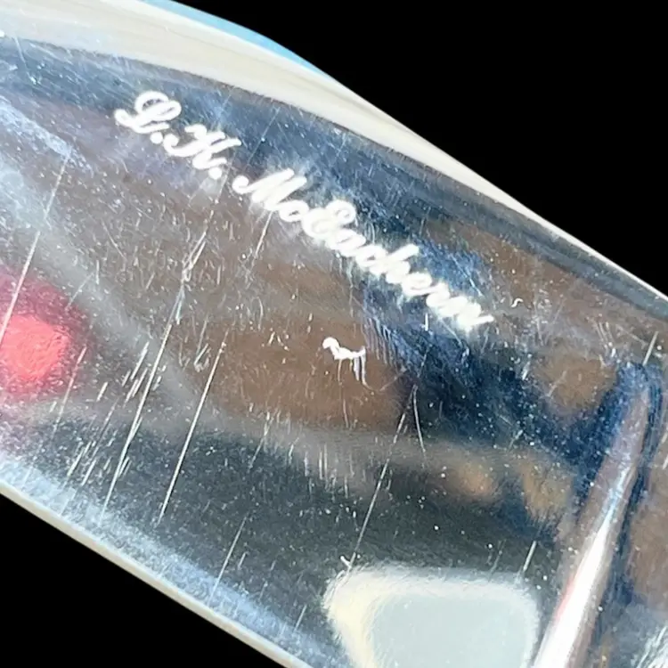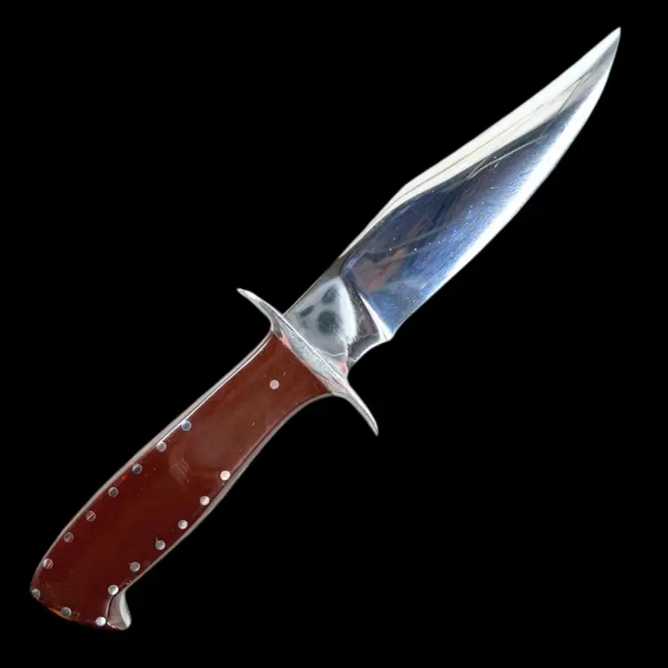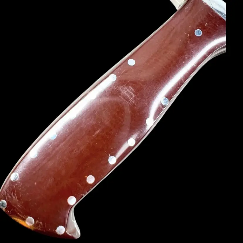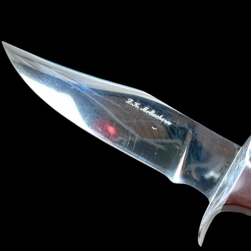 Beauty of Knife! Handmade Fixed Blade Hunting Knife. Maker- Larry K. McEachern, Georgia, USA. Leather sheath. Name etched in blade. Condition- Minor scratches on blade. Wear scratches on handle. Please see photos. 10-1/2" overall. 5-3/4" blade. Total weight 12 ounces.