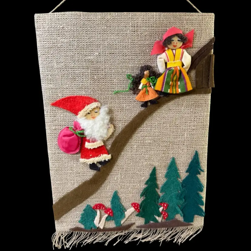 11”x8”. Hangs from rope cord. I believe it has Polish imagery.