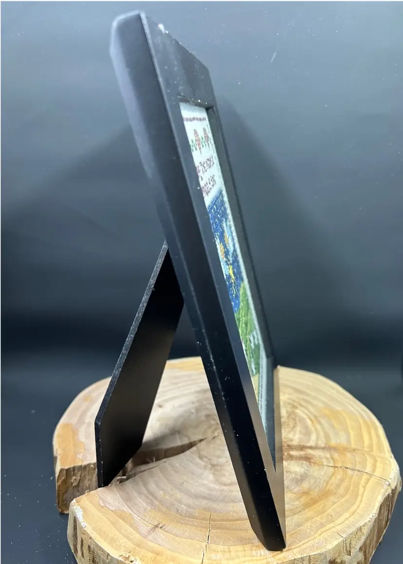 Framed Christmas counted cross stitch in a black wood frame with an easel back that can also be hung on the wall. Frame size is 6 6 1/2” x 8 1/2” and 1/2” thick.