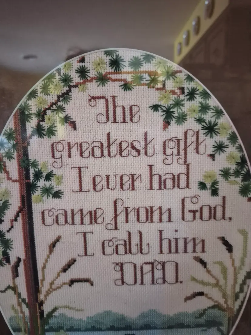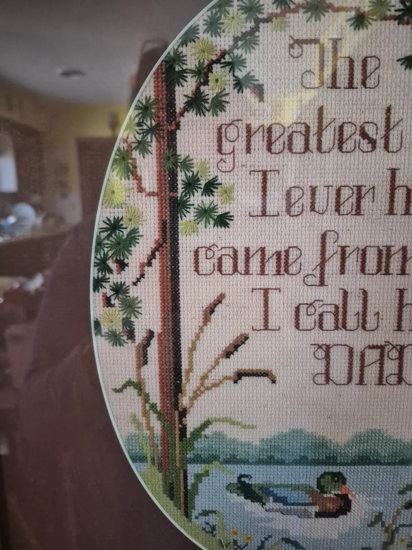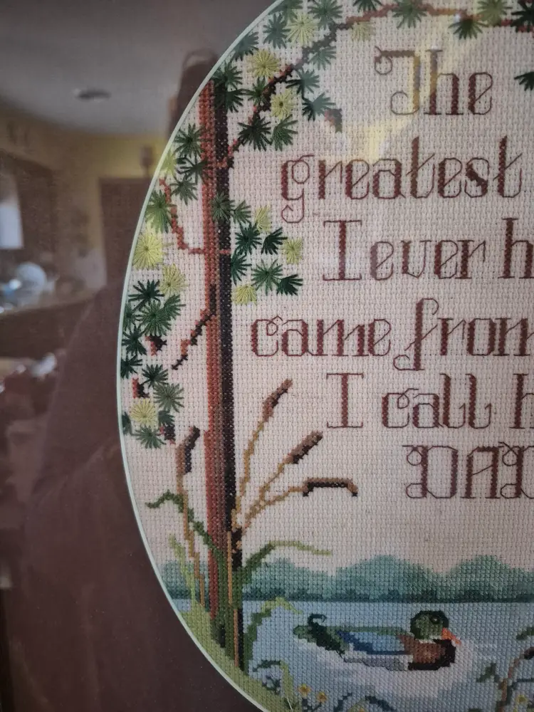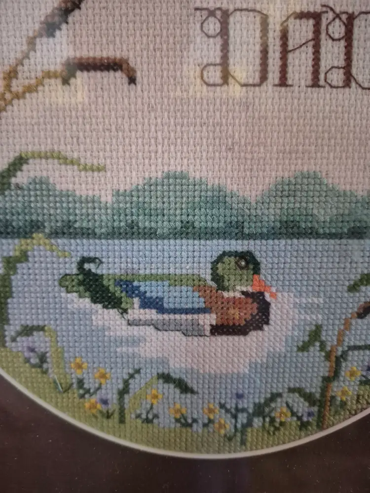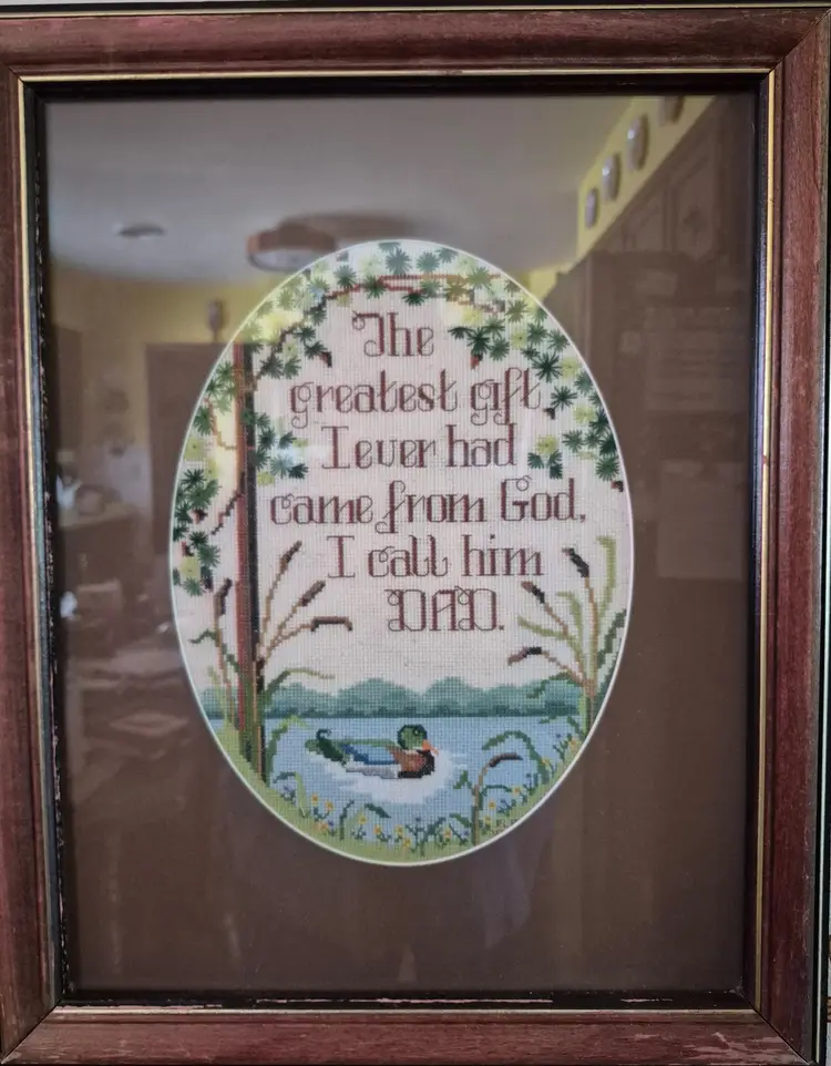 This is a signed (on the back of the framing cover, by Robin L. Brown 2006 Cross Stitch Project that I finished and had framed for my father. He passed away in 2011 and it is time for someone else to enjoy it or gift it to their father. The Framing was done by Picture Perfect in Brunswick, Ohio and at the time the frame, matting etc cost $40. Unfortunately, after my father passed away, the project wound up in a storage area with not much care given to it. When I found it, I cleaned it up as best I could, but the frame does have some damage to its finish. It could easily be reframed, and if anyone chose to do that, I could make out a COA that this was my work. as the fabric itself is not signed.