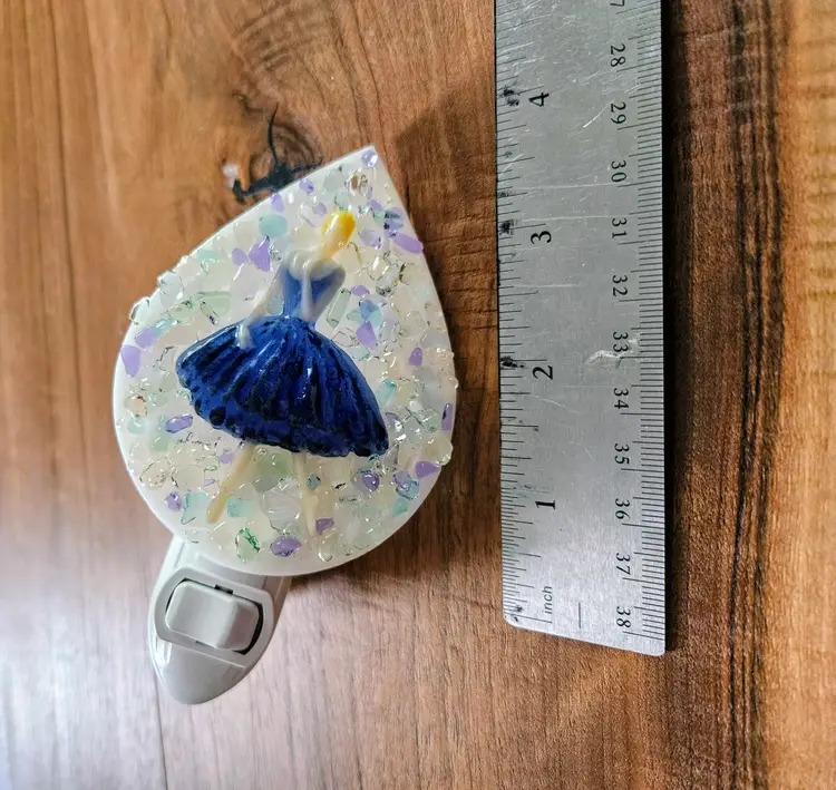 To create this lovely night light, I first created the dancer. I mix glass powder and water, layer it in different silicone molds, and then freeze it solid. Once frozen, I remove it from the mold onto a kiln shelf. Next, it is fired overnight in the kiln. During this time, I work on the other pieces. Using a glass cutter and other tools, I cut the teardrop shape for the background. Once the glass is cut, is taken to the grinder to smooth it out and make sure it is even. Once the dancer is finished, I add her to the teardrop piece and then I added chunky iridescent glass pieces all around the dancer so that it will shimmer and shine when lit. It goes back into the kiln on something called a tack fuse. Once cool, I clean it up and add the night light hardware.