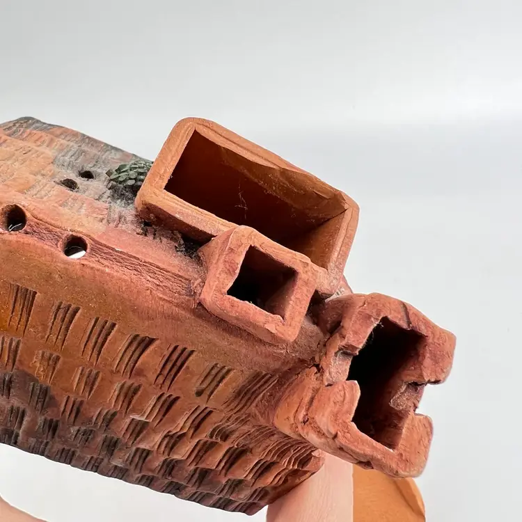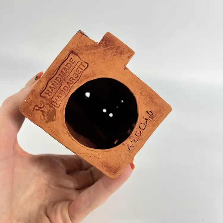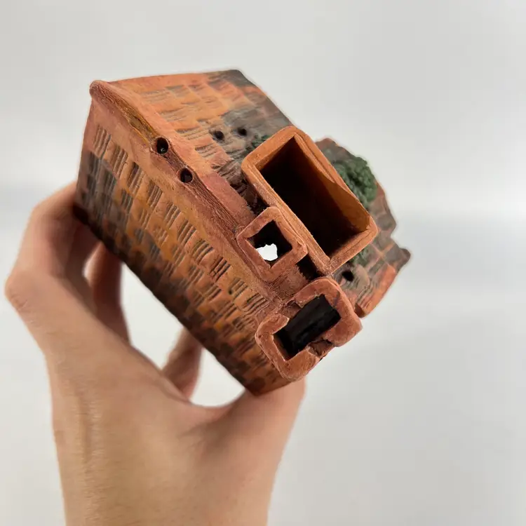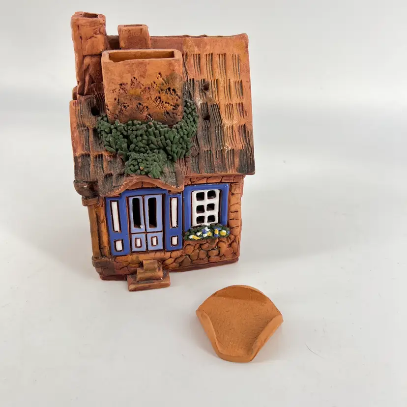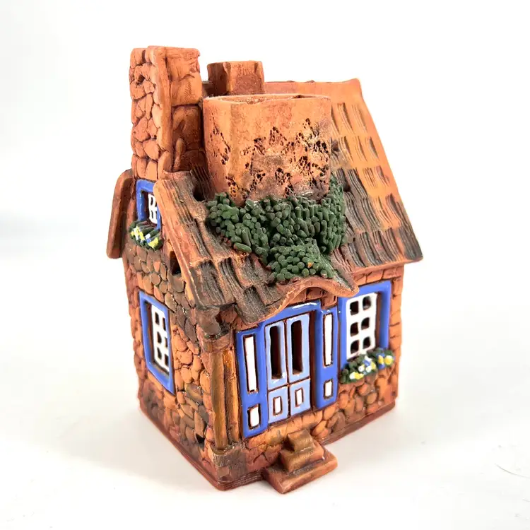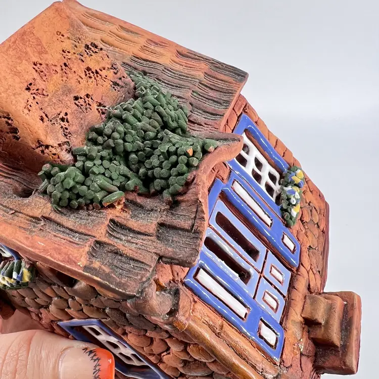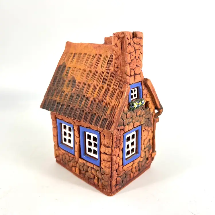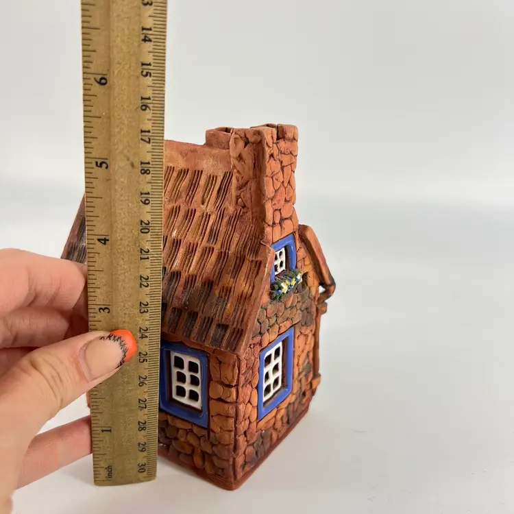 This handmade candle house is made in Germany. It is marked handmade in German. There is a chip on the inside of the chimney--see photos. There are also some light chips on the textured details. It measures approx 5.5" tall and 3.5" wide.