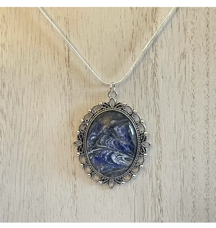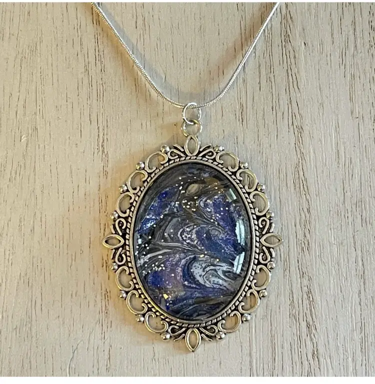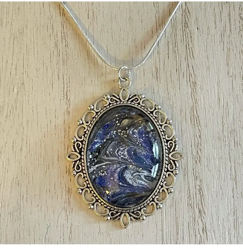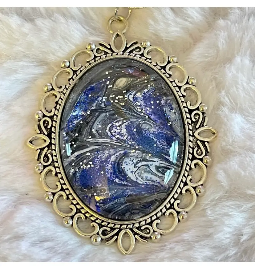 Glass marble galaxy pendant framed in a silver tone decorative bezel. Different lighting and different angles will make this pop! Handmade