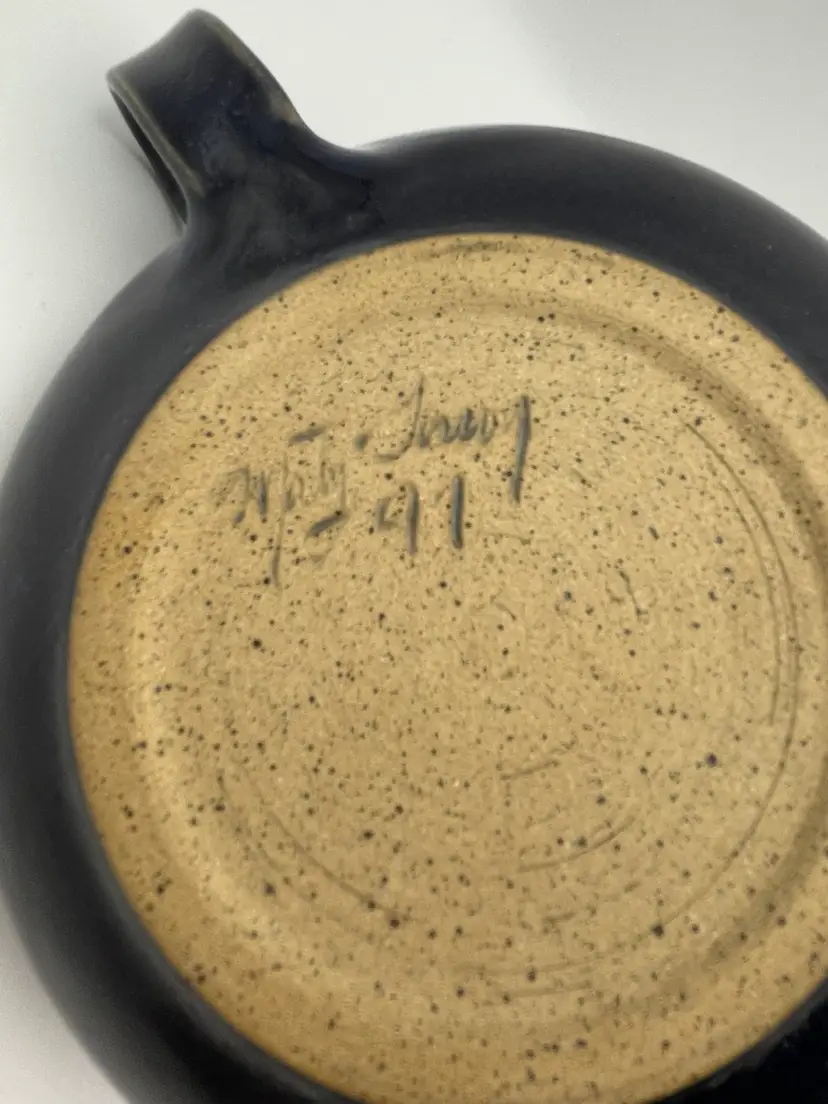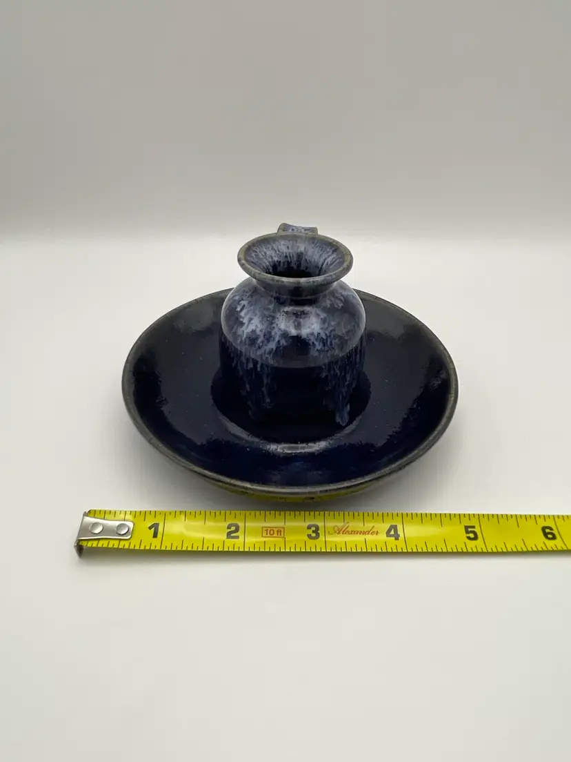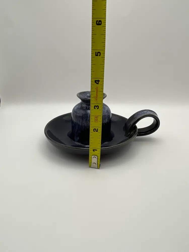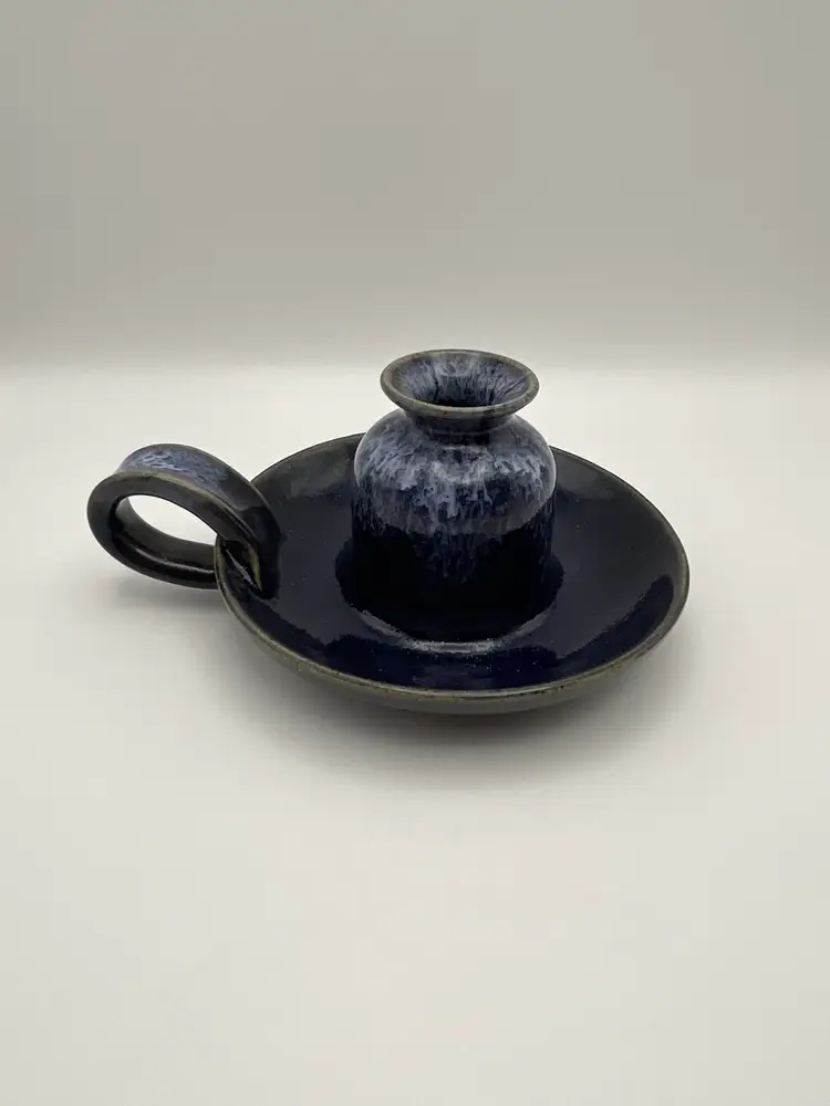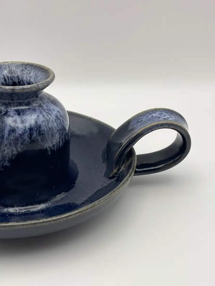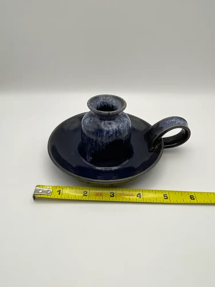 Handmade, Glazed Pottery, Candleholder with Handle Navy Blue/Lt. Blue Drip Glaze, Artist Signed on Bottom (Candle not included)