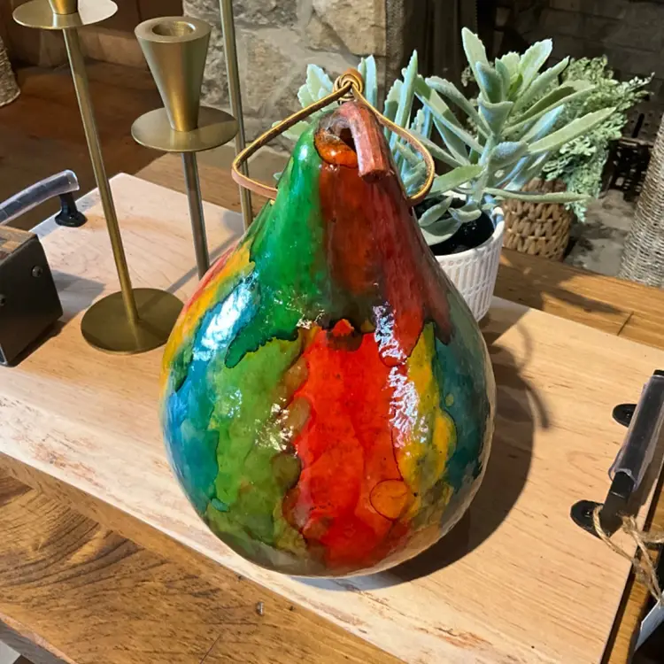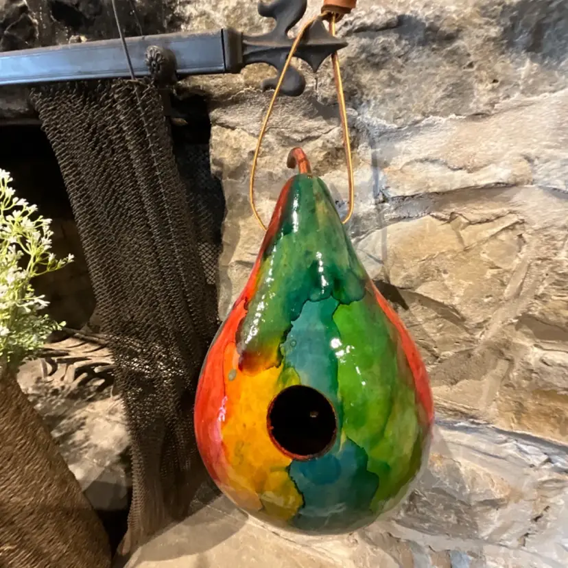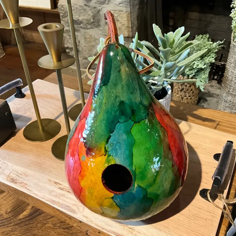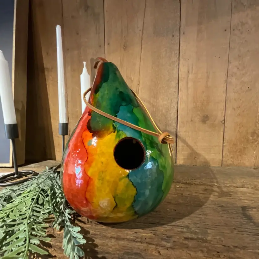 Gourd Birdhouses from Pennsylvania. Hand grown, hand dyed and ready to hang. These our my tie dyed gourd birdhouses. A variety of colors. Look amazing in any tree. Gourds are a natural bird attraction, they love them! This is a 7-8 inch Martin gourd, grown and crafted in Pennsylvania with a raw hide strap and water/ air holes on the bottom of the gourd for protection. Perfect for wrens. 7-8 inch gourd. tie dyed gourd birdhouse, with all colors, listing many other colored and hand painted birdhouses soon. Enjoy!