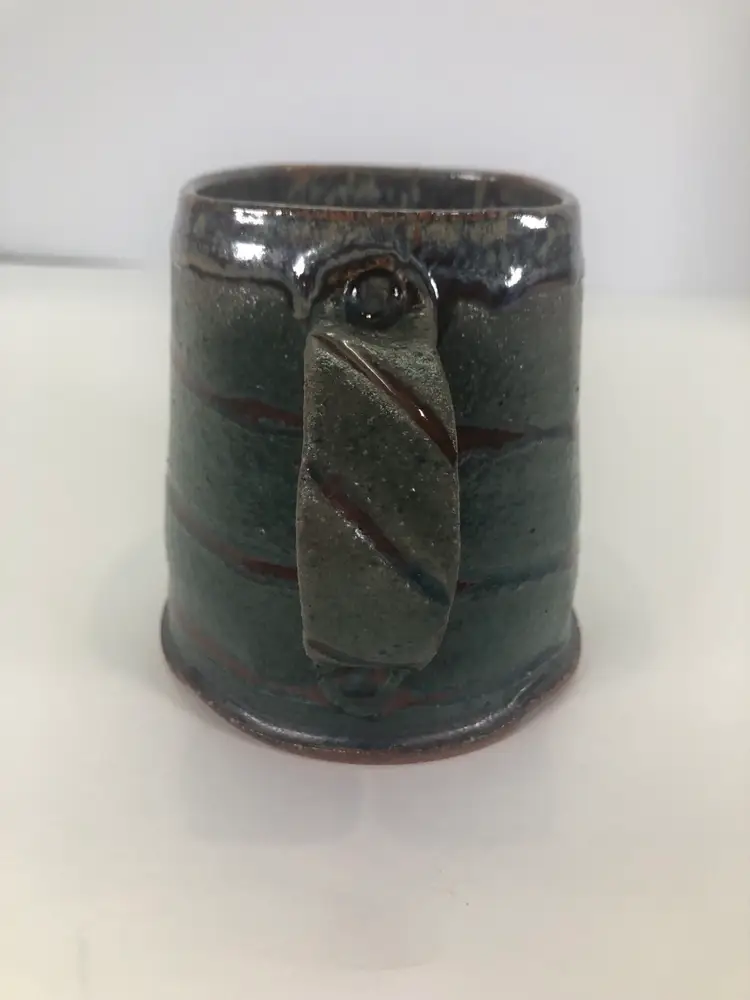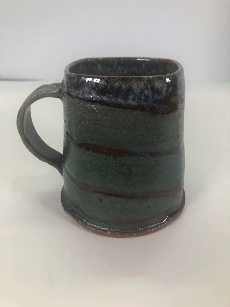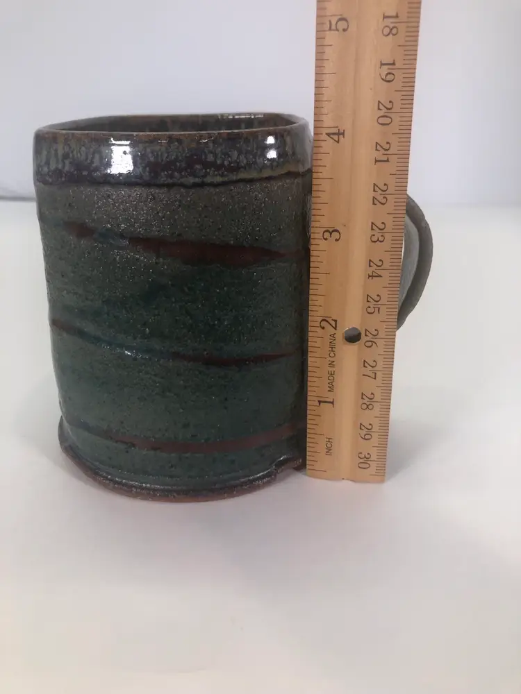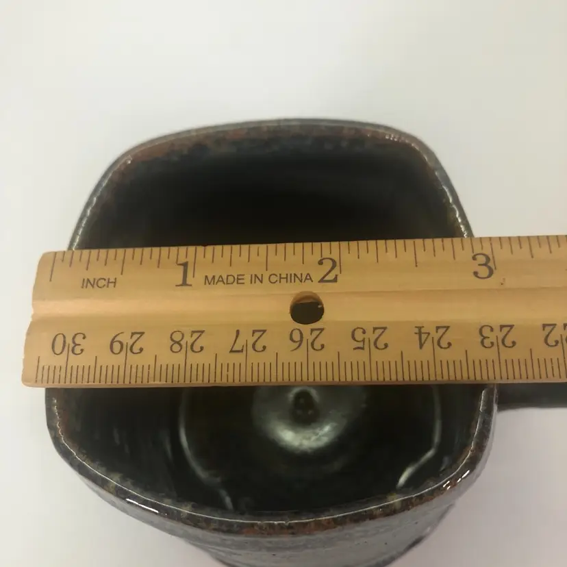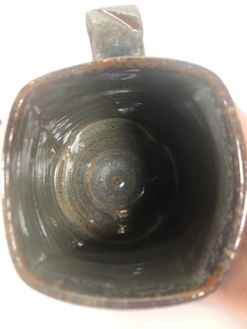 This mug is 4” tall and 3” across the top. The top has a square shape and more rounded at the bottom.