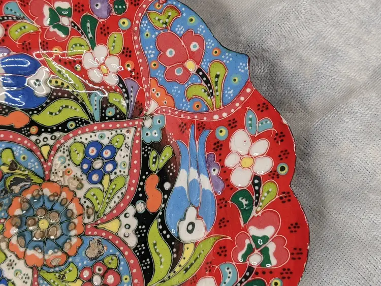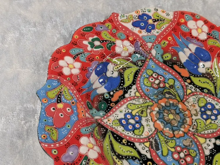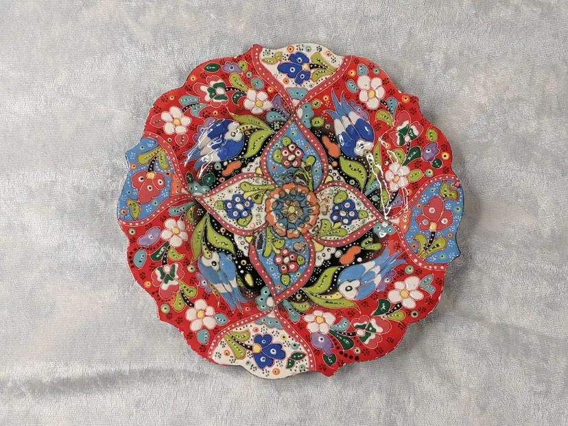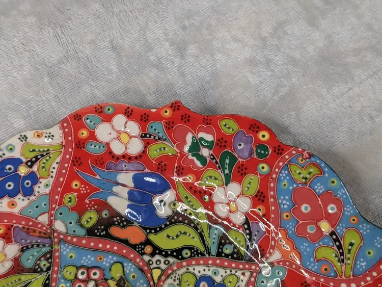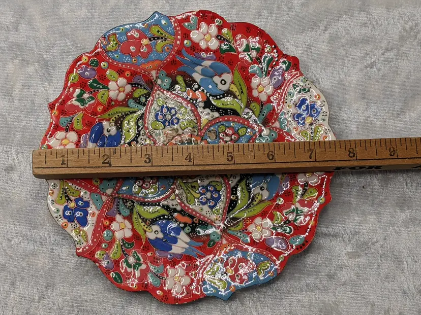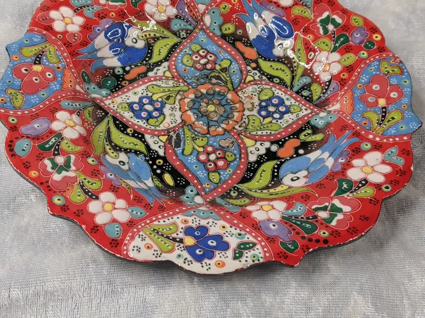 Handmade Hand painted Turkish Ottoman Ceramic 8 inch red Plate with flowers . Very colorful pretty print. Hanging Wall Boho Bohemian decor Decor Very good condition there is a small bit of rough spots on a couple of the points on the back sides but not noticeable when hung on the wall. Not sure if they are small flea bites or just how they were pulled from the mold. It does not take away from the beauty of this plate. Please check the photos for details. Comes from a smoke free home.