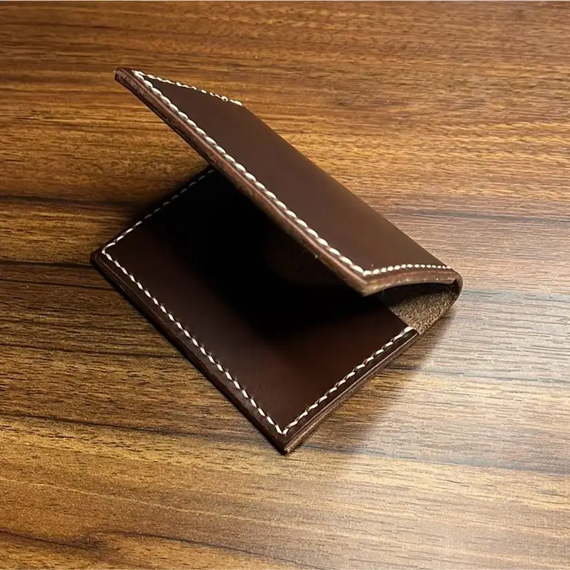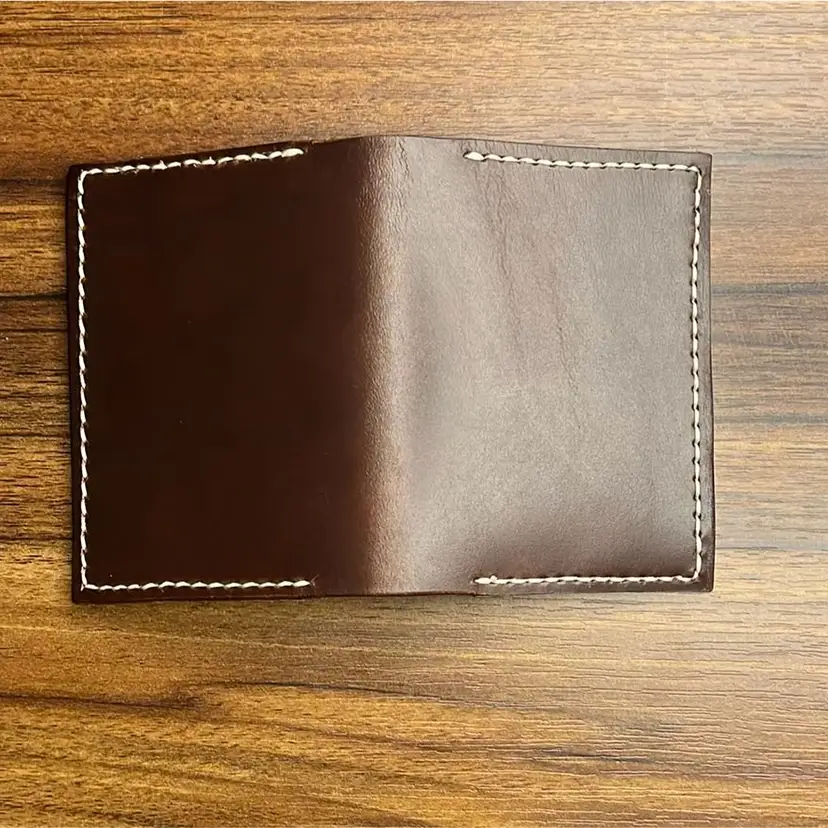 3x4” Handmade. By me. In Texas. Simple brown CXL leather bifold with two interior pockets. Saddle stitched using cream-colored, waxed Tiger thread.