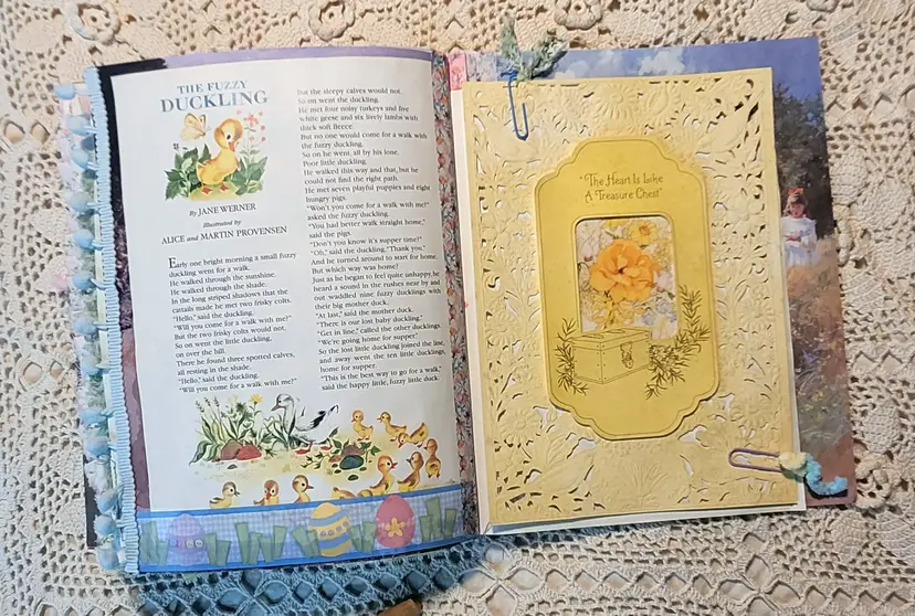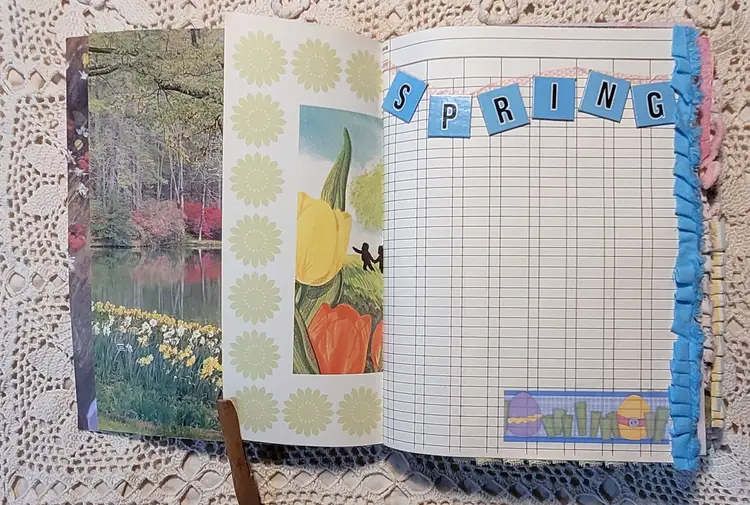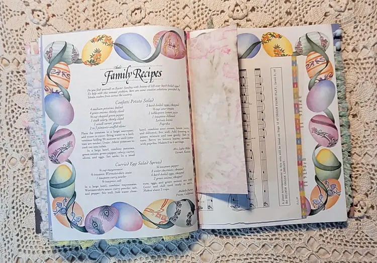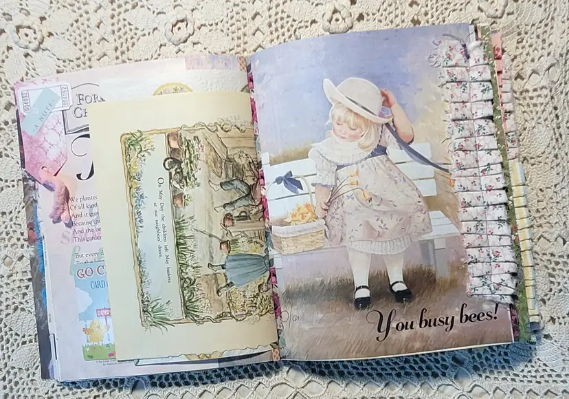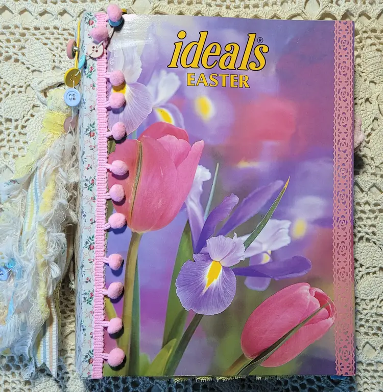 The spine is hidden and includes many pockets, tucks, and envelopes. I've added many handmade ruffles and ribbons. The pockets include many handmade ephemera and the journal is made in the spring/Easter theme. The perfect companion for journaling and will provide you with many places to record all your wonderful memories.