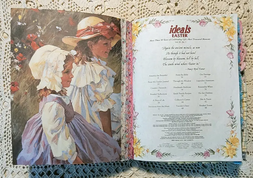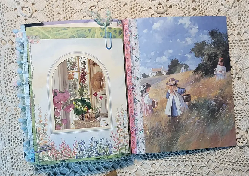 Journal details: Repurposed magazine softcover Front and back 102 hand-bound pages The journal is 11" x 8 1/4" with a 1.5" spine Paper doilies Ruffles Many different papers including tea-dyed, writing papers, children's writing papers, ledger pages, digital & scrapbook paper