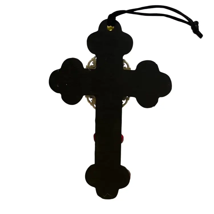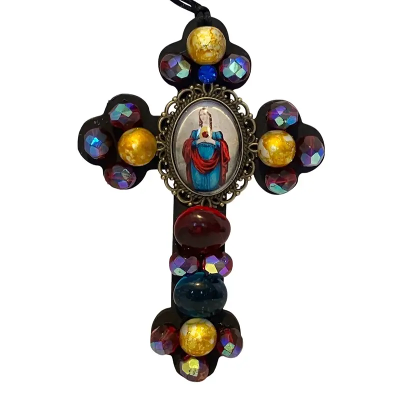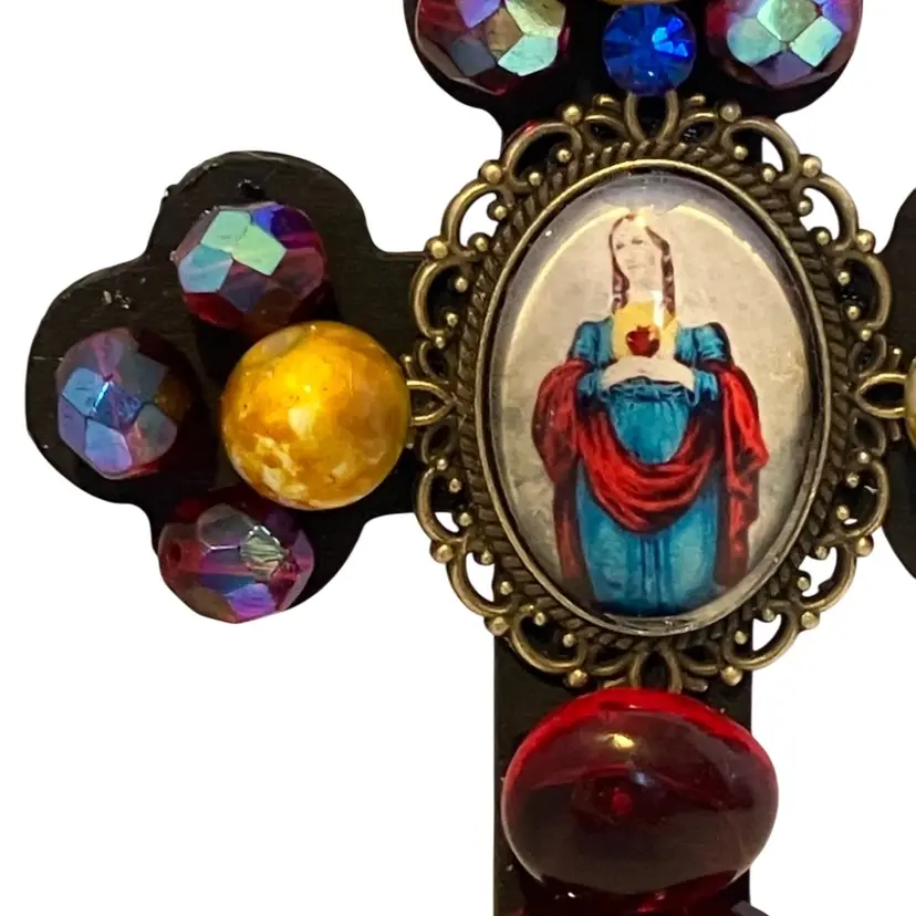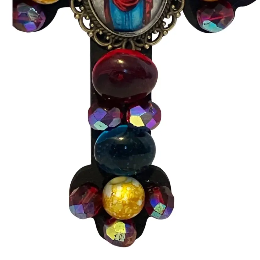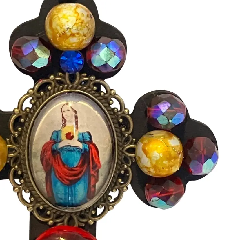 I just started making these beautiful crosses just in time for Christmas! This cross is made from a wood base that measures 4” x 2.5” and has vintage and new plastic beads and glass stones applied with glue. Just the right size for a Christmas tree or can be used as a small wall cross.