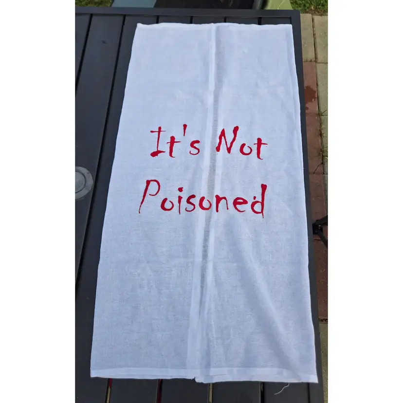 Handmade kitchen towel with 'It's Not Poisoned' text in red. Perfect for adding a touch of humor to your kitchen decor. 100% cotton flour sack towel, permanent vinyl design.