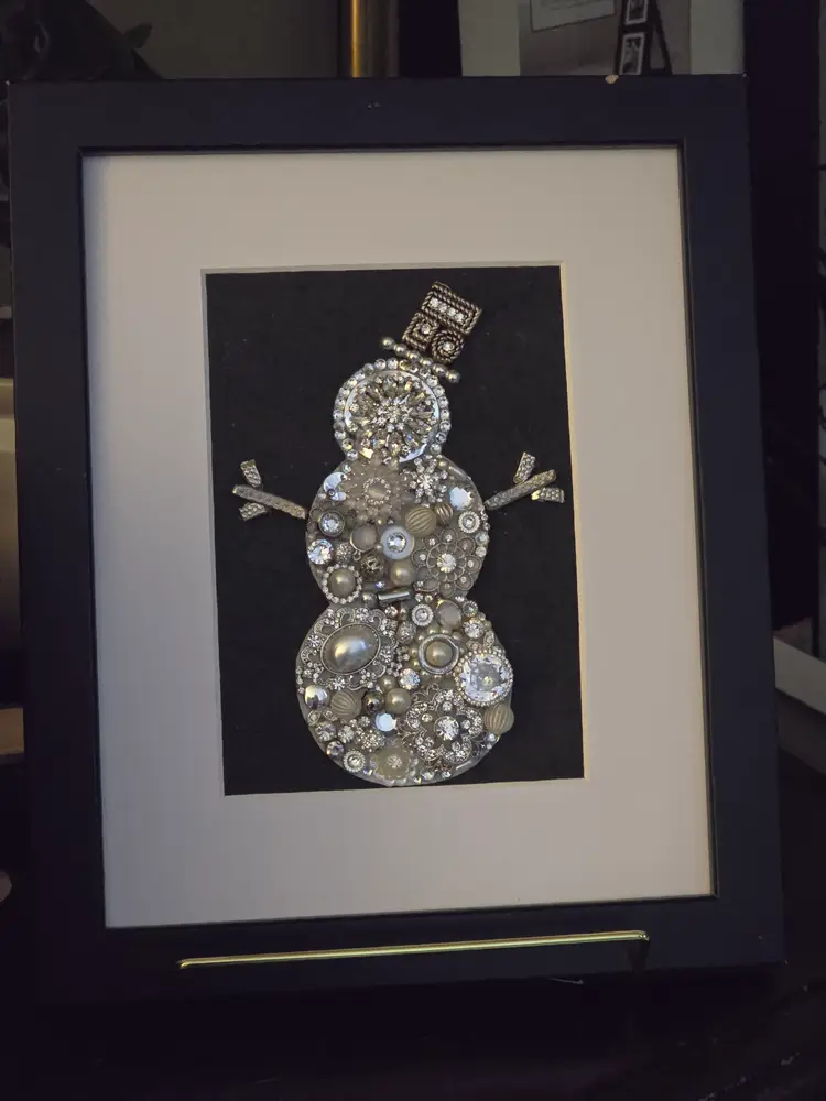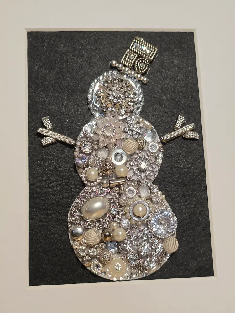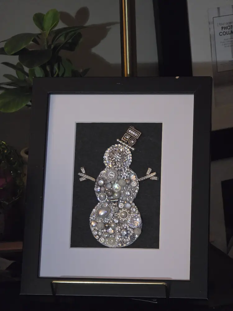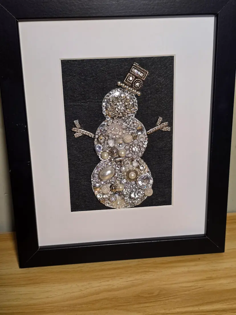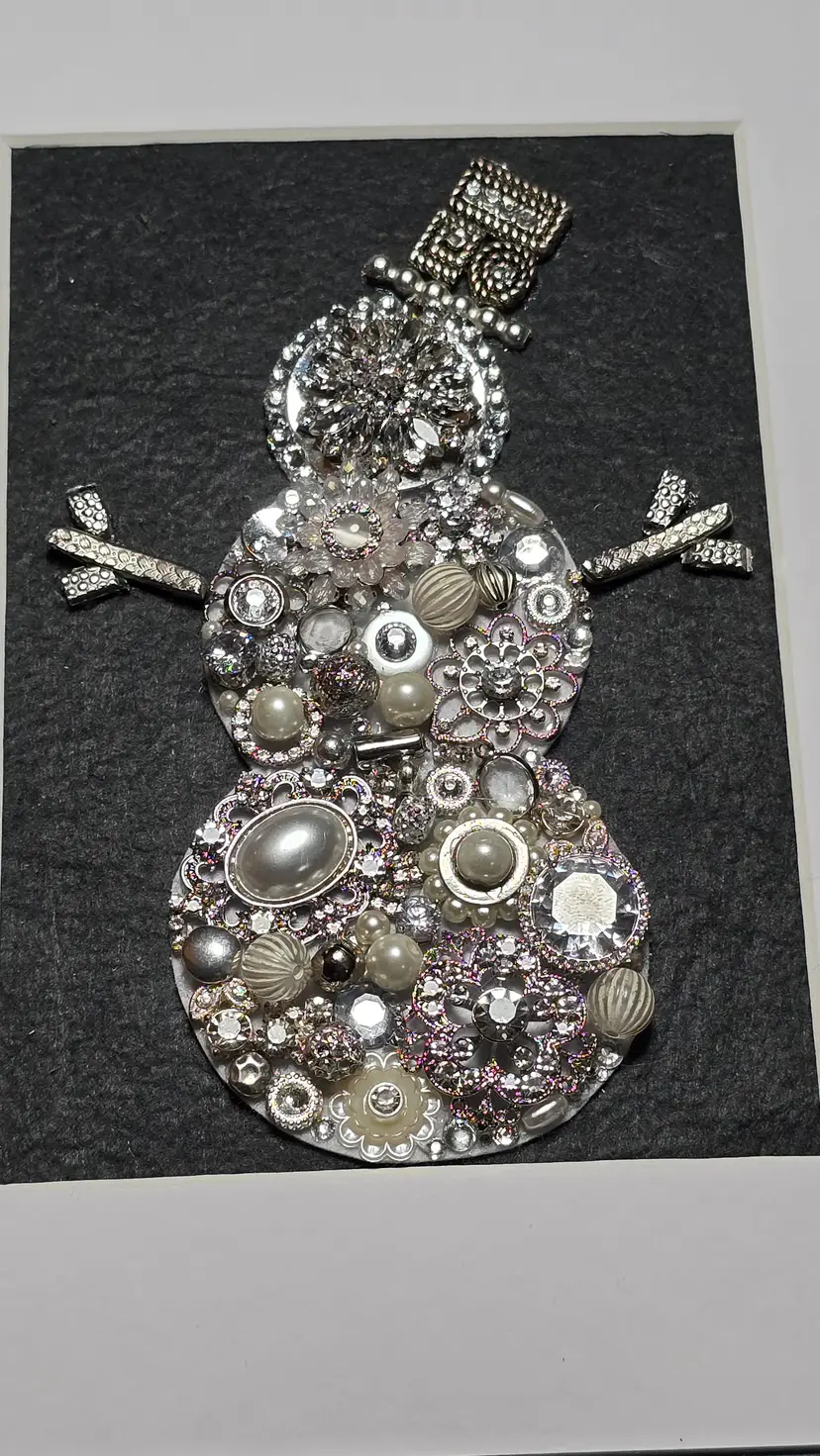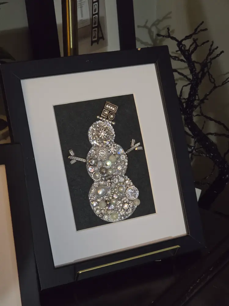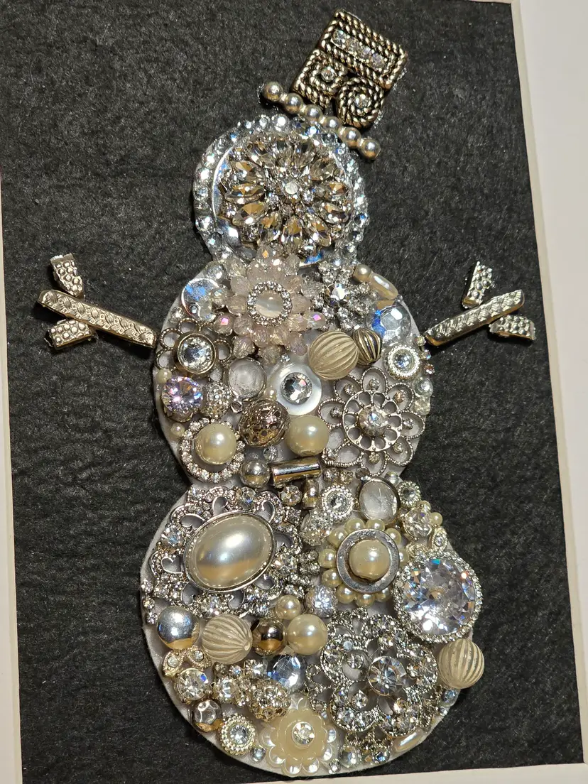 This one-of-a-kind winter snowman art piece is handcrafted using a mix of vintage-inspired rhinestones, pearls, brooch pieces, and silver-toned jewelry elements. Each piece is carefully arranged to form a sparkling snowman with a jeweled top hat and decorative stick-style arms.