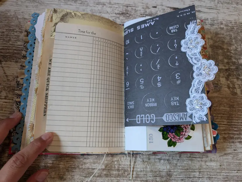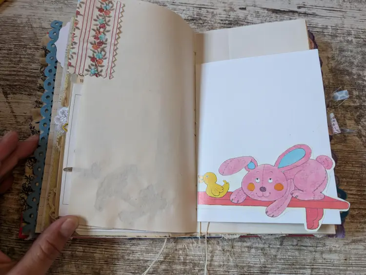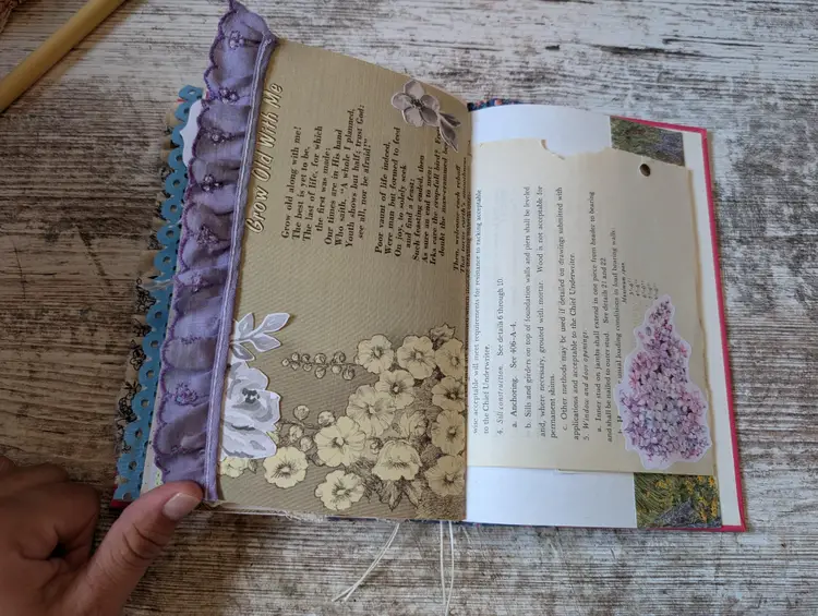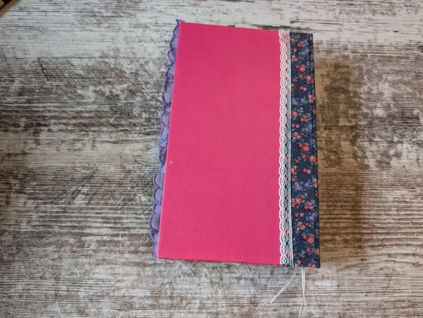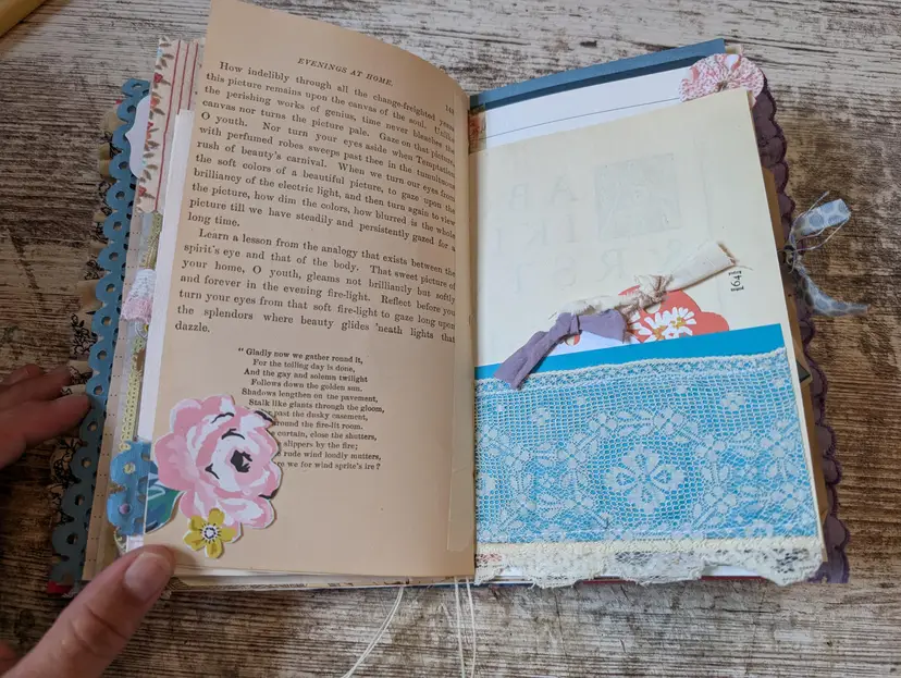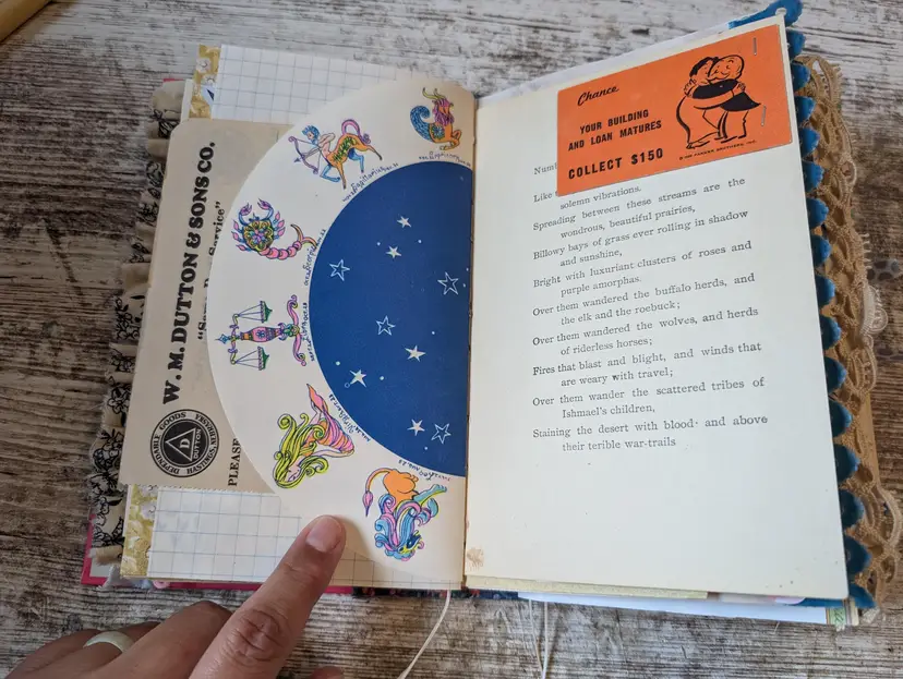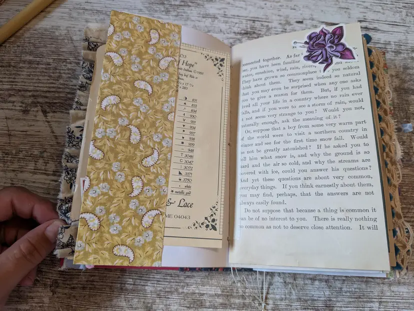 This handmade Junk Journal is made from a reader's digest book and has 2 signatures with 104 pages. It measures at 7”x4.25" with a spine of 1.5". There is no particular theme just a junk journal with vintage ephemera, book pages, and fabric material