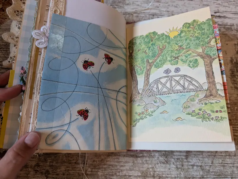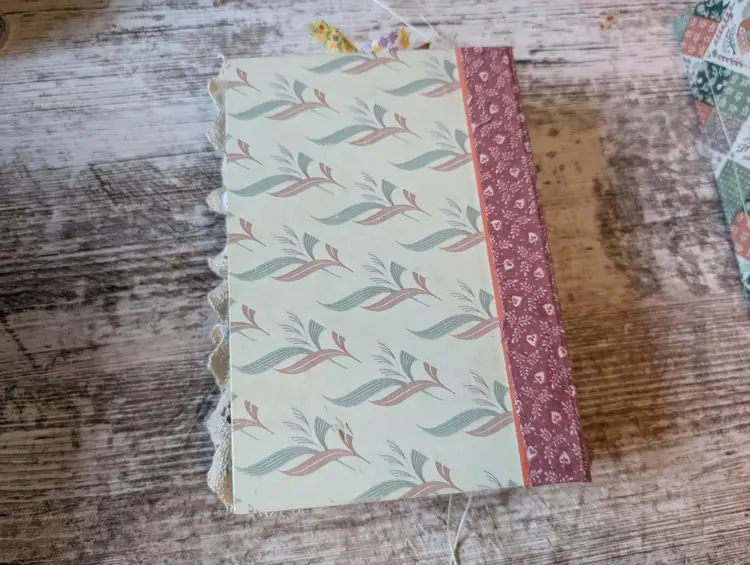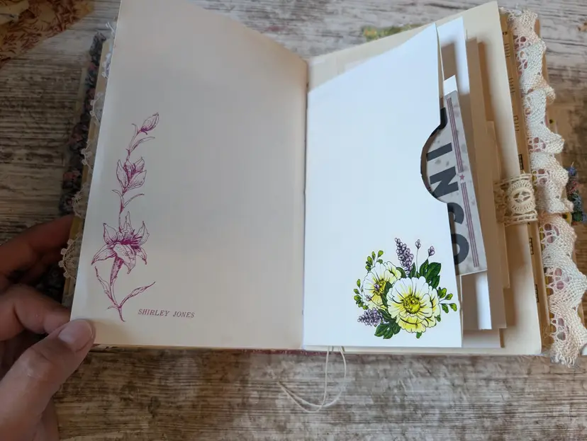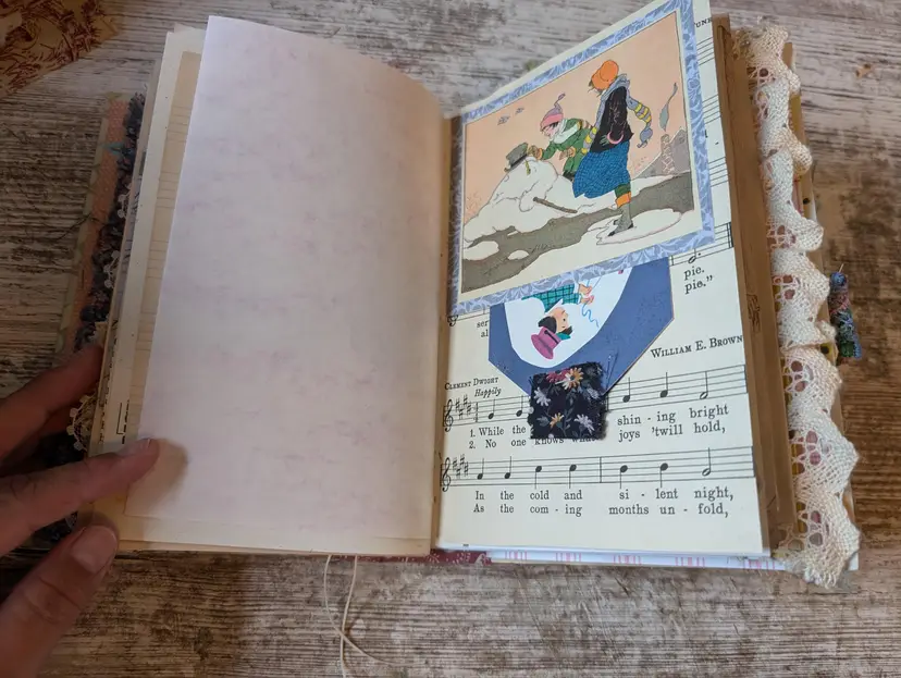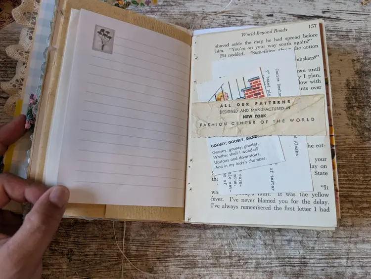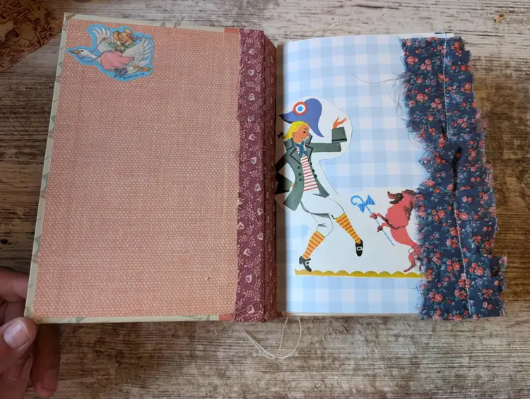 This handmade Junk Journal is made from a reader's digest book and has 2 signatures with 172 pages. It measures at 7”x5.25" with a spine of 2". There is a theme of mother goose rhymes and poems for a theme throughout this junk journal with vintage ephemera, book pages, and fabric material