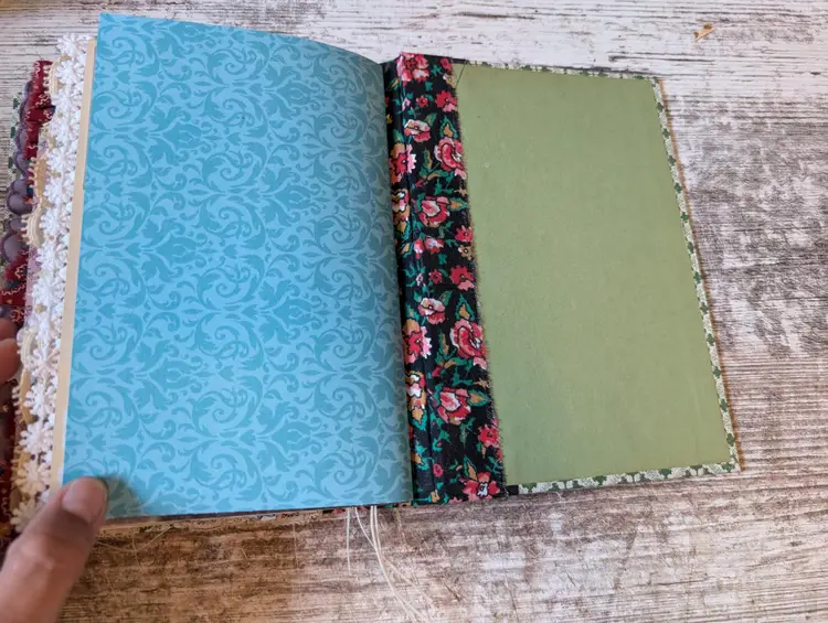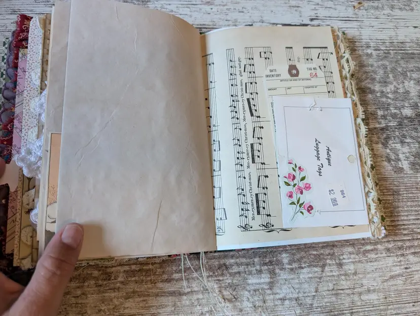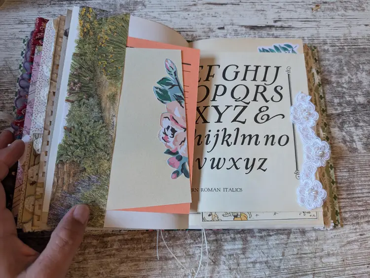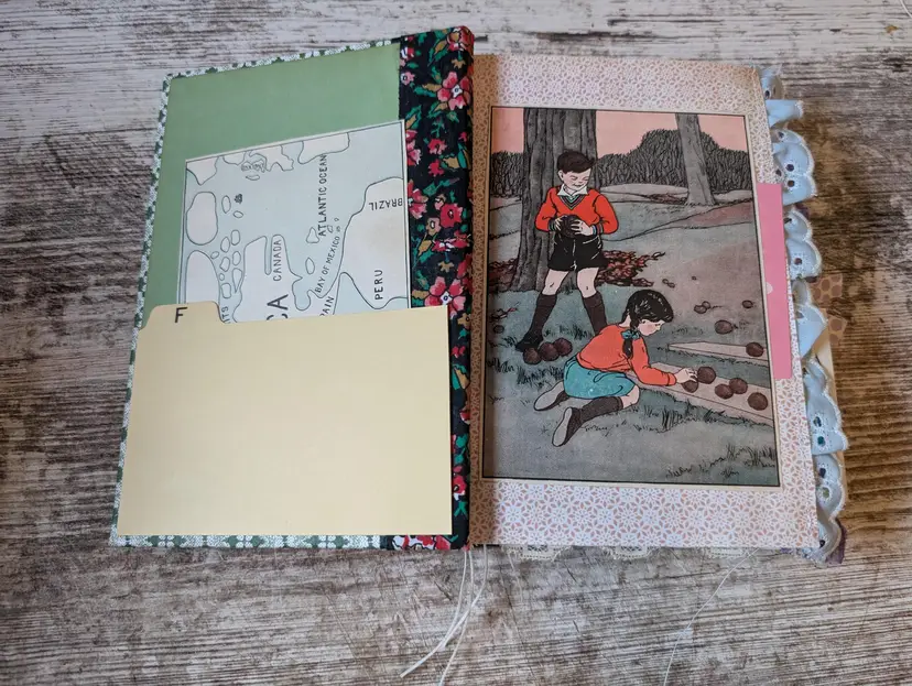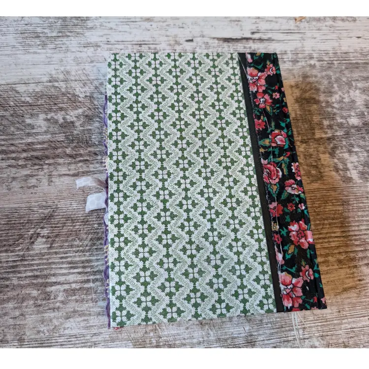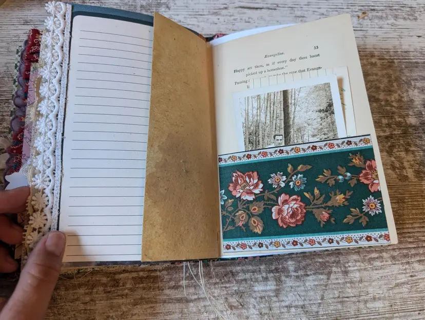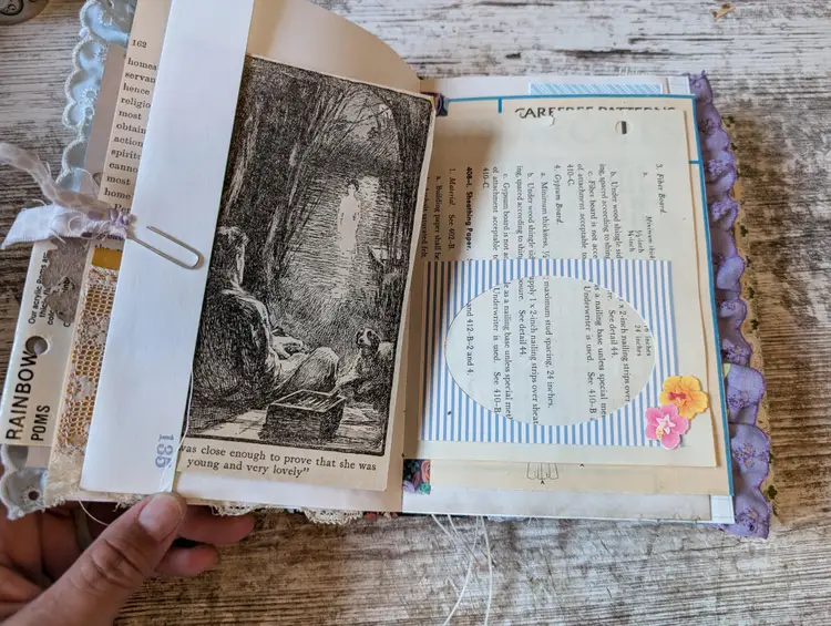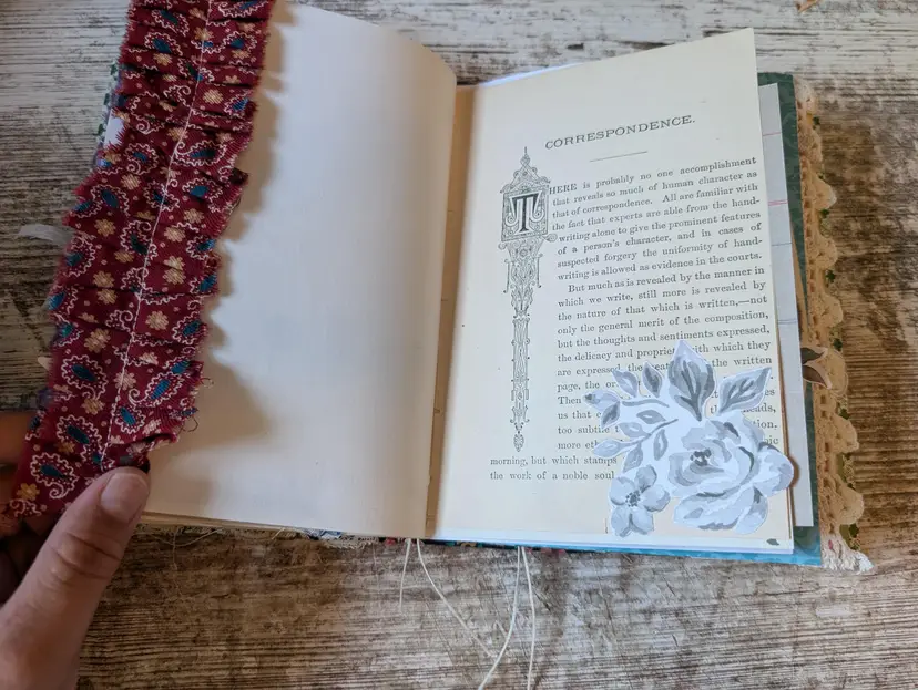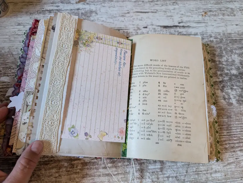 This handmade Junk Journal is made from a reader's digest book and has 2 signatures with 104 pages. It measures at 7”x5.25" with a spine of 1.5". There is no particular theme just a junk journal with vintage ephemera, book pages, and fabric material